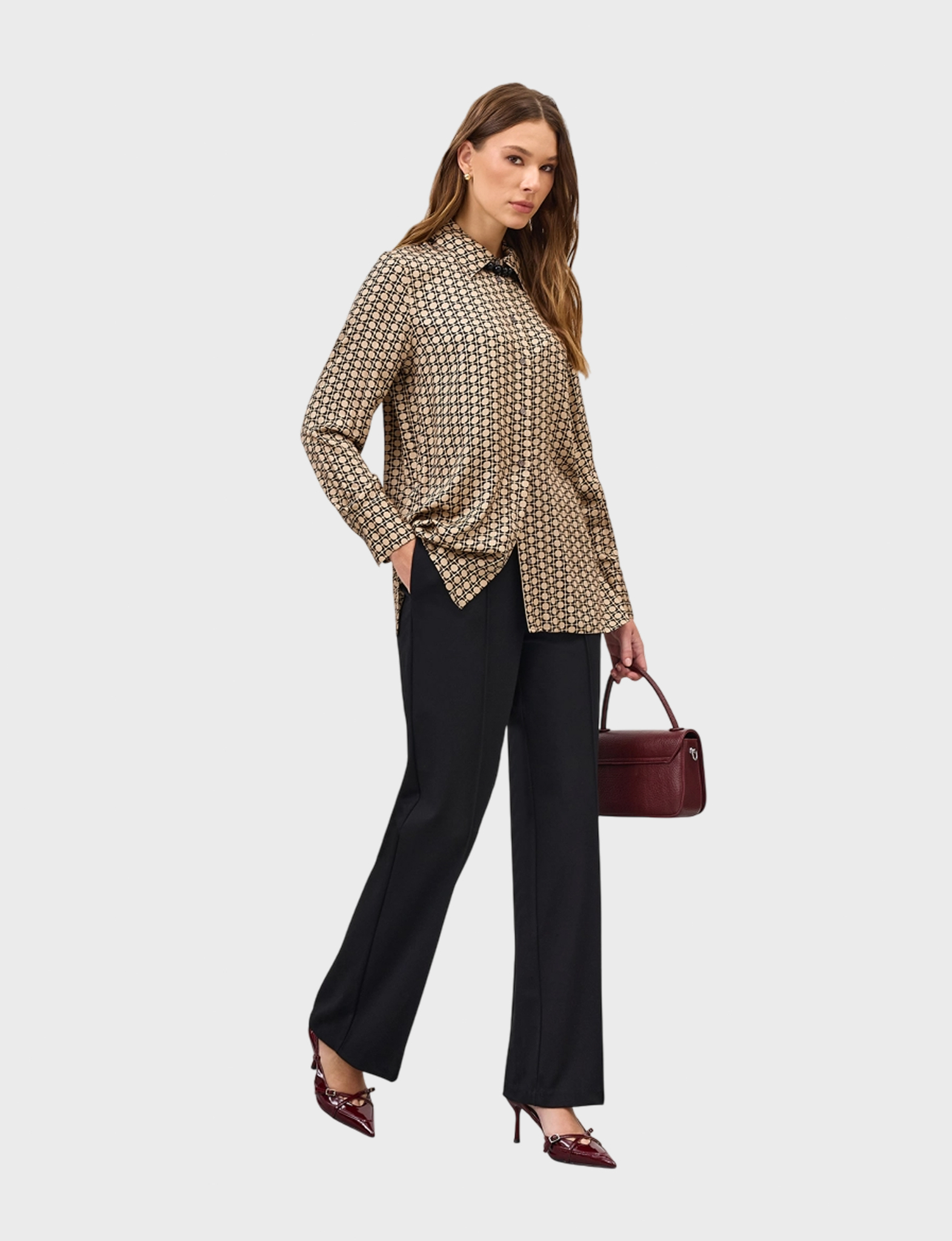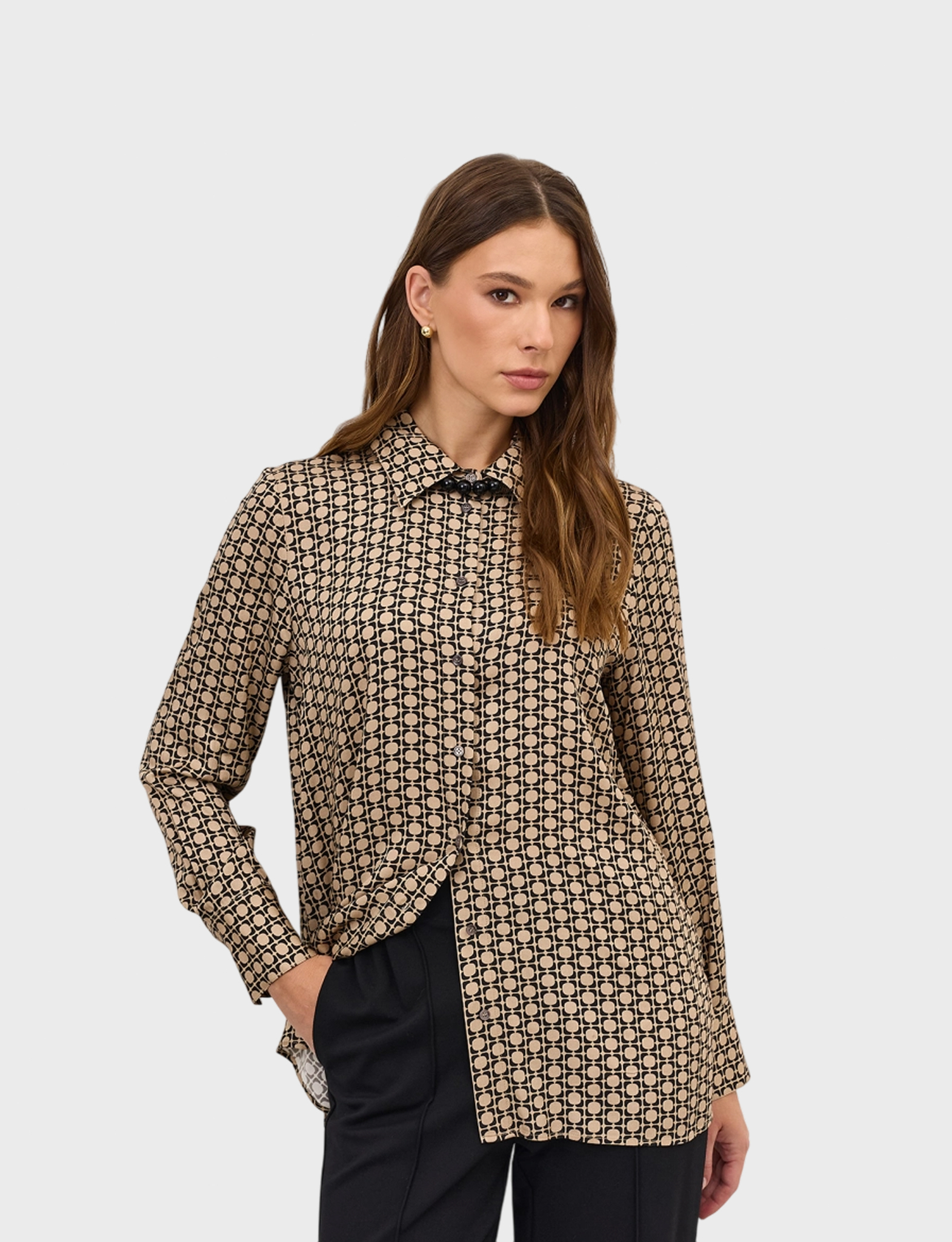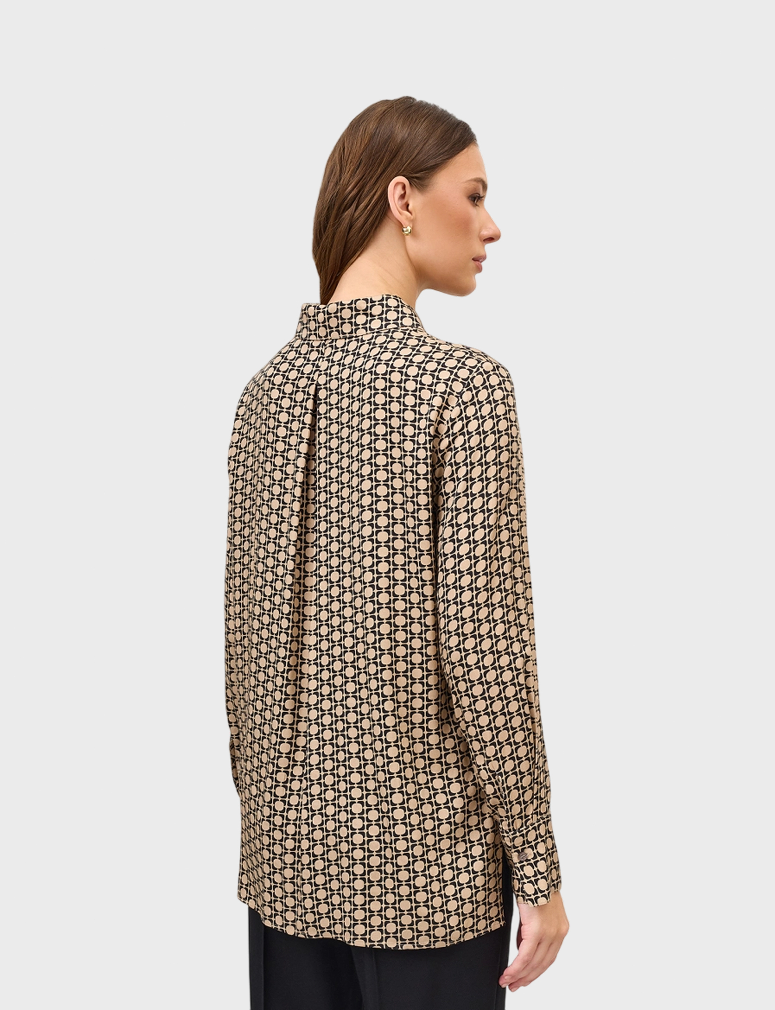 Свободная блузка с геометричным принтом из 100% сатиновой вискозы. Отложной воротник. Застежка на пуговицы. Длинные объемные рукава дополнены манжетами на пуговицах по низу.