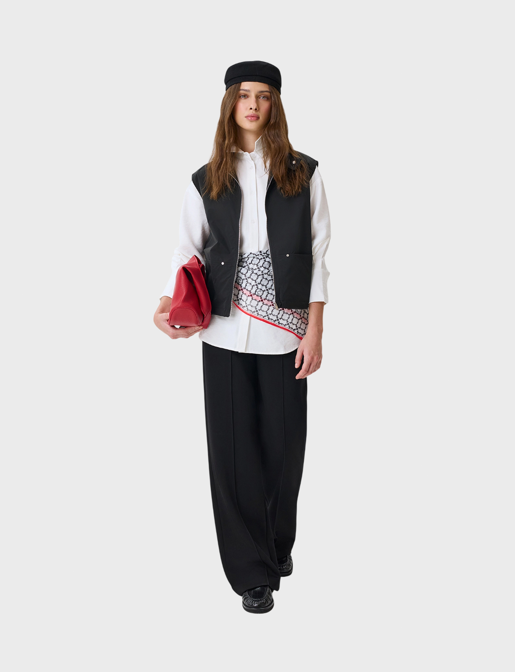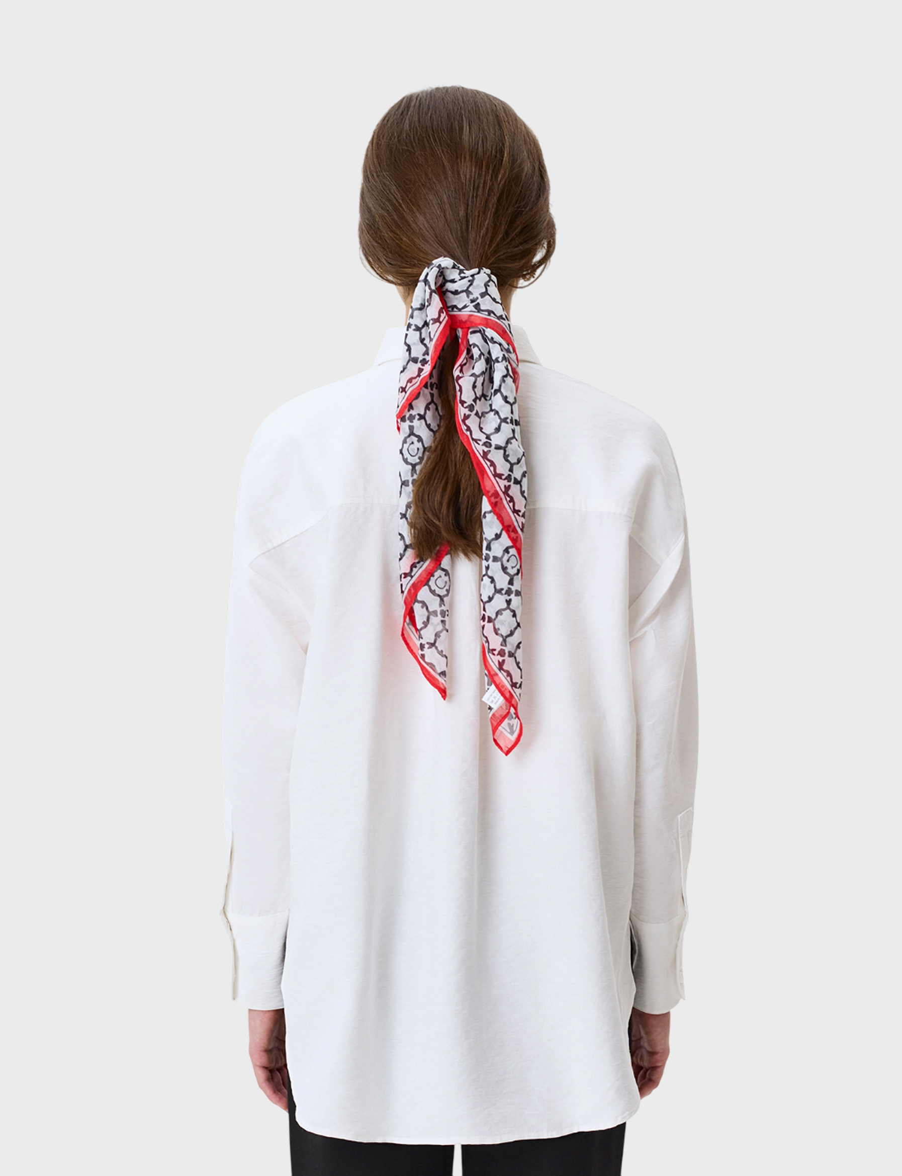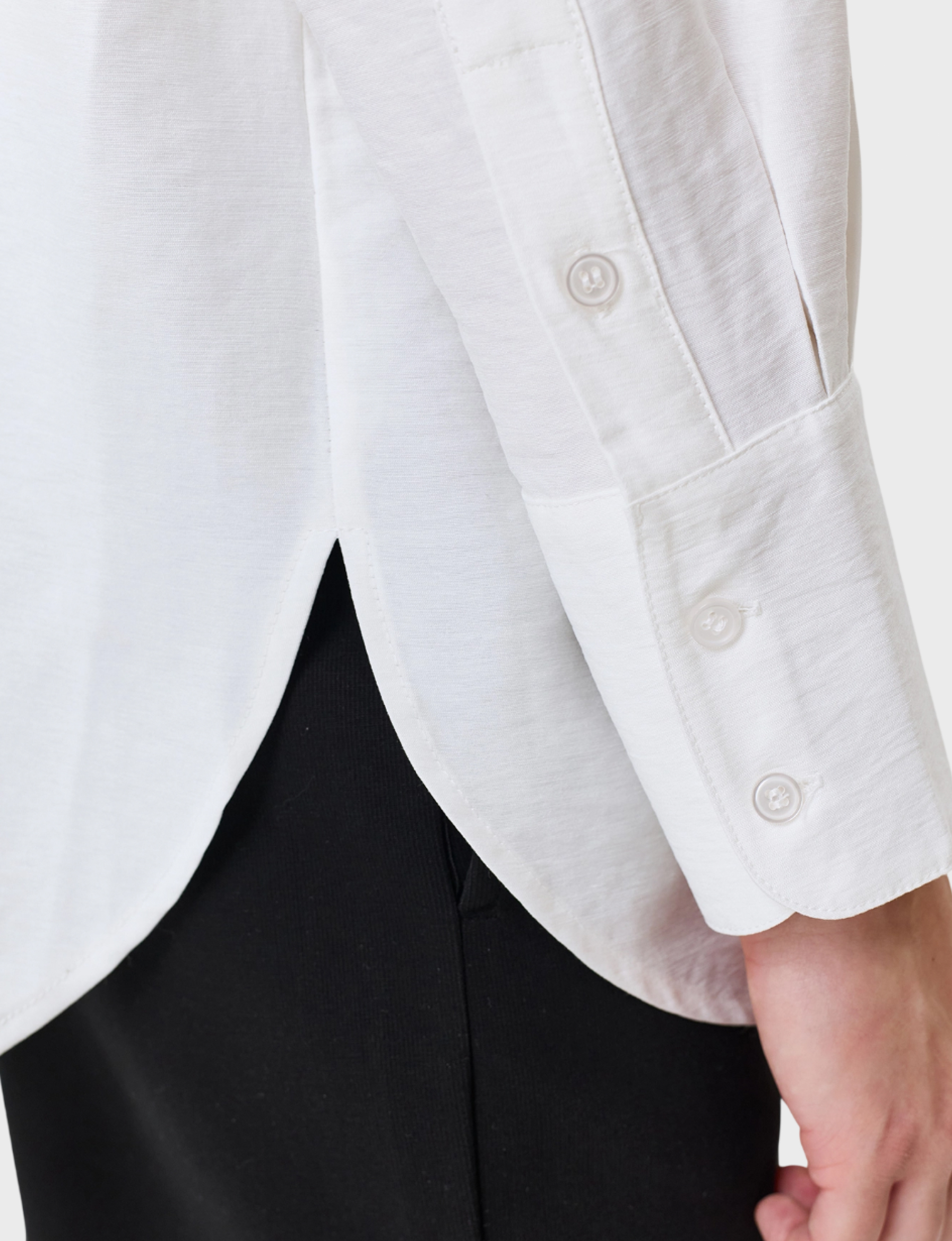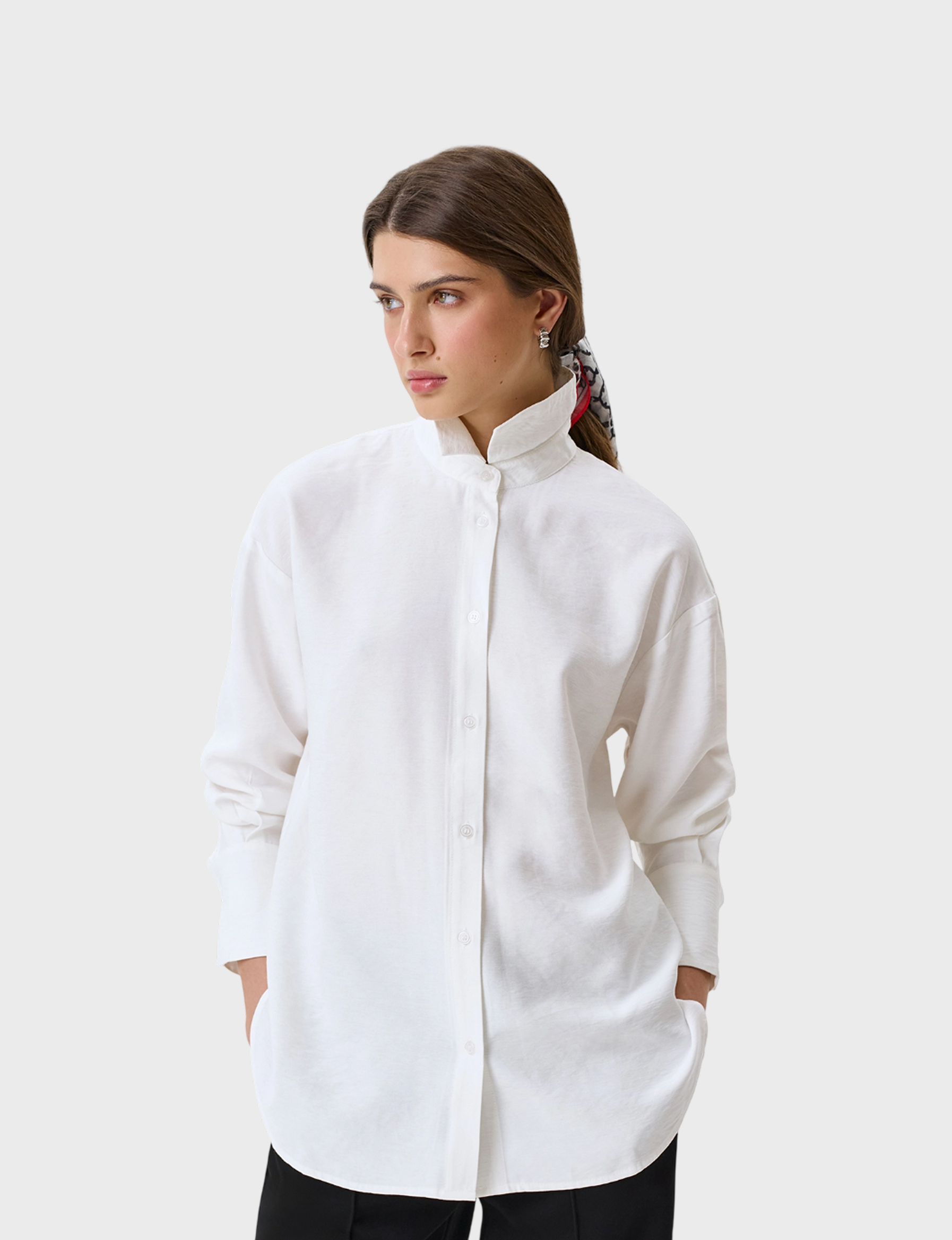 Классическая блузка из вискозы. Свободный силуэт. Отложной воротник. Застежка на пуговицы. Спущенная линия плеч. Длинные рукава дополнены манжетами на пуговицах.