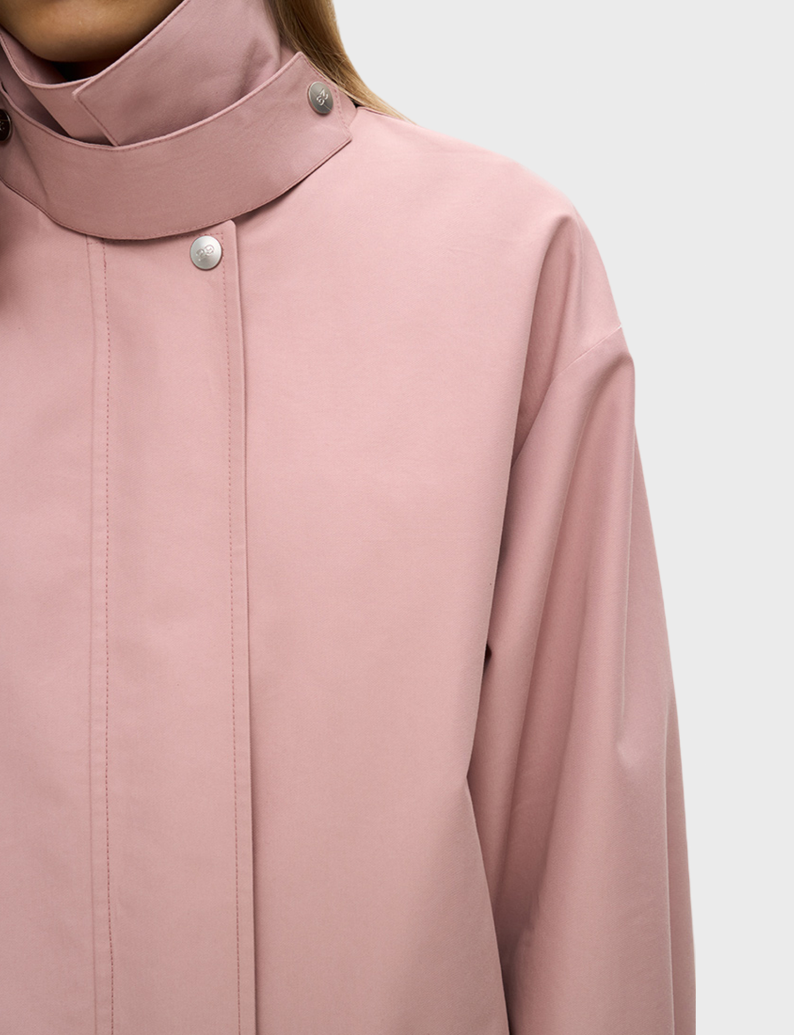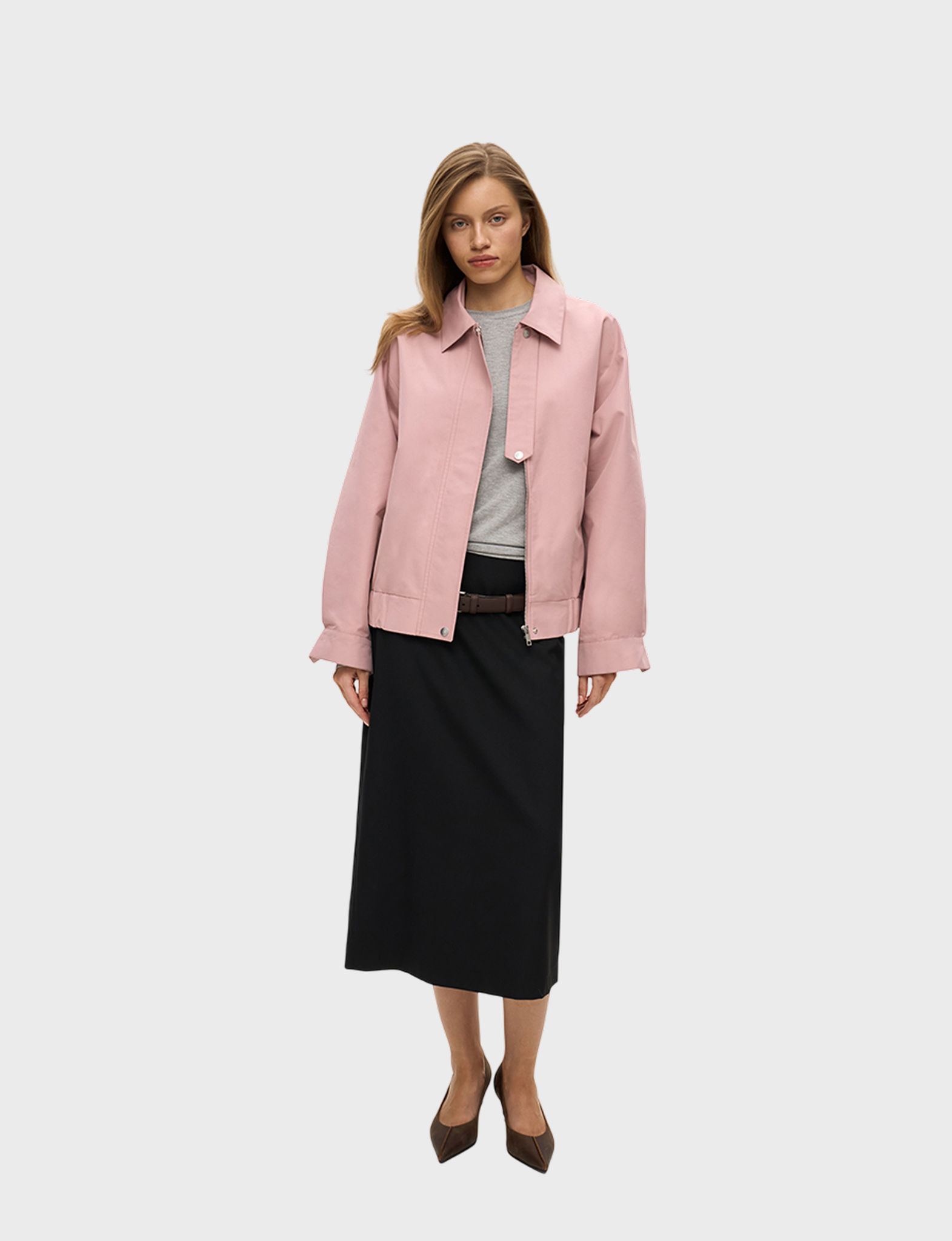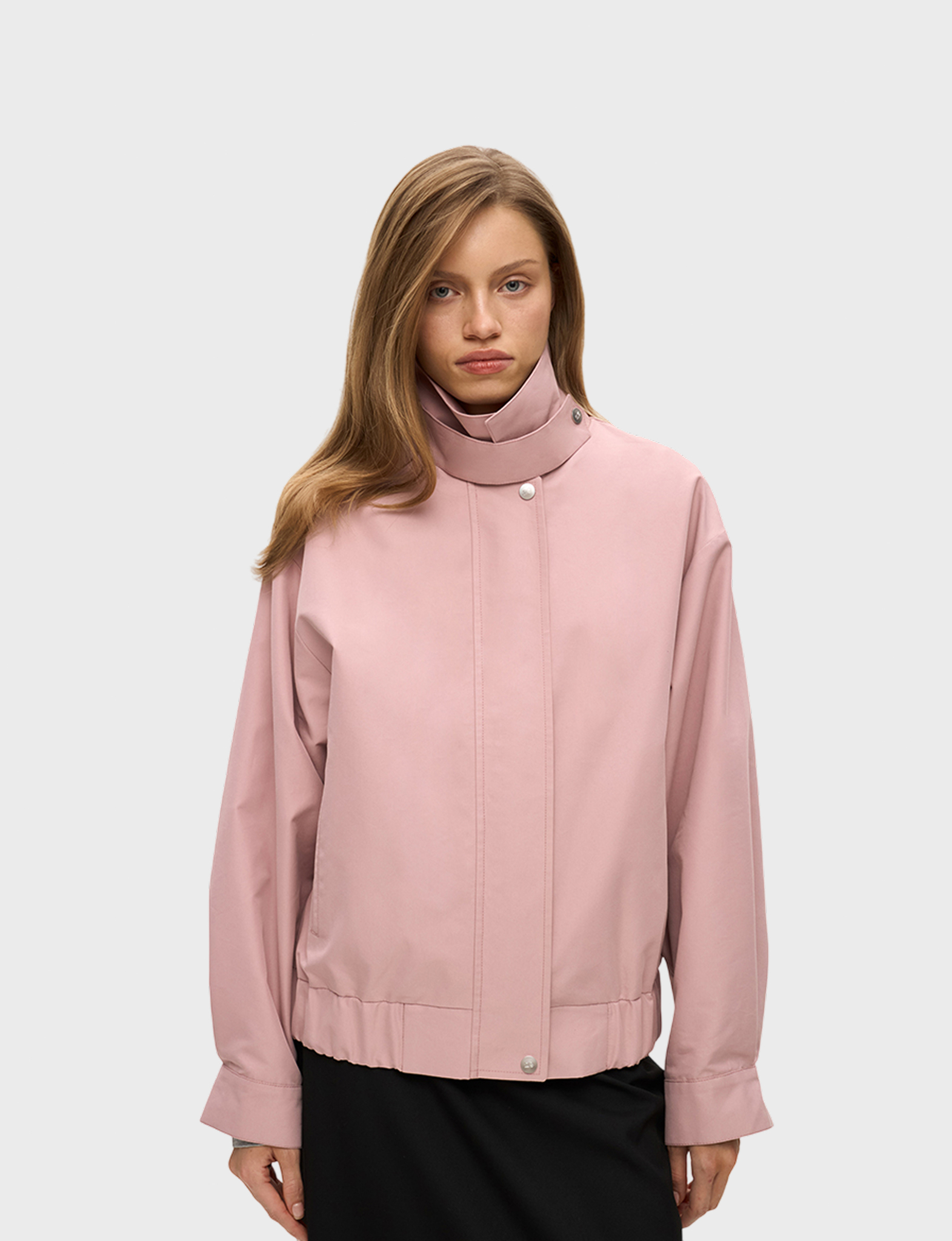 Бомбер из плащевой ткани с хлопком умеренного объема, со свободной посадкой по фигуре. Широкий отложной воротник на стойке дополнен хлястиком на кнопке, что позволяет фиксировать его в поднятом положении. Рукава прямые, умеренной ширины, на манжетах с кнопкой по низу. Застегивается куртка на молнию и планку на кнопках. По бокам модель дополнена карманами. По низу бомбер – с широкой резинкой, что служит дополнительной защитой от ветра и позволяет фиксировать низ изделия в удобном положении на фигуре. Бомбер на подкладке, ткань с водоотталкивающей пропиткой. Рекомендуемый температурный режим – от +10 °С. Сочетайте бомбер с юбкой длины миди или брюками.