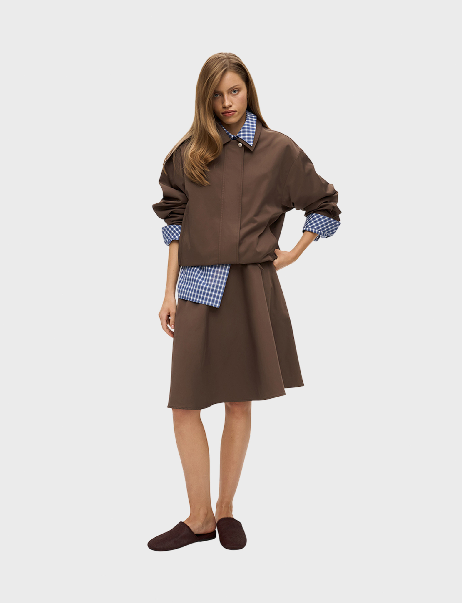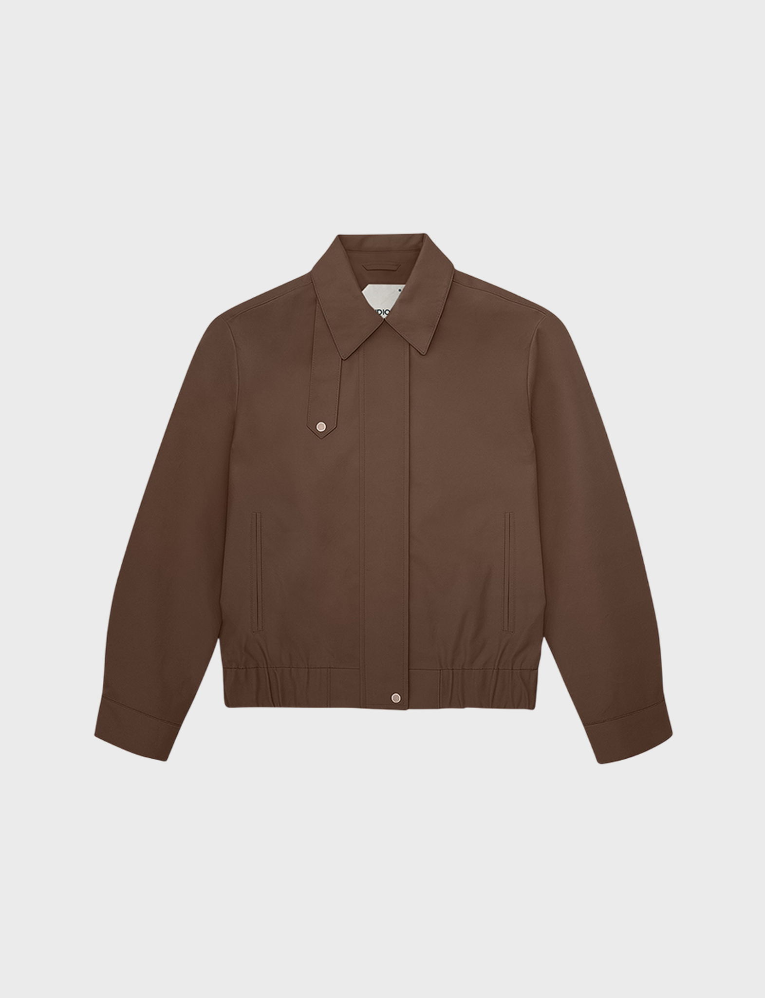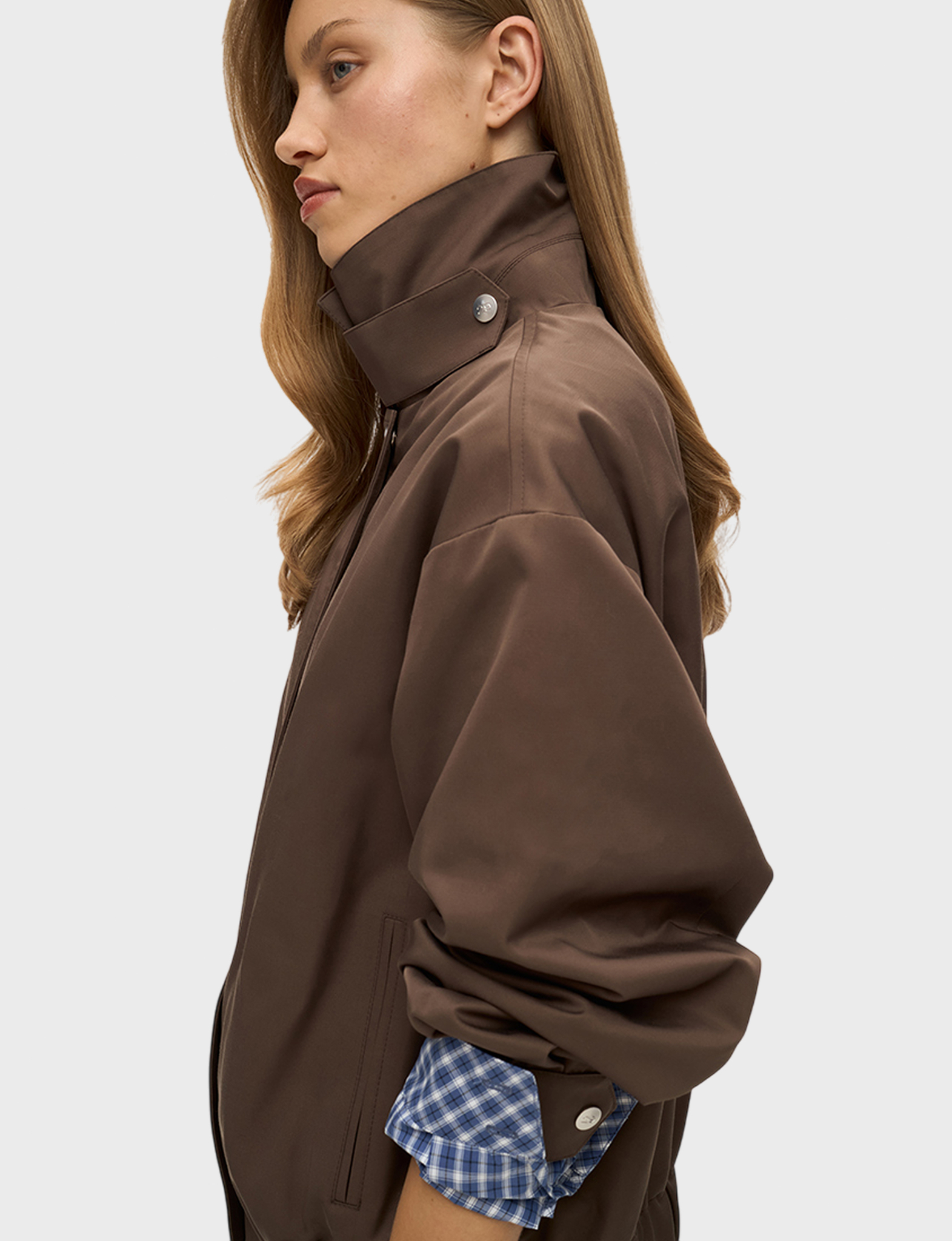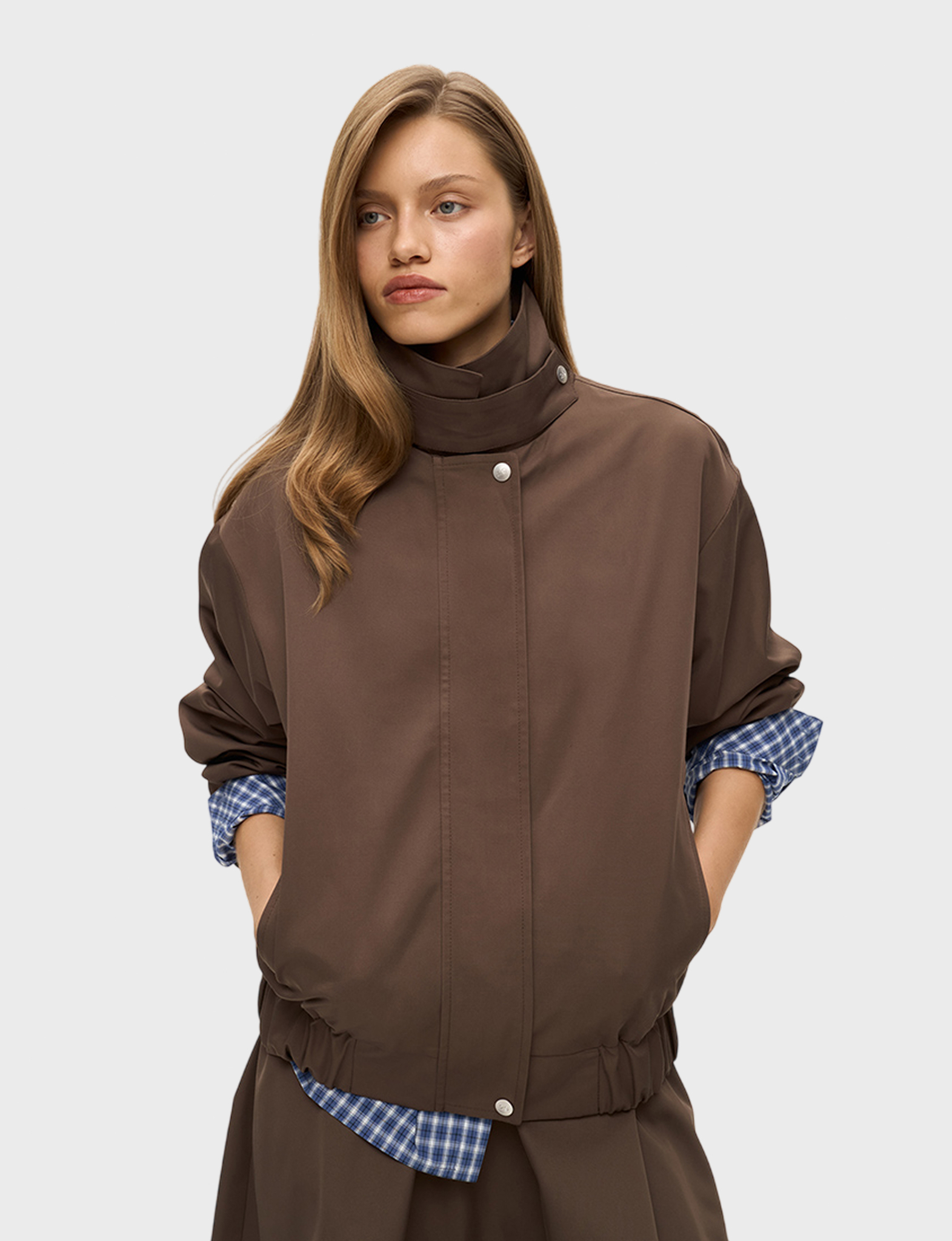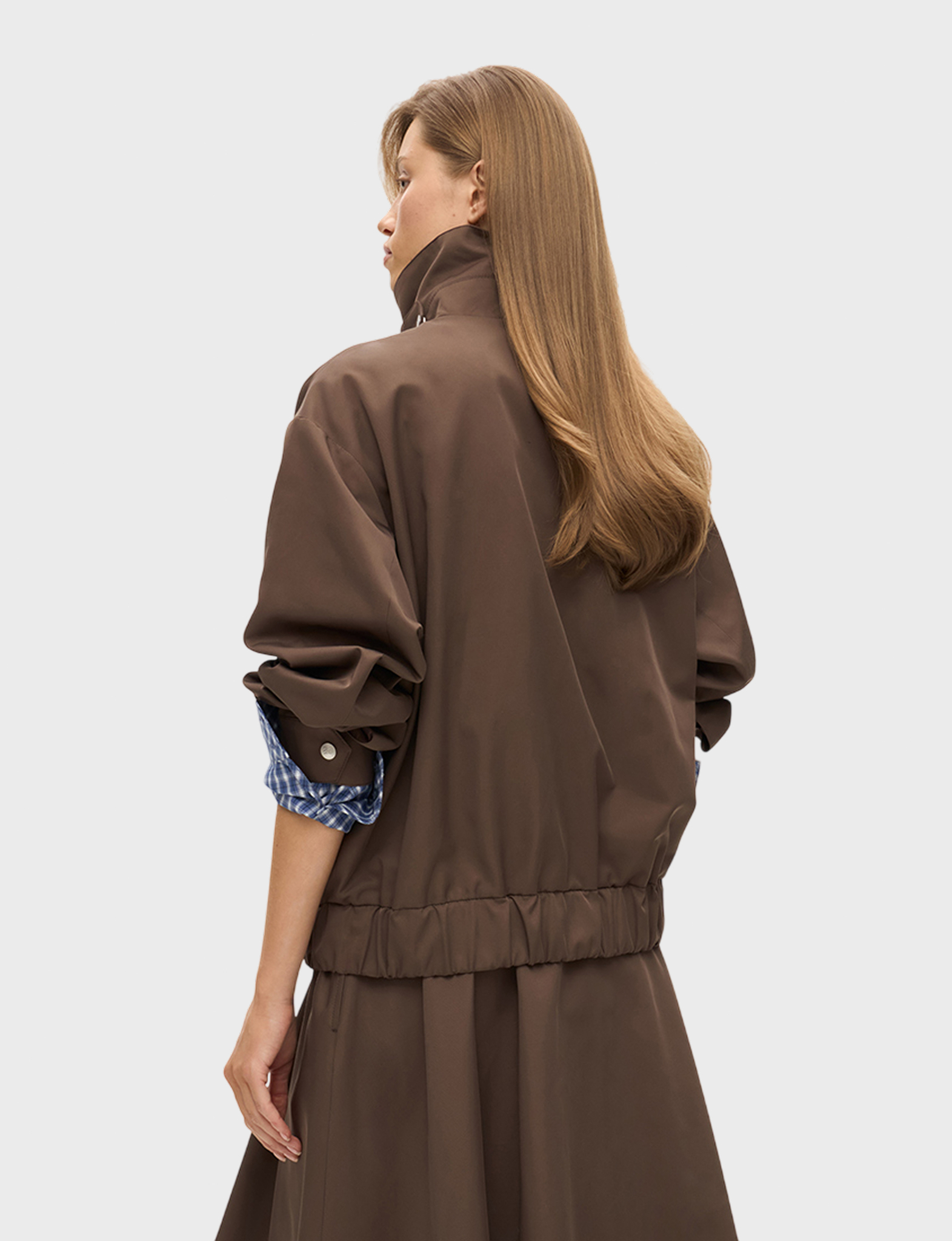 Бомбер из плащевой ткани с хлопком умеренного объема, со свободной посадкой по фигуре. Широкий отложной воротник на стойке дополнен хлястиком на кнопке, что позволяет фиксировать его в поднятом положении. Рукава прямые, умеренной ширины, на манжетах с кнопкой по низу. Застегивается куртка на молнию и планку на кнопках. По бокам модель дополнена карманами. По низу бомбер – с широкой резинкой, что служит дополнительной защитой от ветра и позволяет фиксировать низ изделия в удобном положении на фигуре. Бомбер на подкладке, ткань с водоотталкивающей пропиткой. Рекомендуемый температурный режим – от +10 °С. Сочетайте бомбер с юбкой длины миди или брюками.