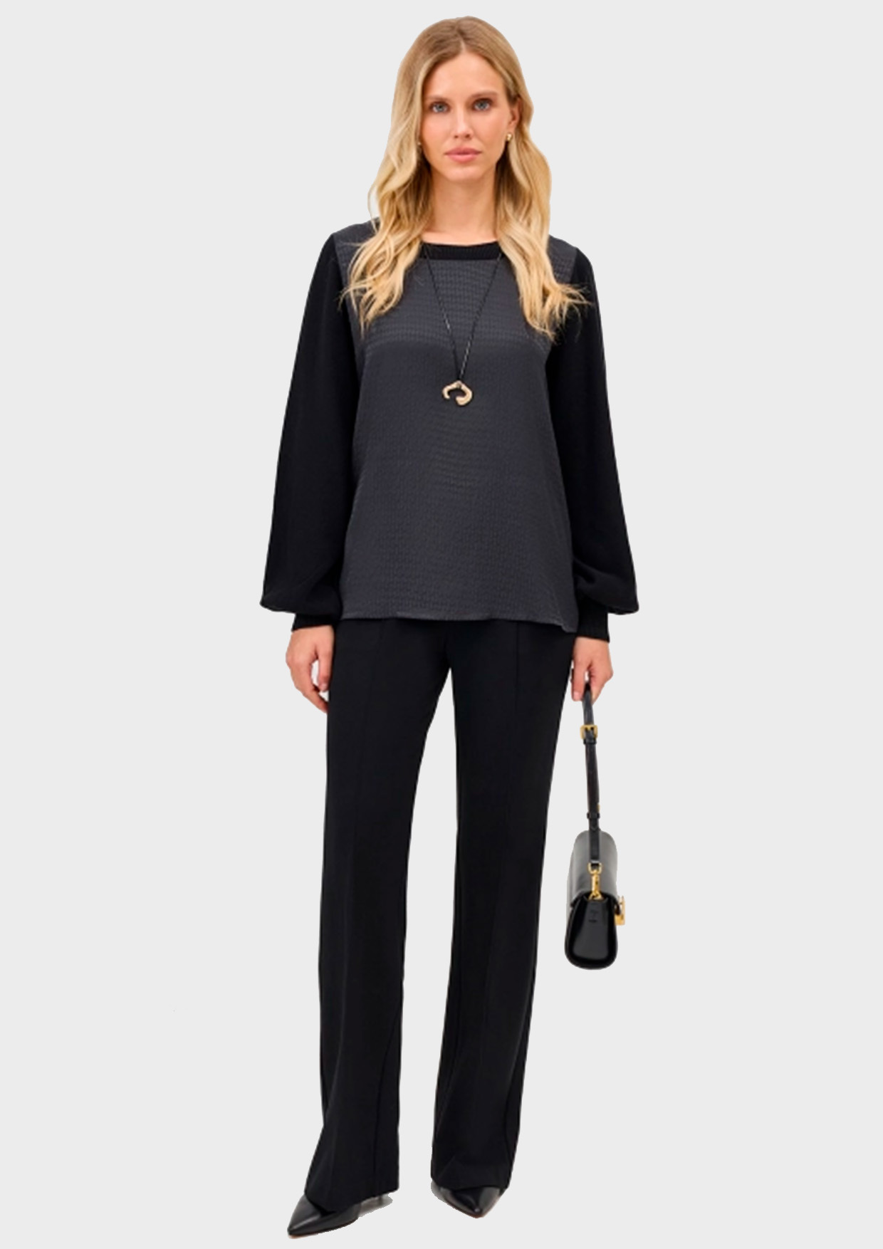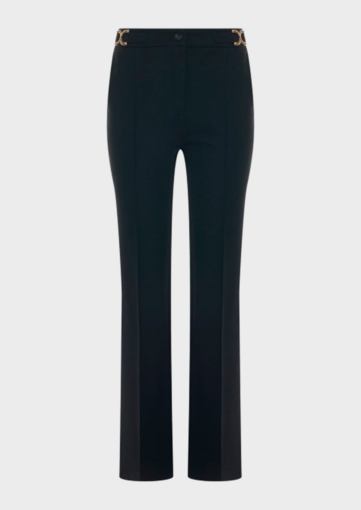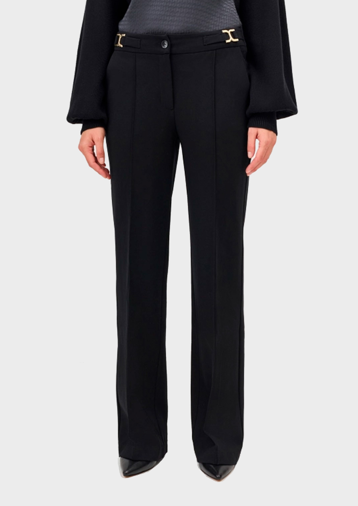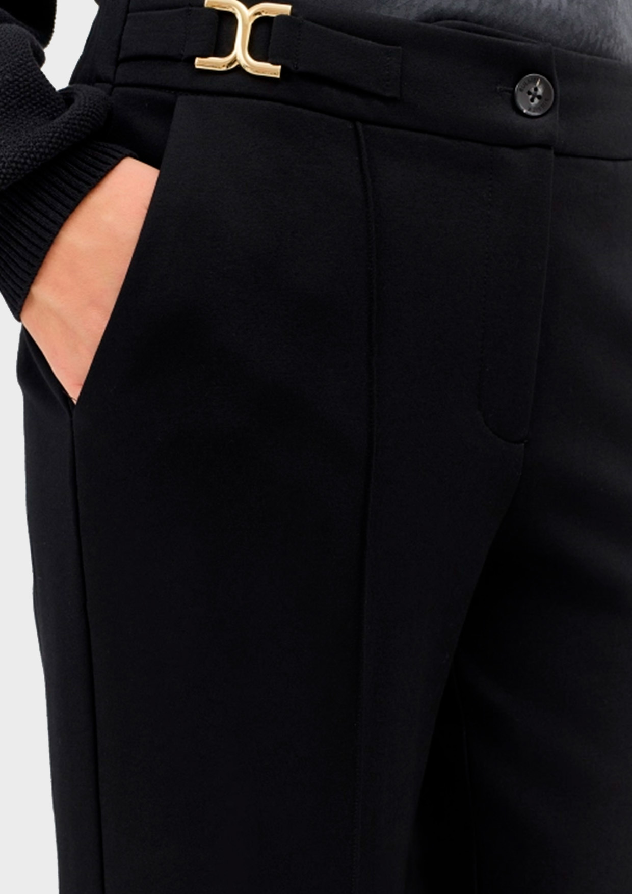 Брюки из джерси с акцентными декоративными пряжками на поясе. Прямой силуэт. Застежка на молнию и пуговицу. Боковые карманы в швах. Дополнены застроченными стрелками.