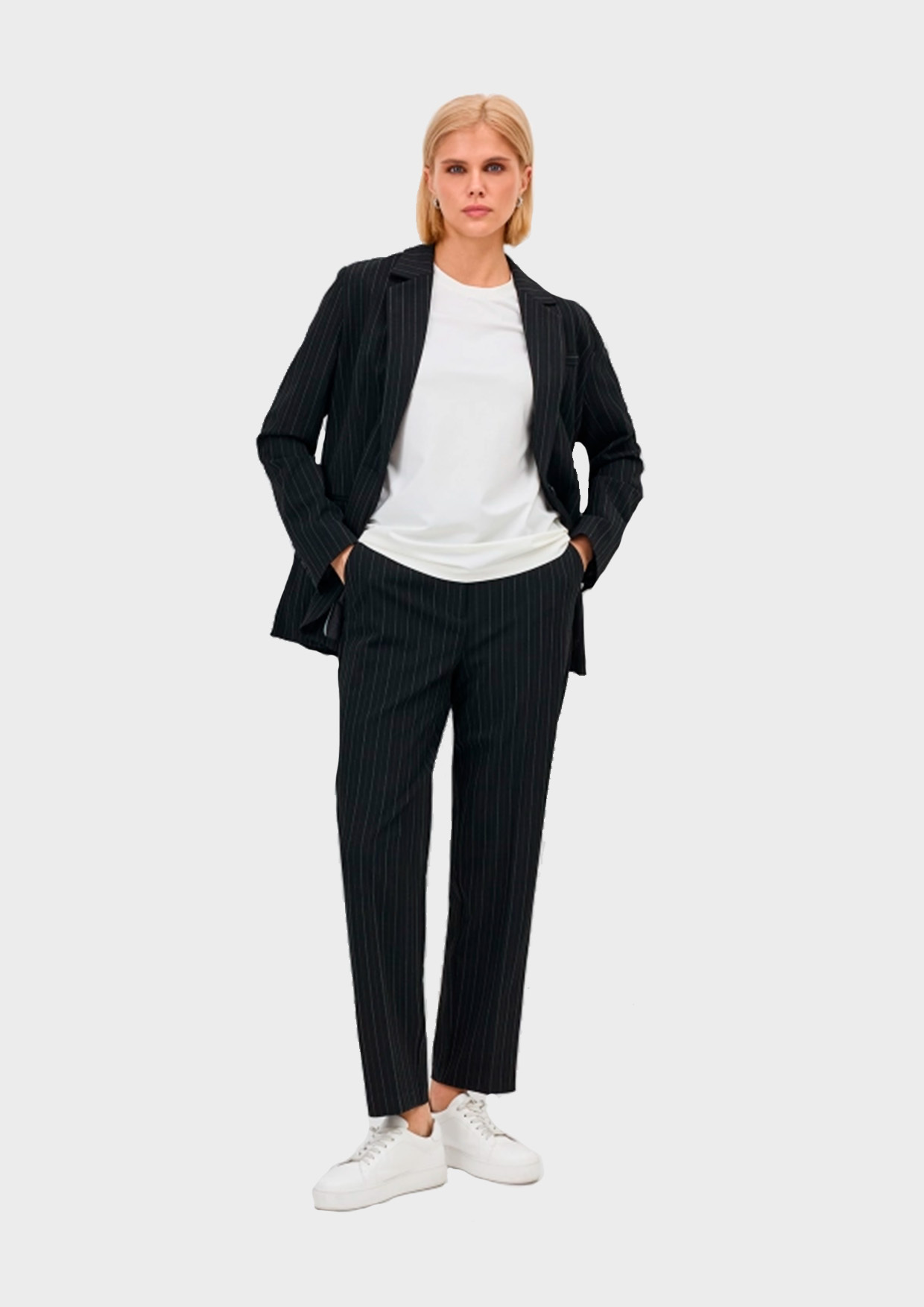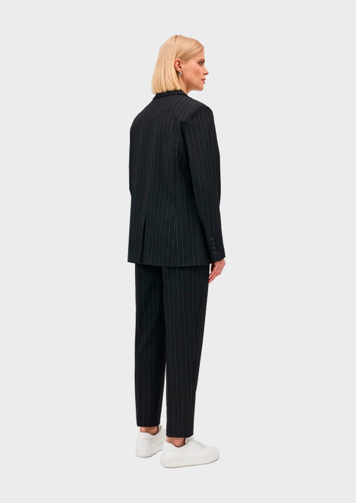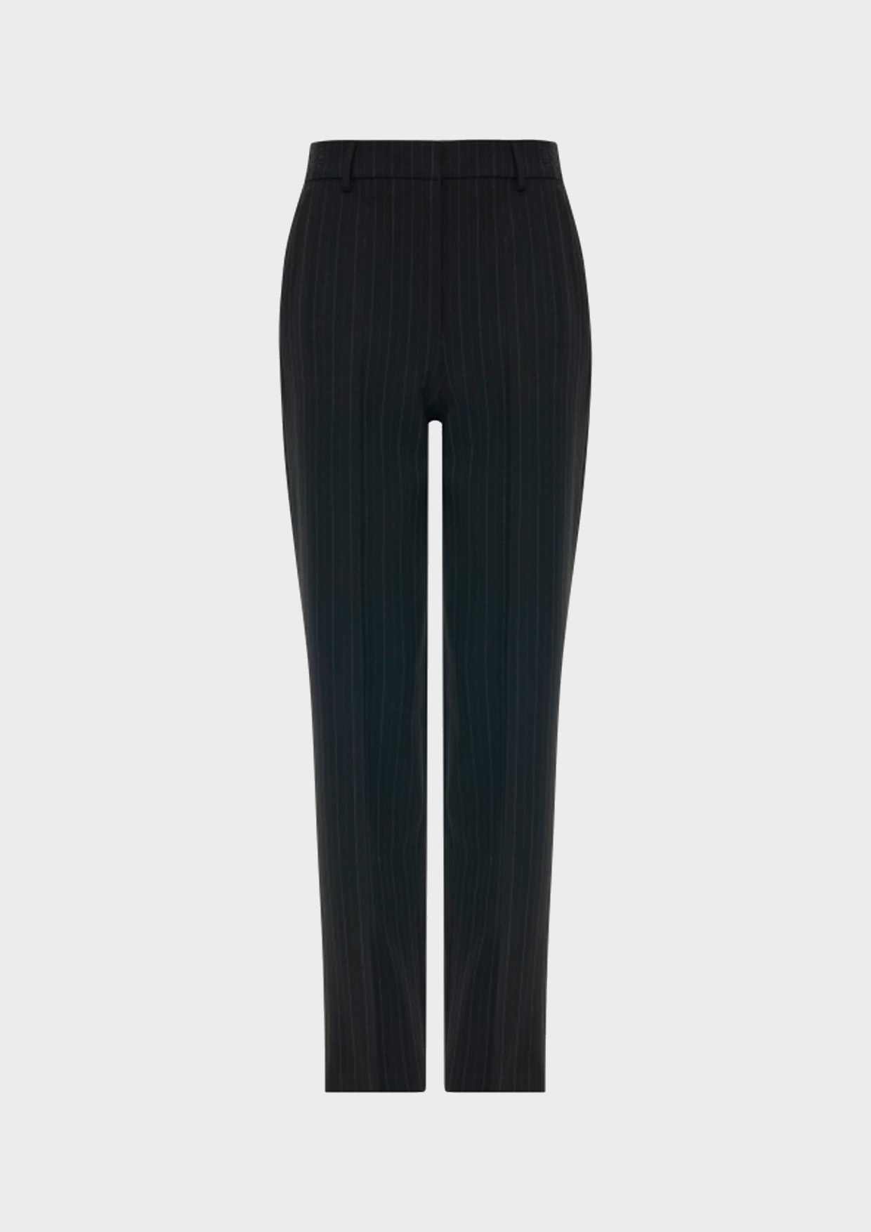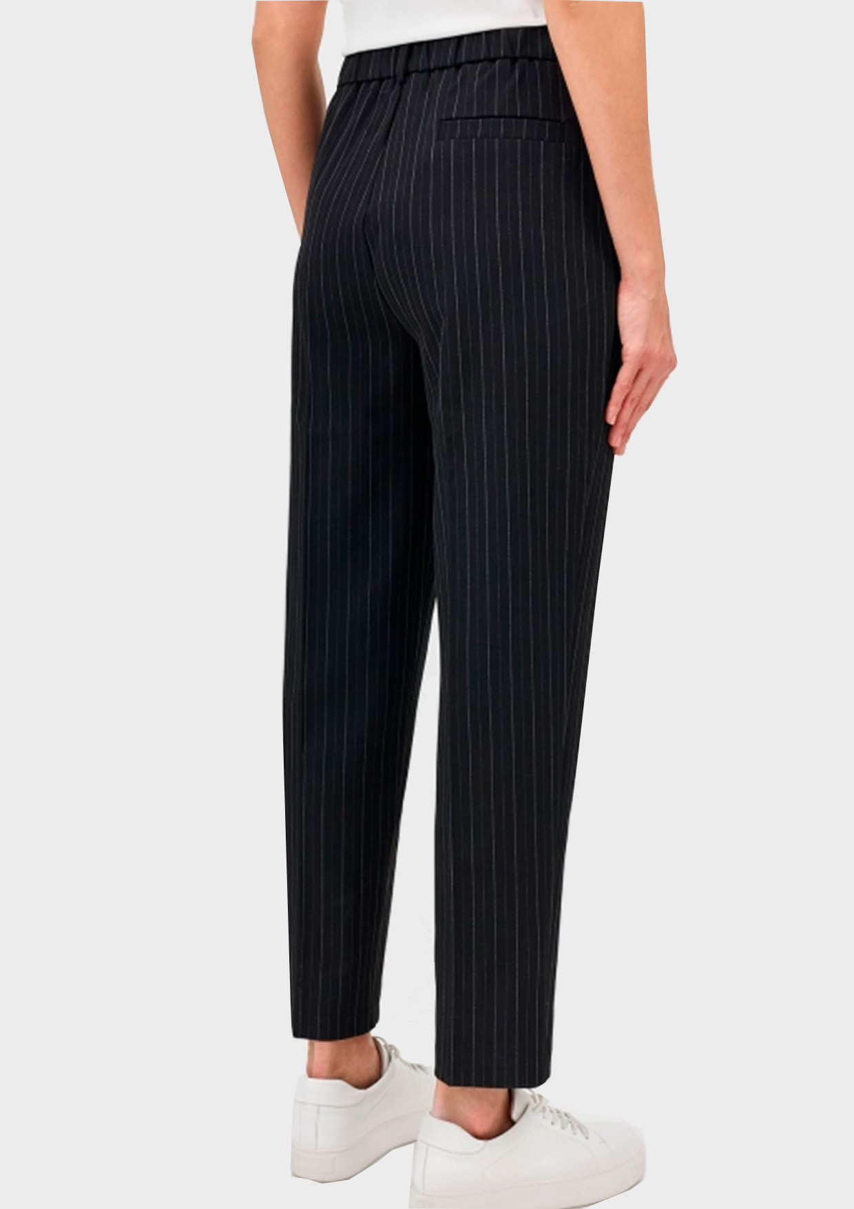 Классические брюки в тонкую игольную полоску. Прямой силуэт немного заужен к низу. Застежка на молнию и крючок. Резинка по линии талии на спинке. Мягкие стрелки.