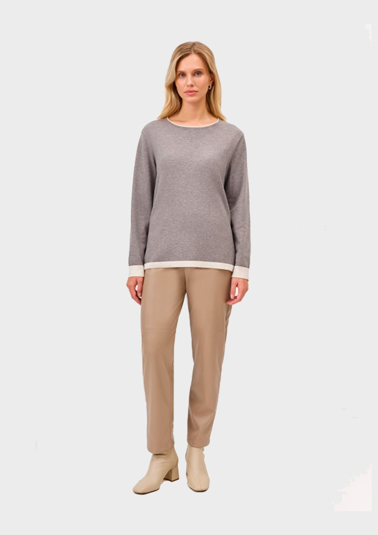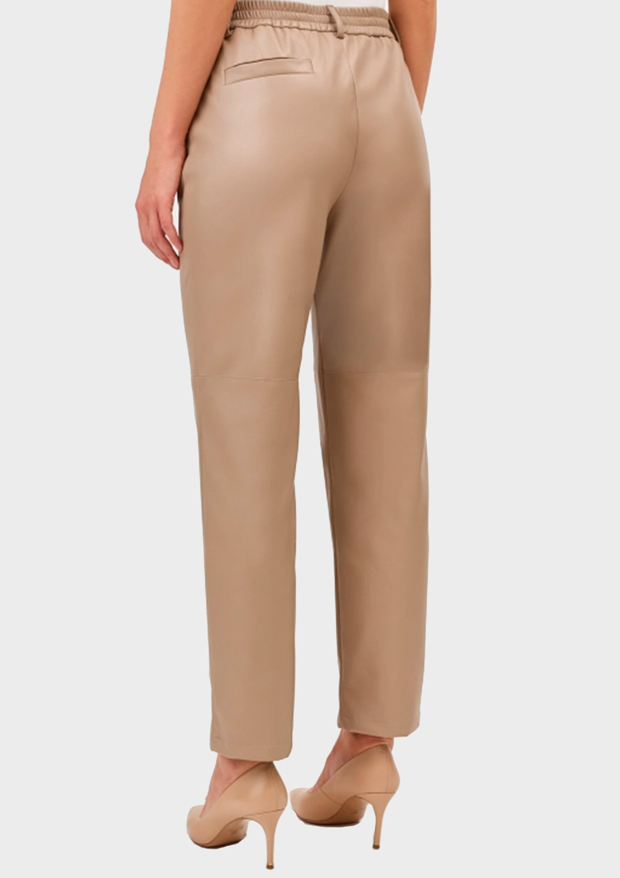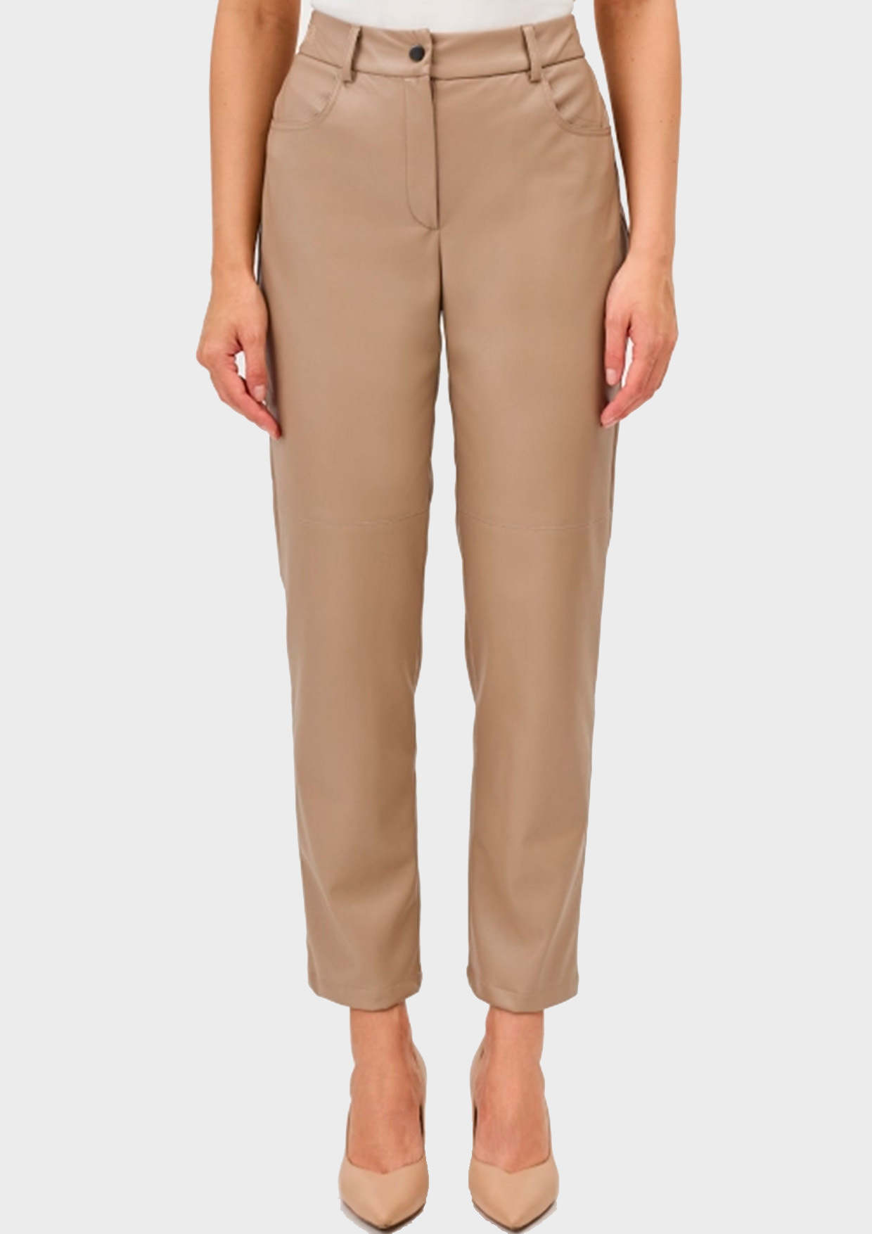 Брюки из мягкой экокожи. Прямой силуэт заужен к низу. Застежка на молнию и пуговицу. Резинка сзади по линии талии. Боковые карманы в швах.