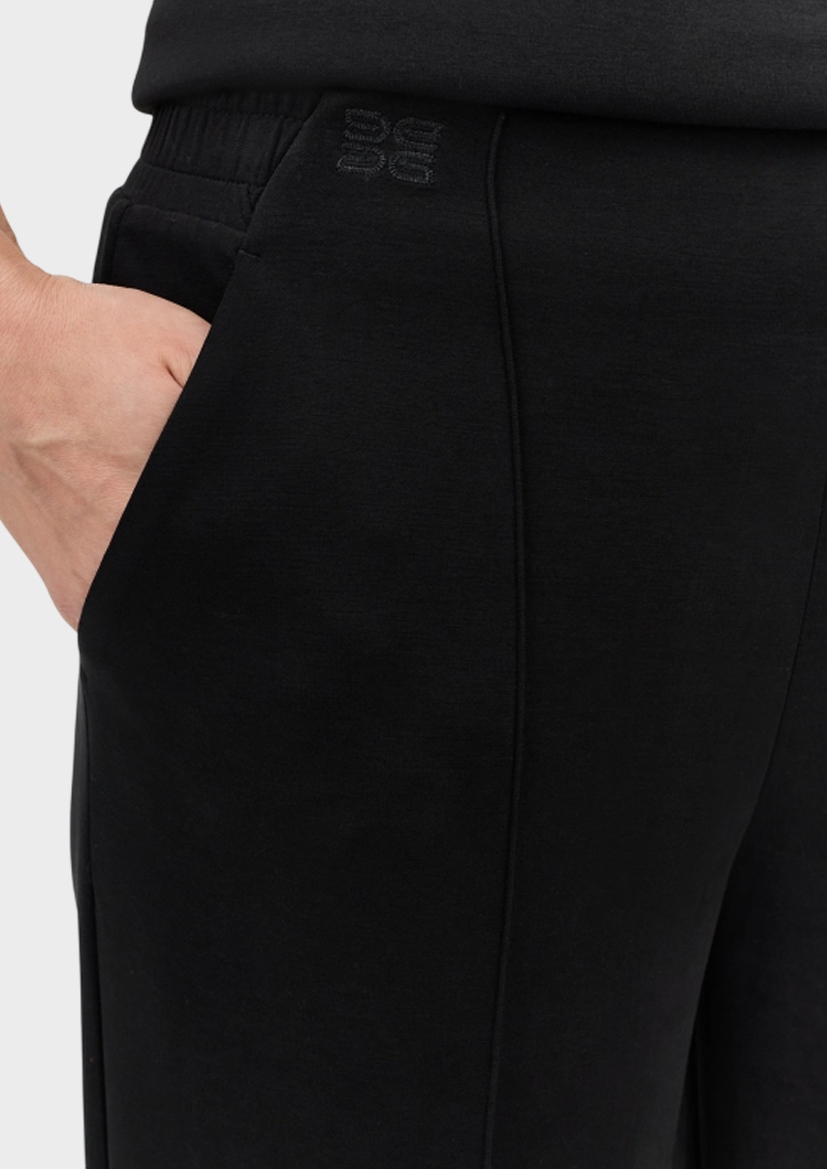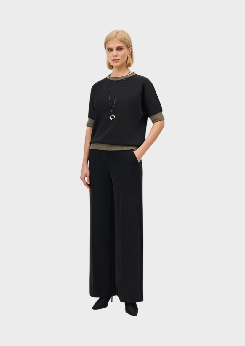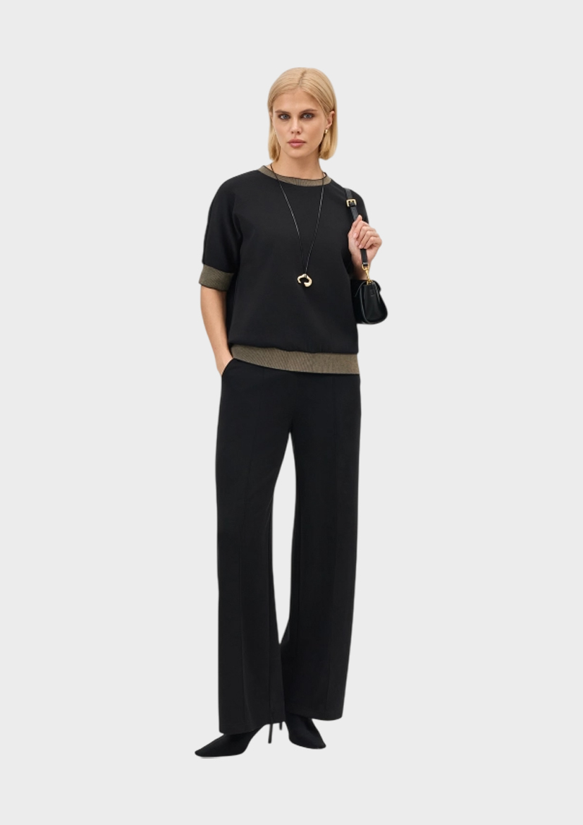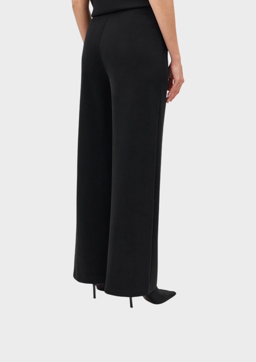 Широкие струящиеся брюки из мягкого трикотажа. Прямой силуэт. Боковые карманы в швах. Резинка по линии талии сзади. Дополнены застроченными стрелками. В составе модал.