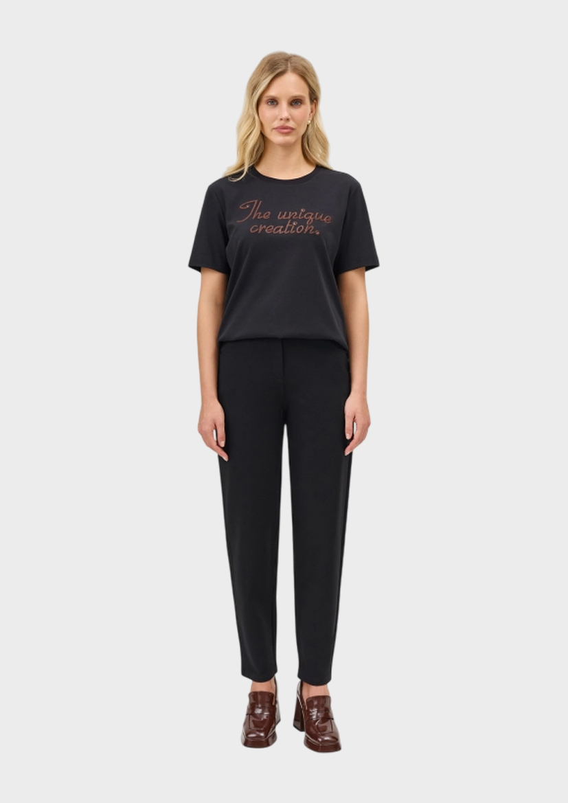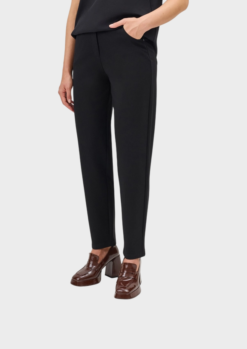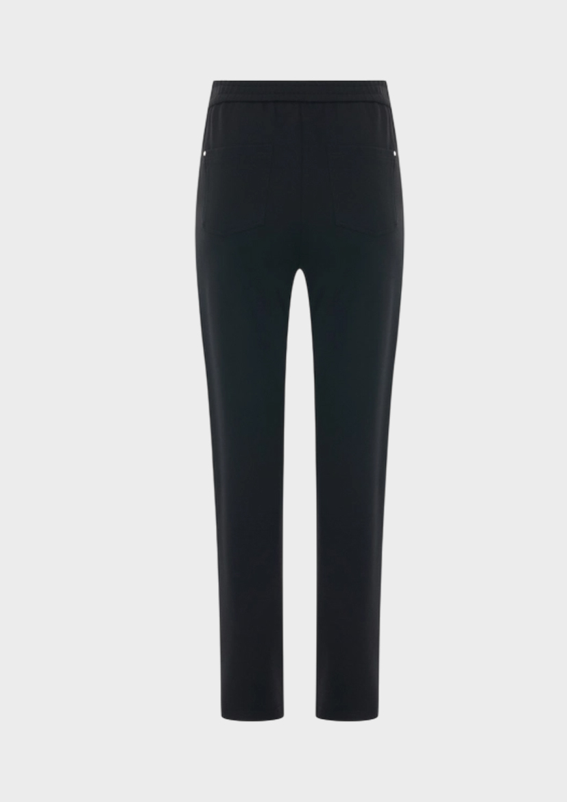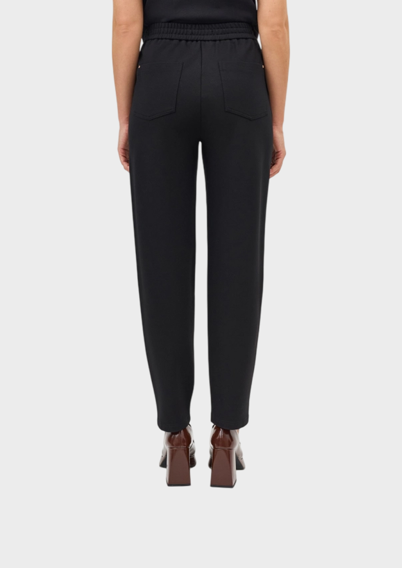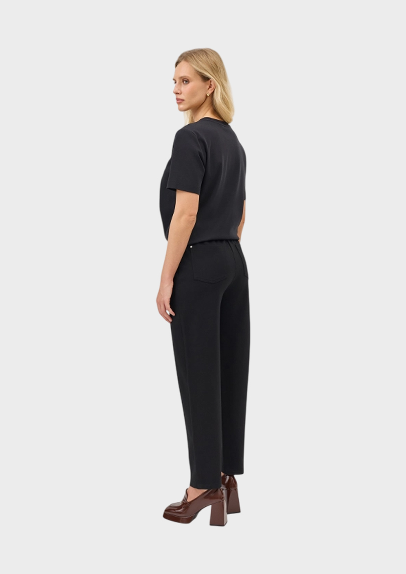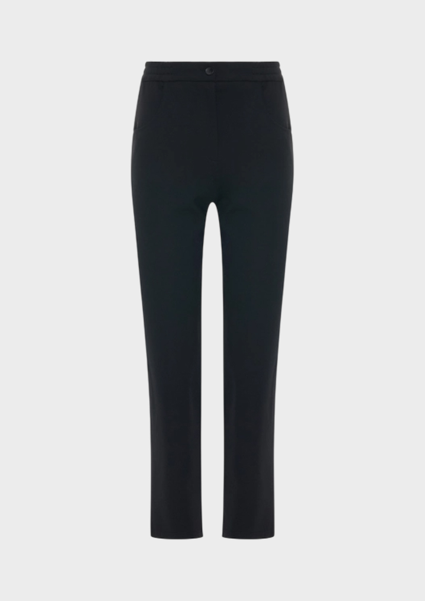 Зауженные брюки из плотного джерси с утеплением. Прямой силуэт заужен к низу. Застежка на молнию и пуговицу. Боковые карманы в швах. Задние накладные карманы с металлическими хольнитенами. В составе район.