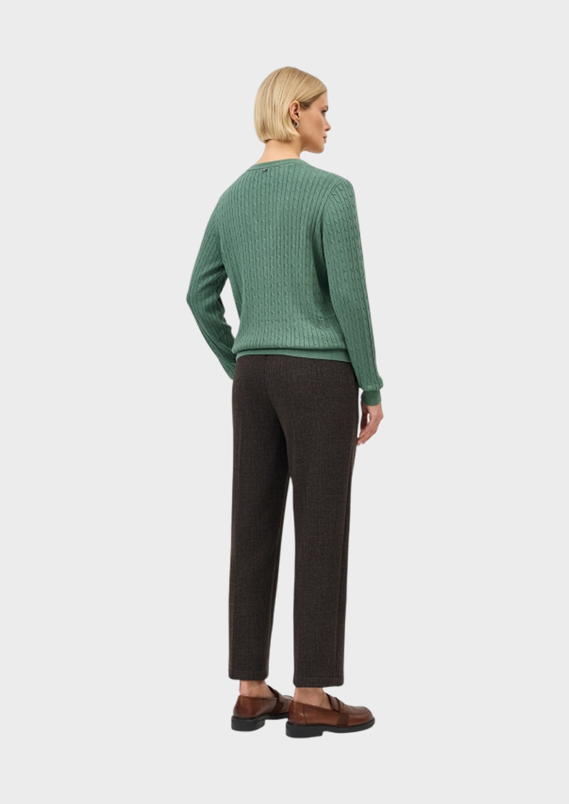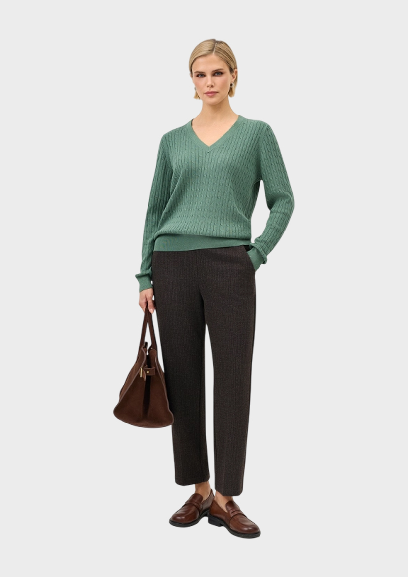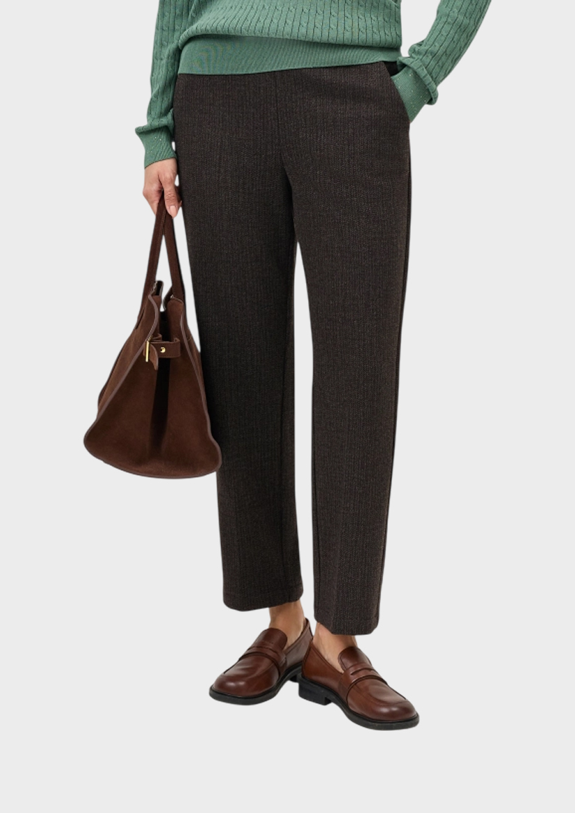 Базовые брюки зауженного силуэта из утепленного меланжевого джерси. Резинка по линии талии. Имитация гульфика. Боковые карманы в швах. В составе район и спандекс.