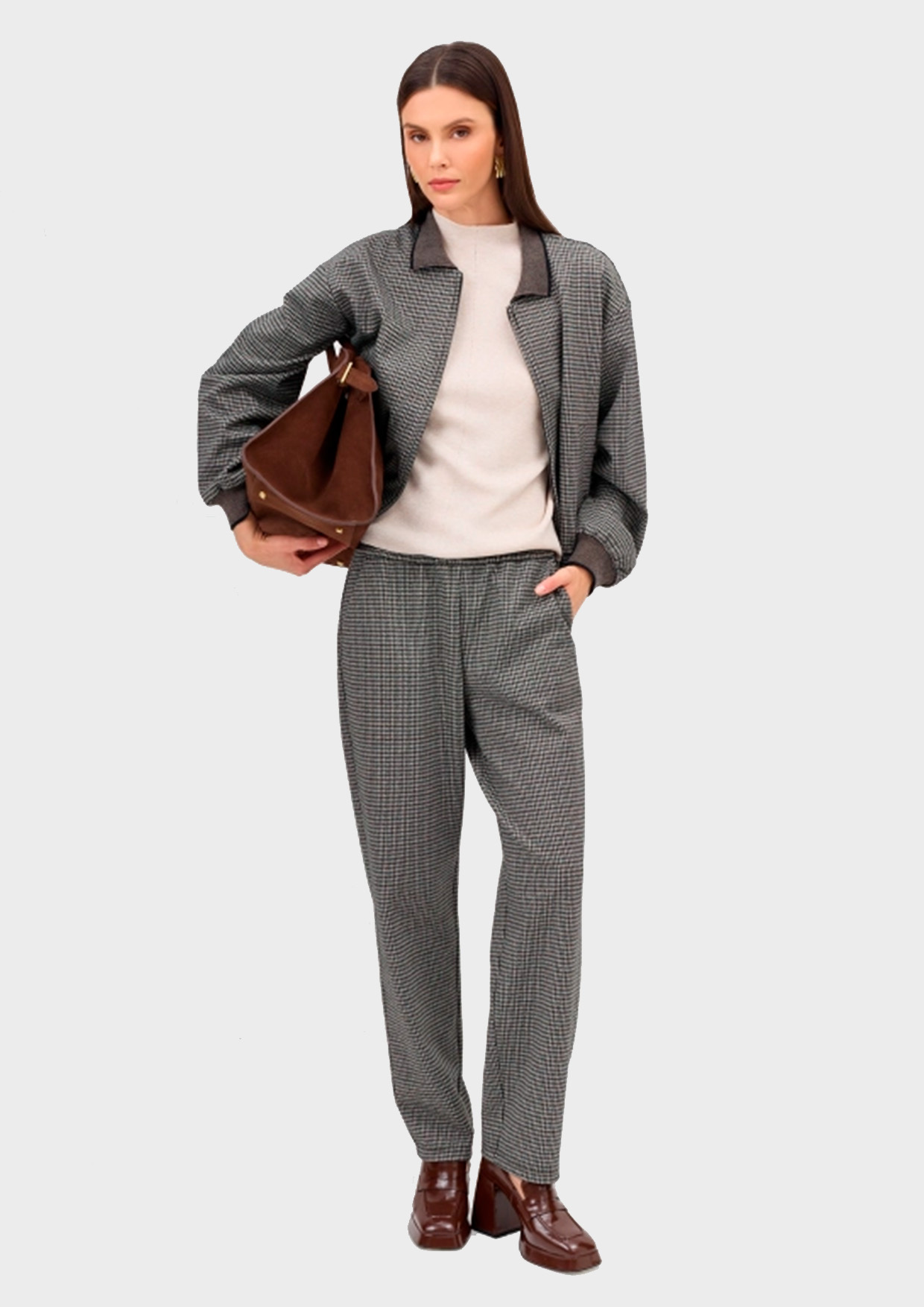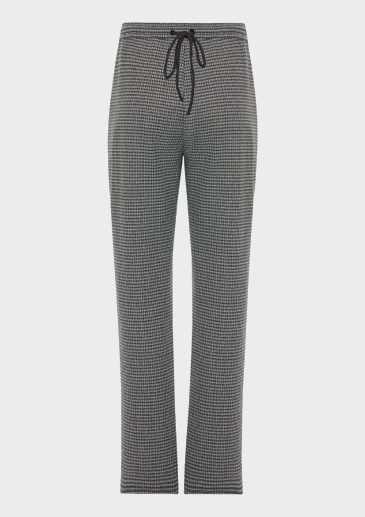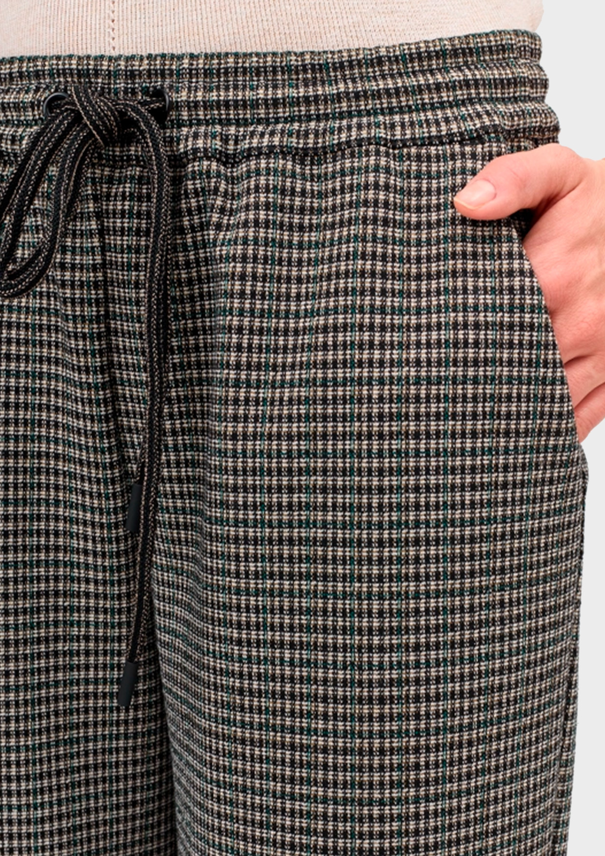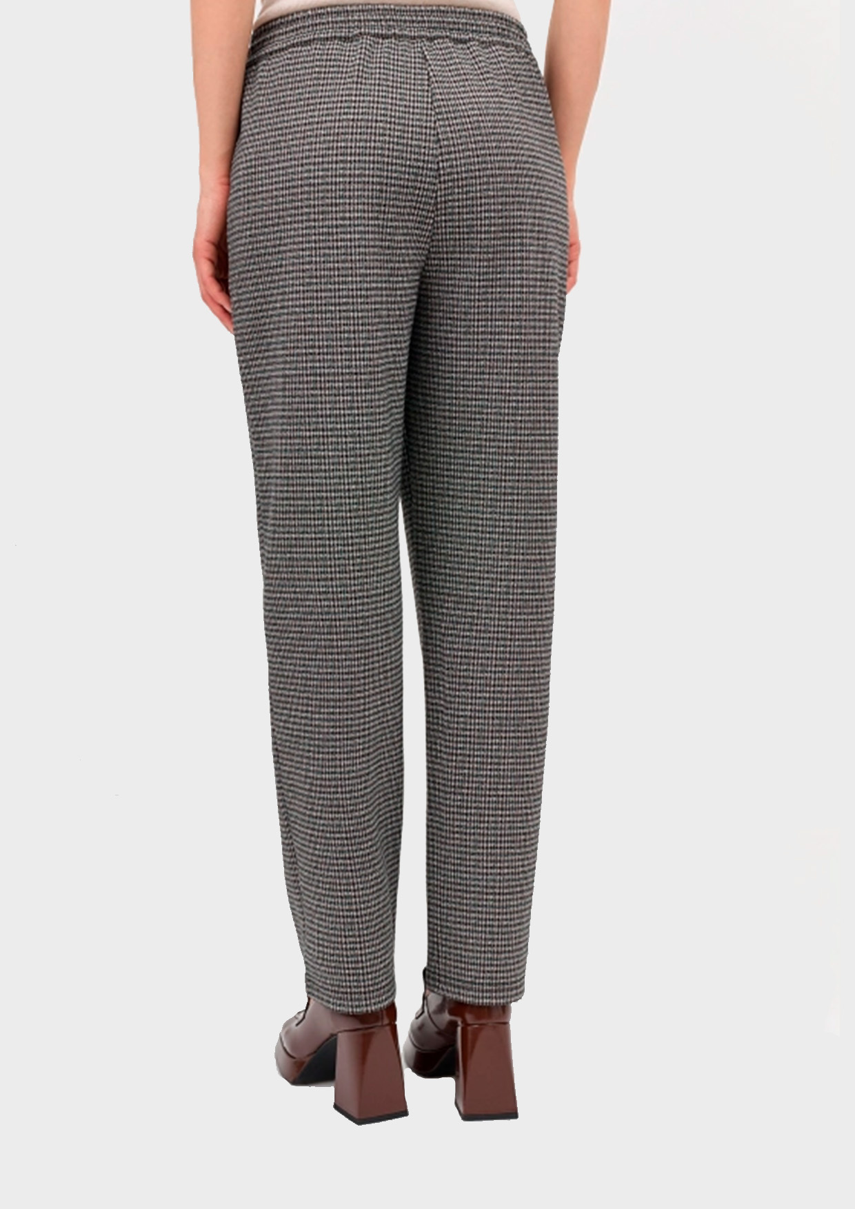 Расслабленные брюки из джерси в мелкую клетку из смесовой вискозы. Свободный силуэт немного заужен к низу. Резинка и шнурок по линии талии. Боковые карманы в швах.