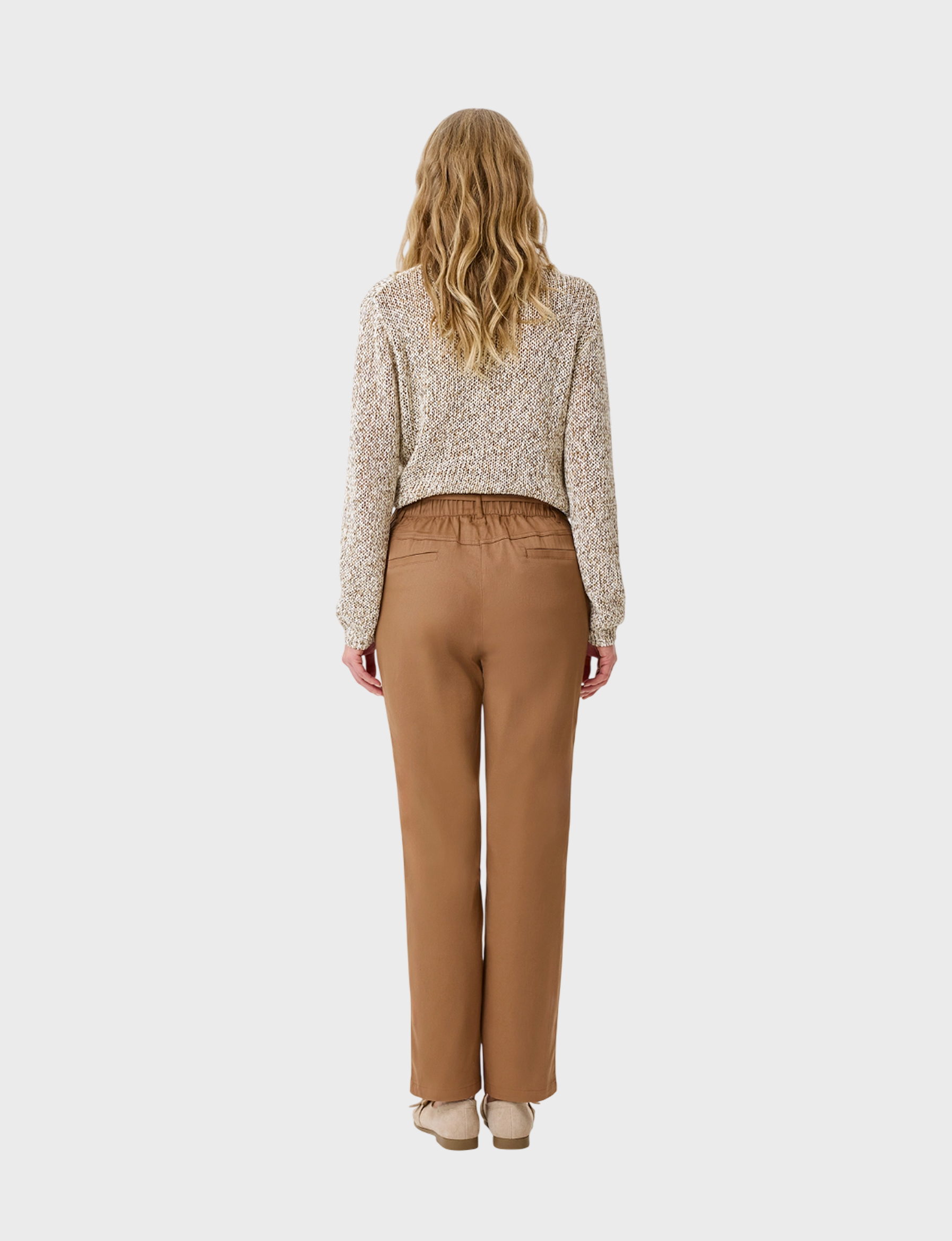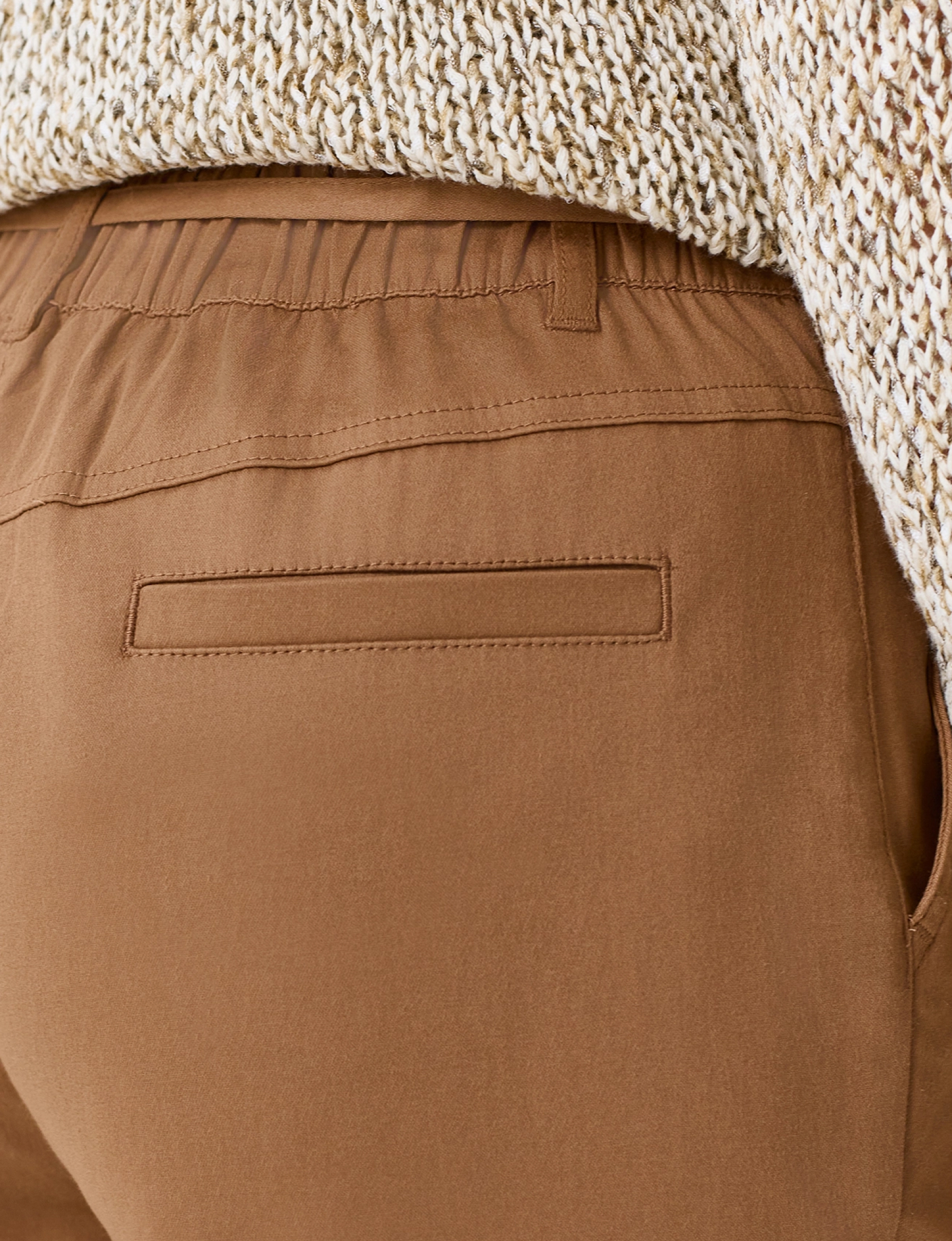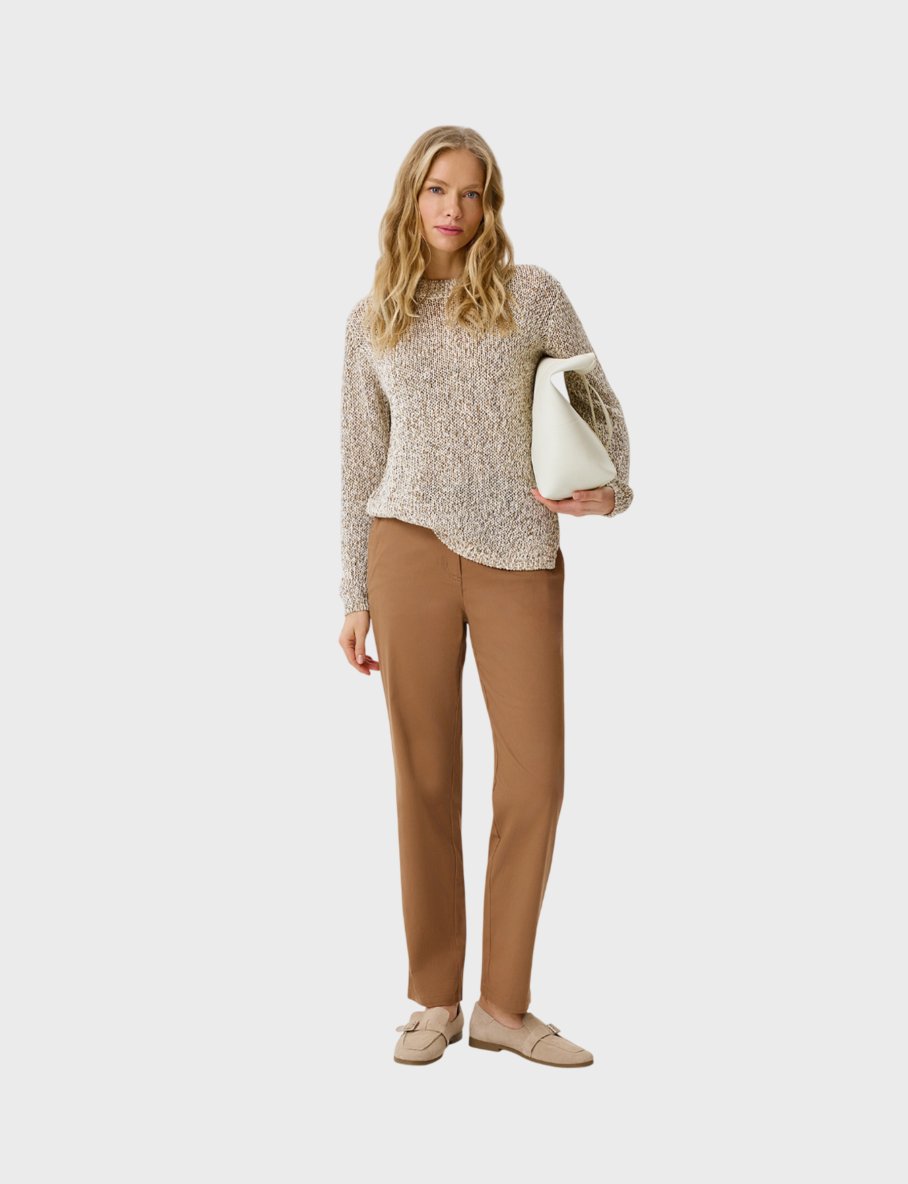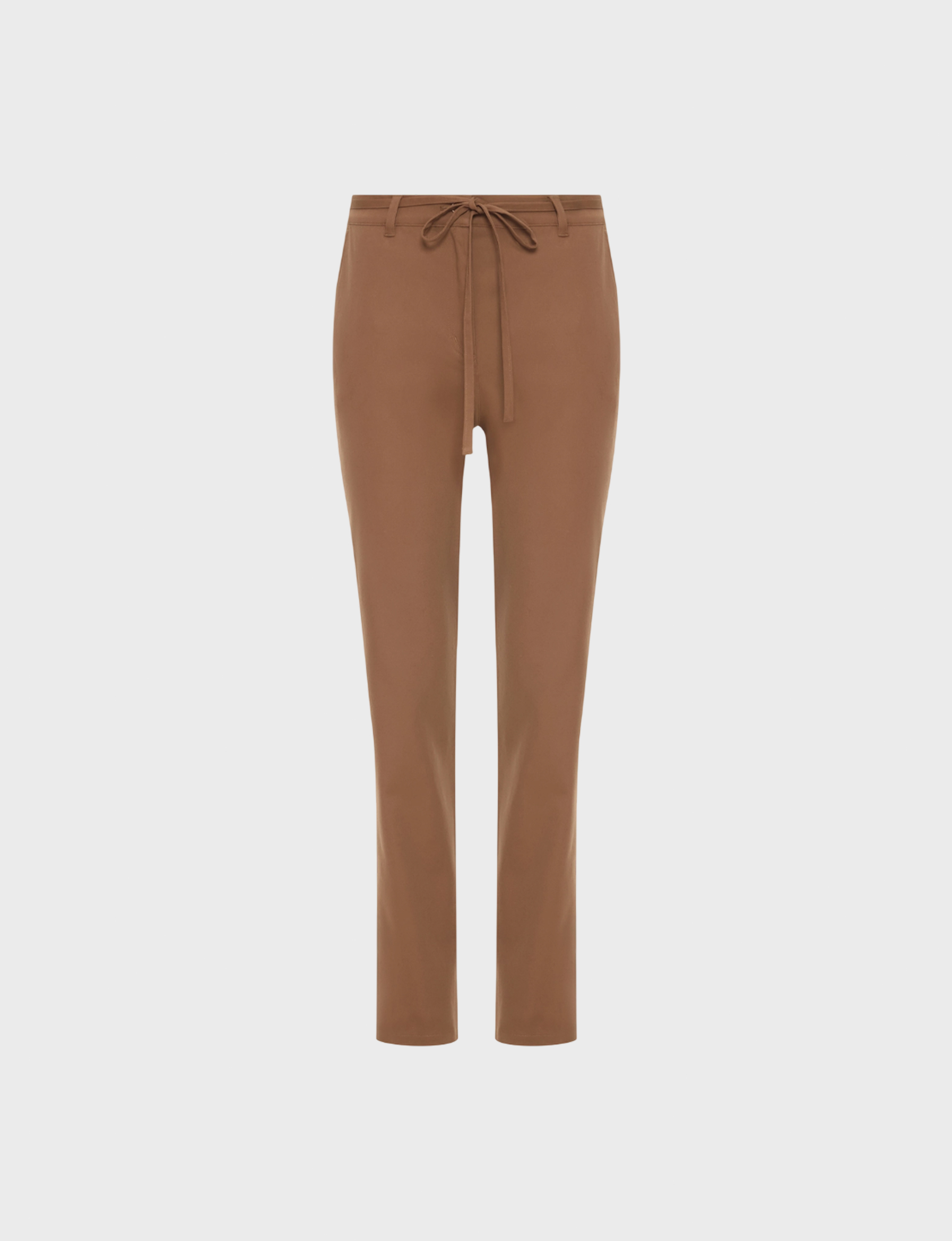 Хлопковые зауженные к низу брюки. Прямой силуэт. Резинка по линии талии. Боковые карманы в швах. Дополнены шлевками и тонким текстильным поясом.