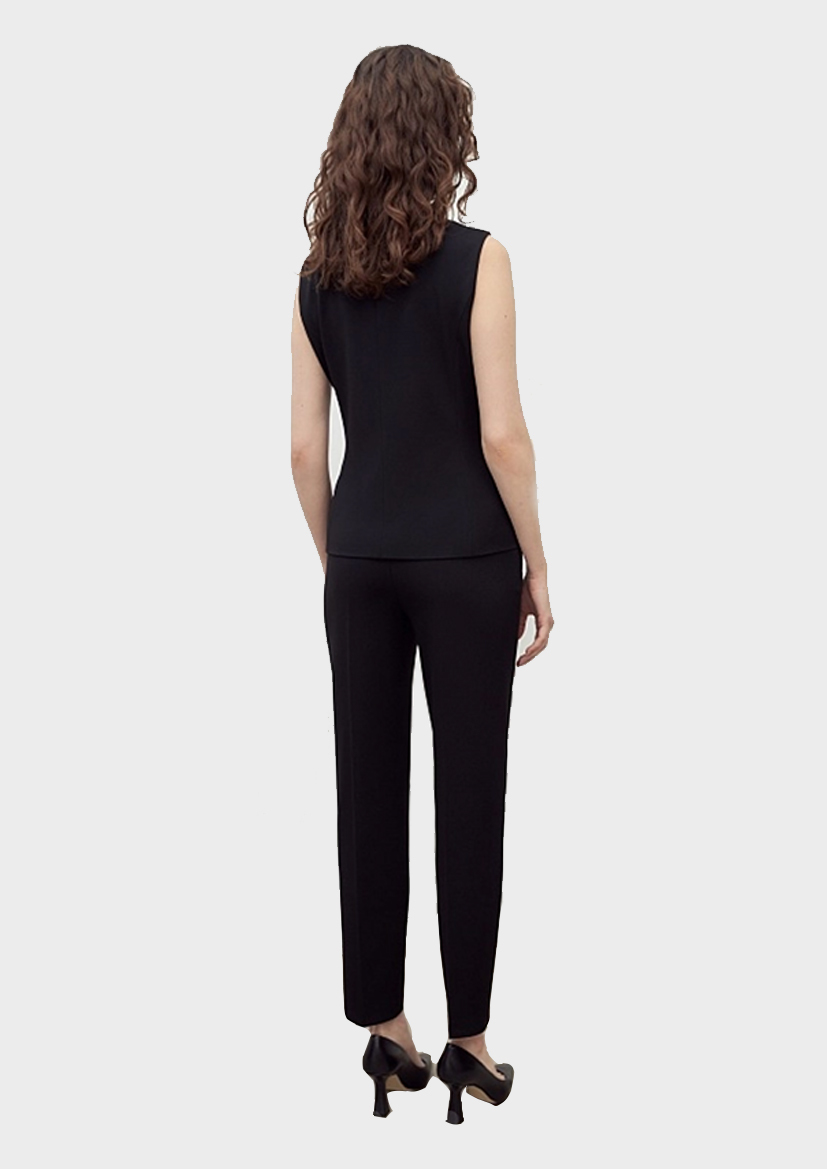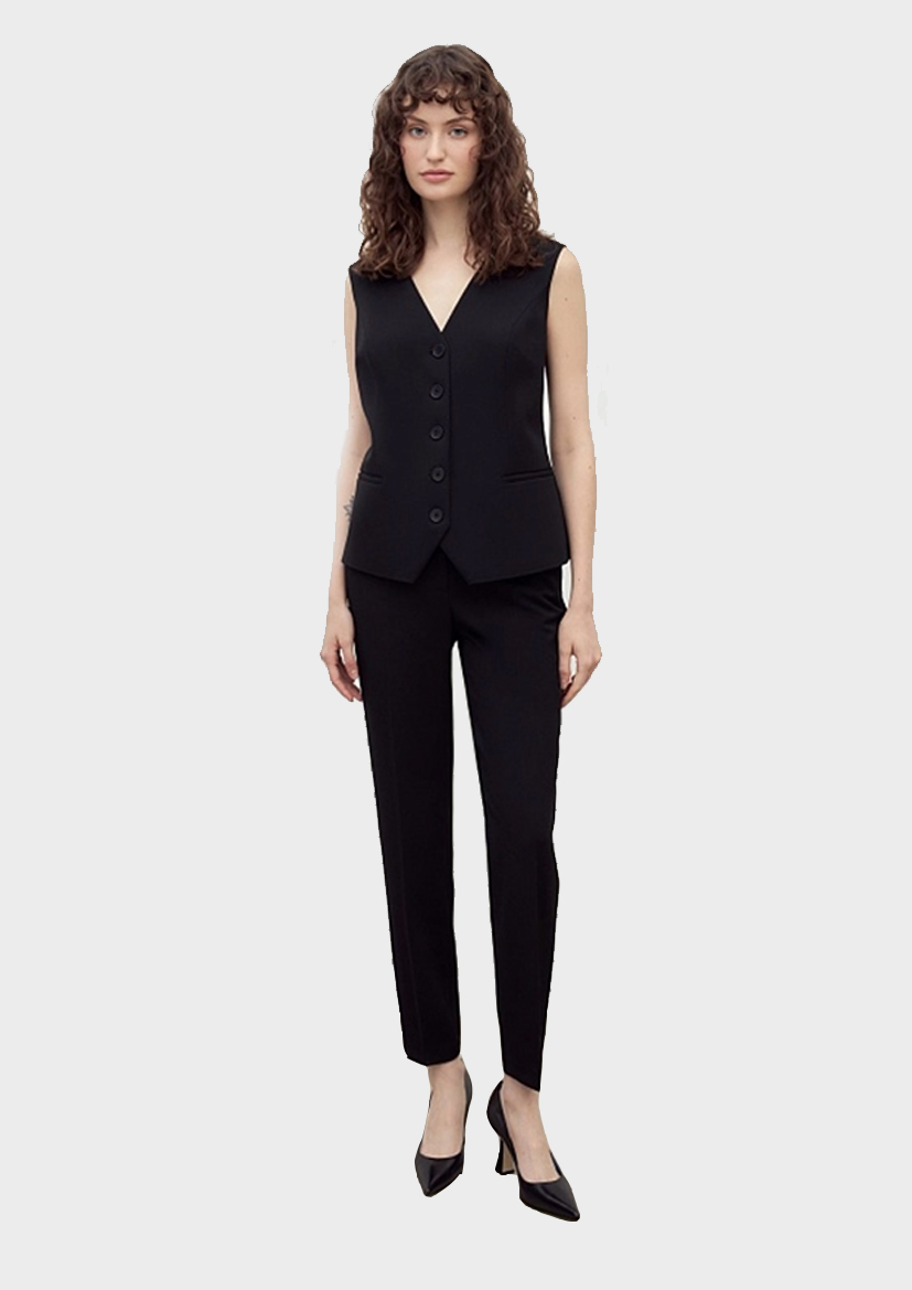 Брюки со стрелками из костюмной ткани зауженного к низу силуэта на притачном поясе со шлевками. Спереди боковые карманы и застежка на молнию и крючок. Эта модель идеально сочетается с жакетом из этой же ткани.