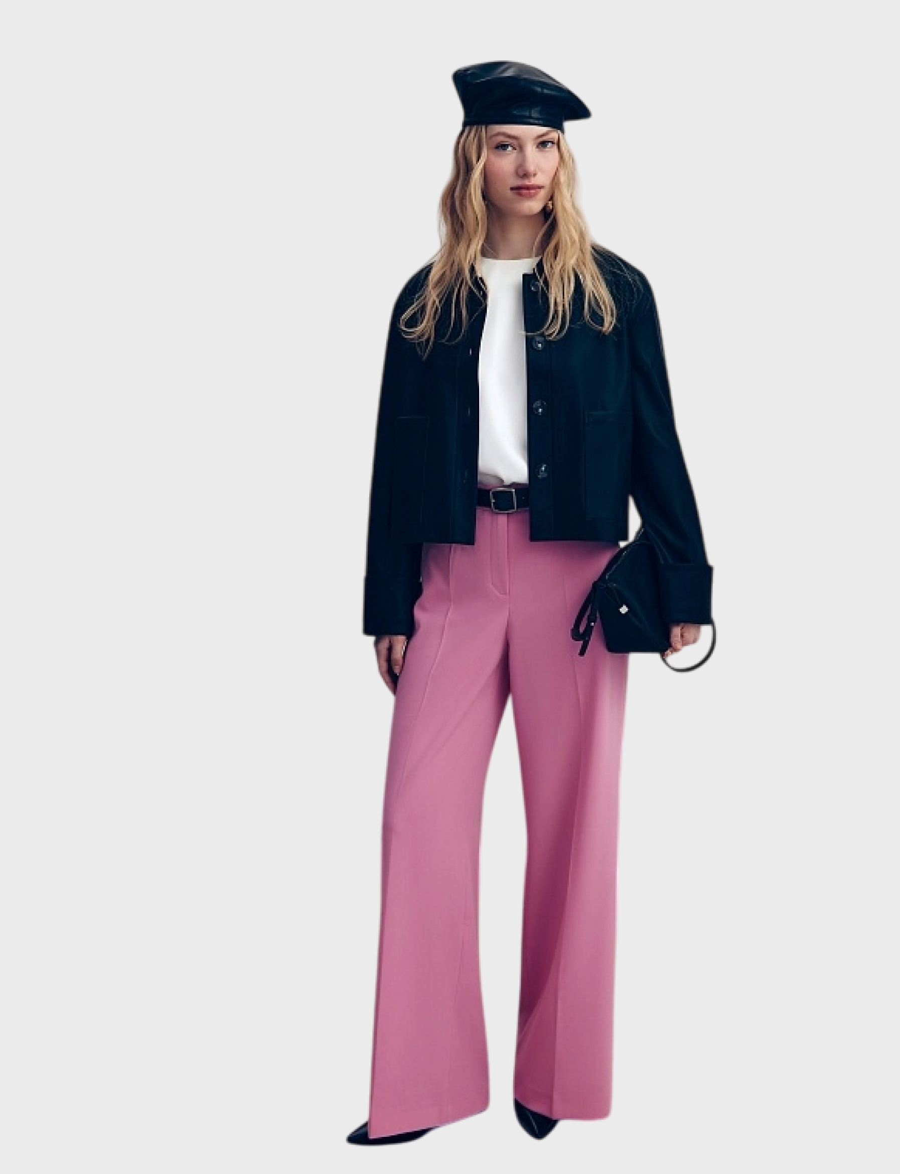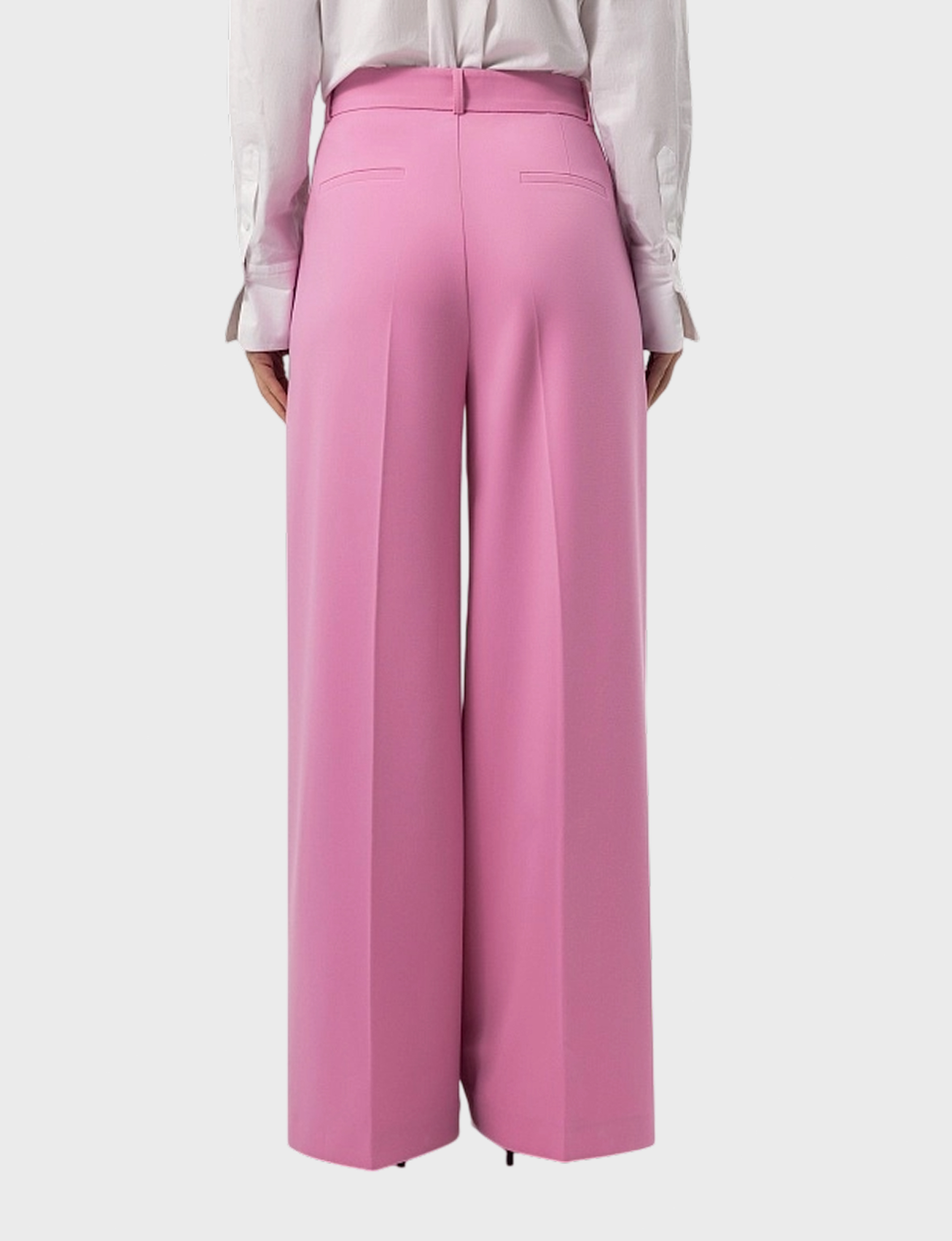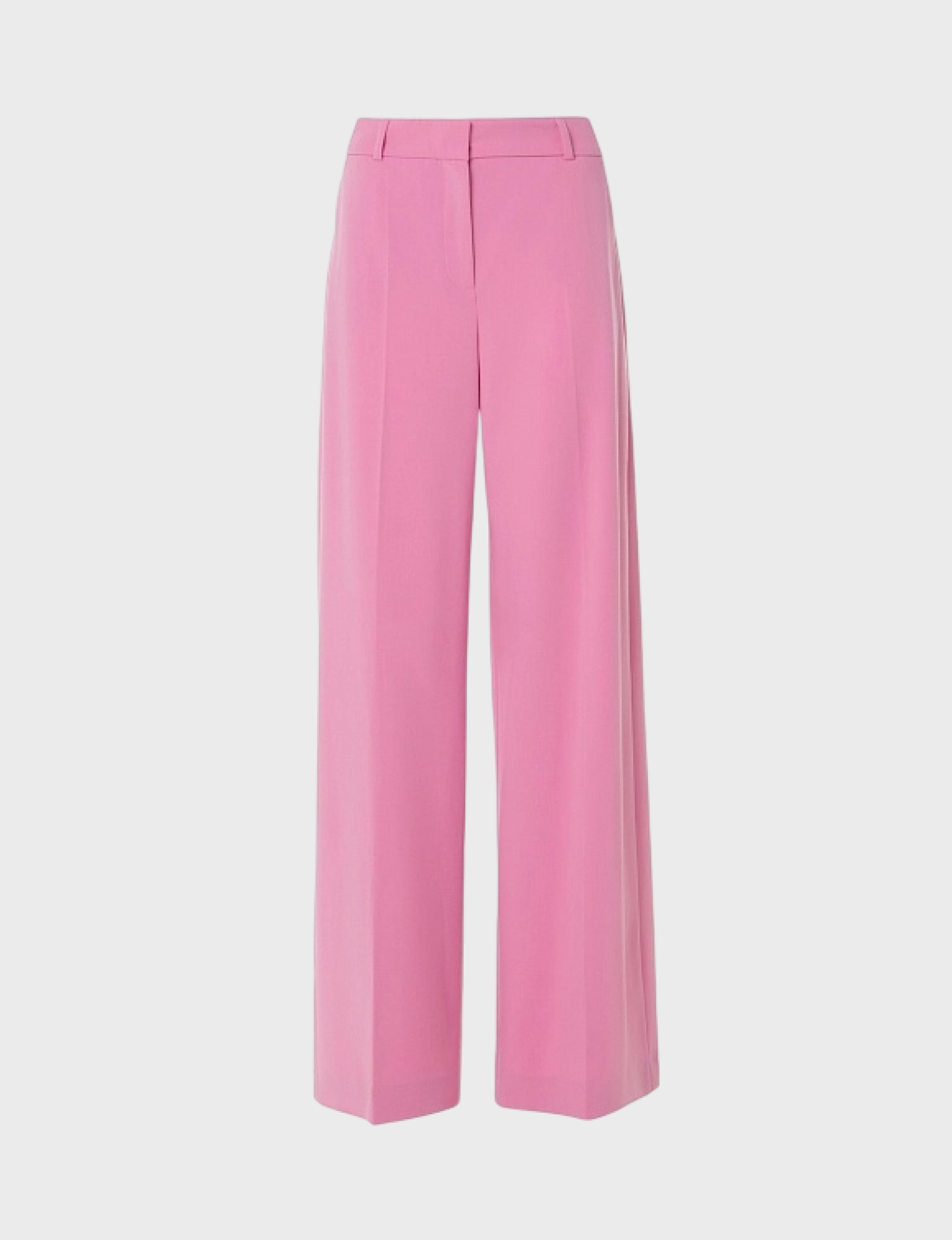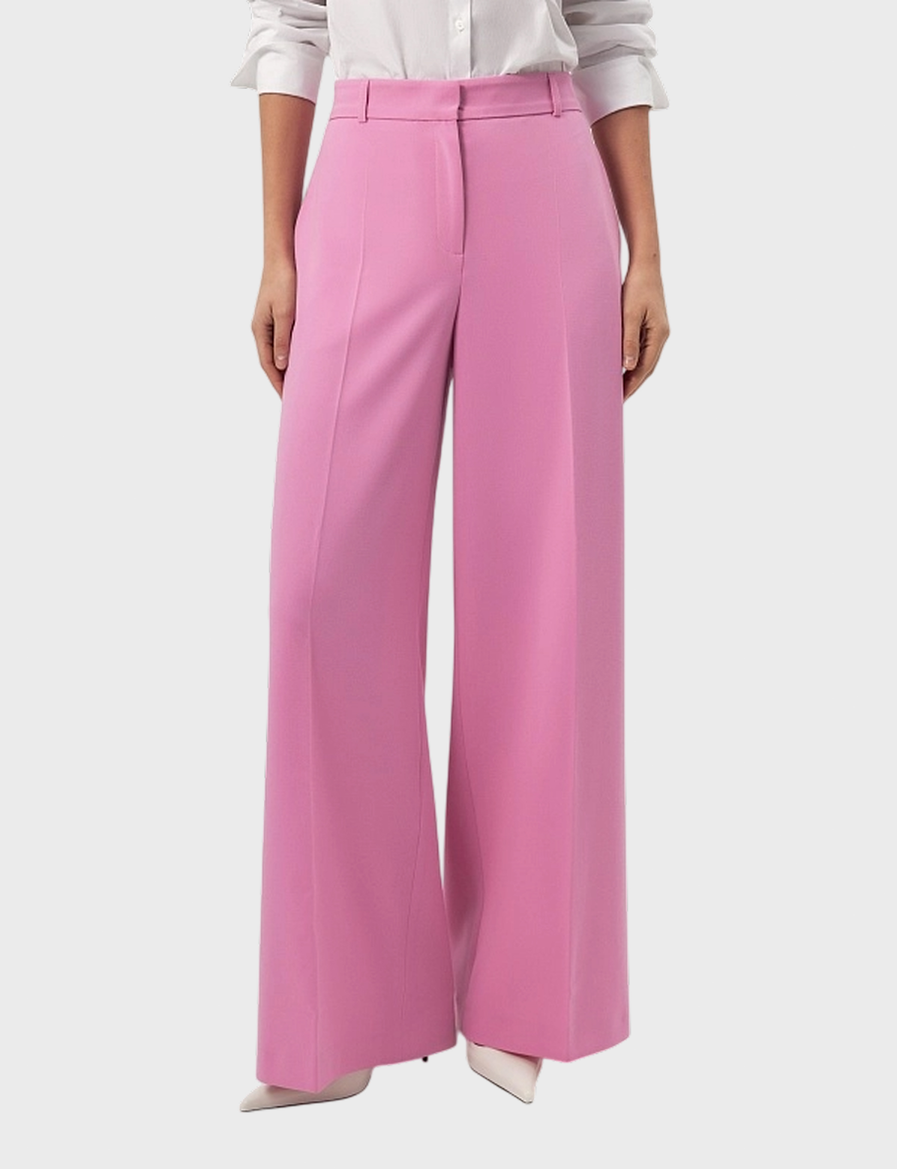 Брюки широкие по низу на талии из вискозной костюмной ткани яркого конфетно - розового цвета. На притачном поясе. Спереди боковые карманы и застежка на молнию и крючок. Составит яркий весенний образ с жакетом из одной ткани.