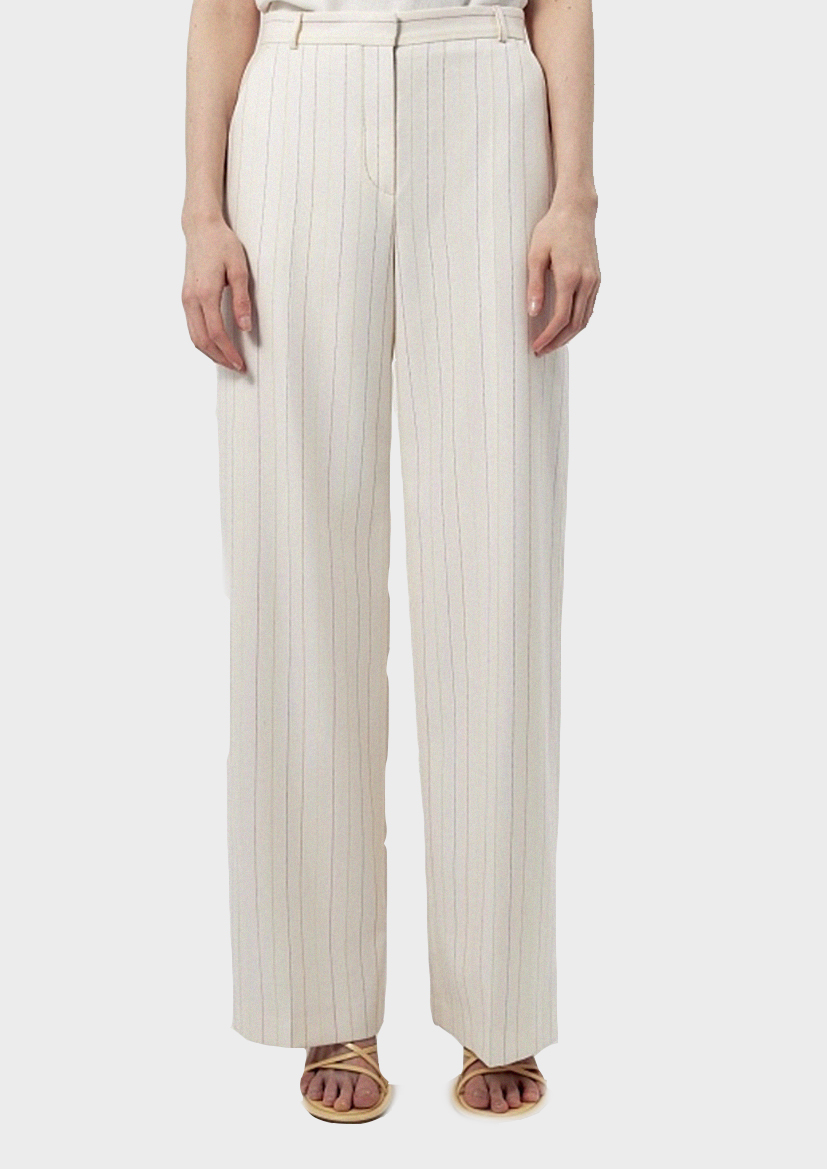 Прямые брюки свободного силуэта из костюмной ткани молочного цвета с тонкой разноцветной полоской. Имеют два функциональных кармана по бокам и два прорезных кармана сзади. Брюки идеально сочетаются с жакетом из одной ткани.