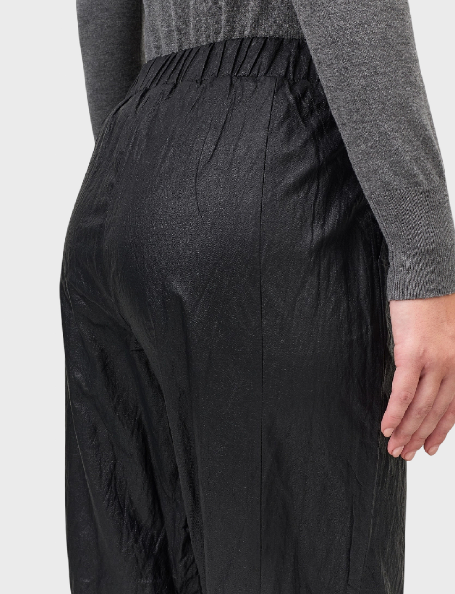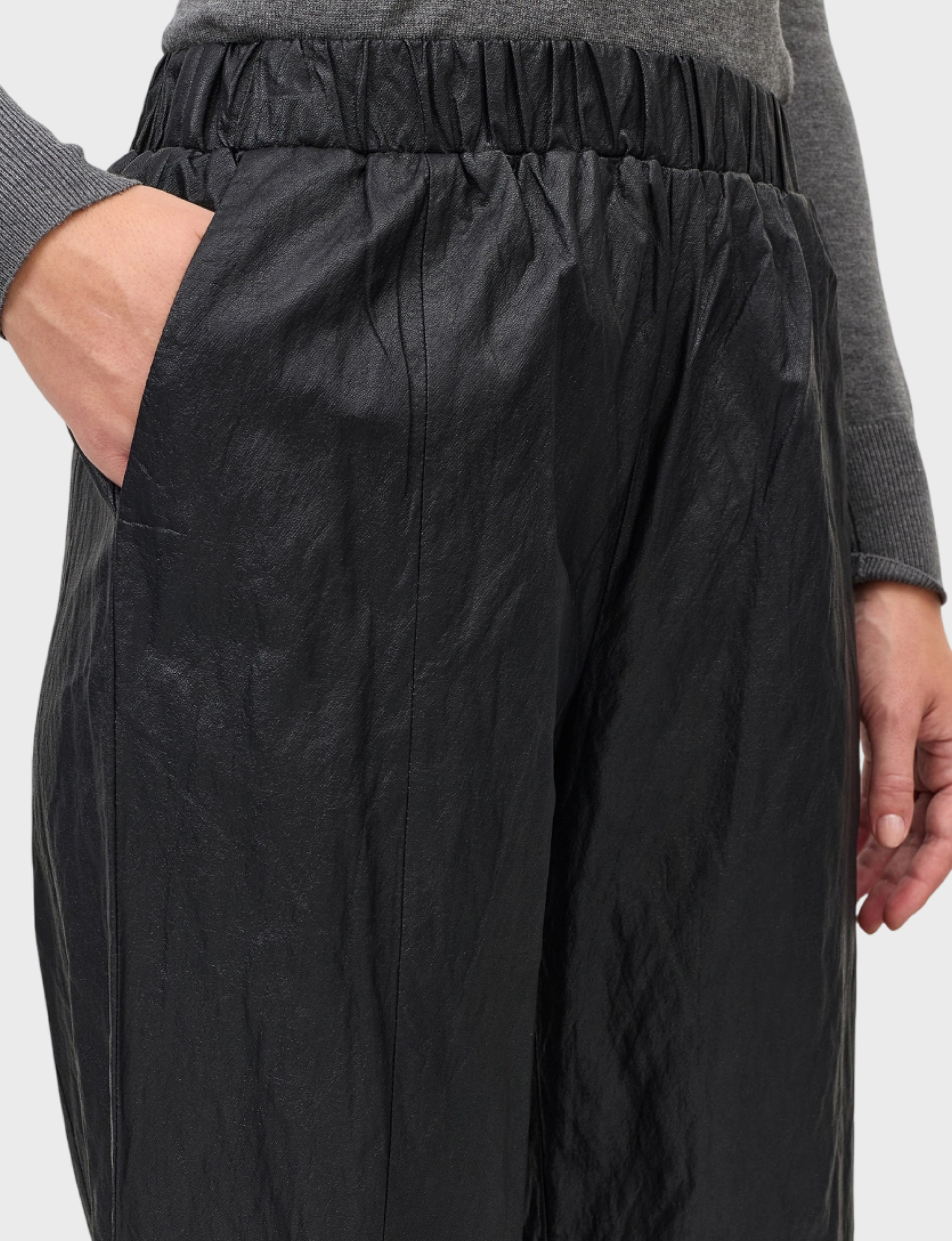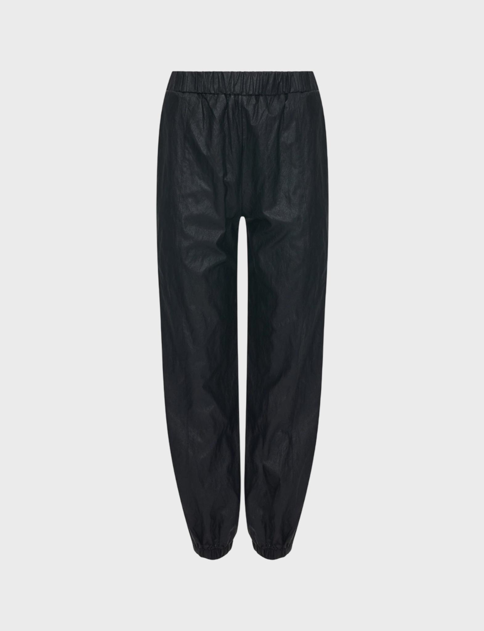 Брюки джоггеры из фактурной вискозы с накатом и крэш эффектом. Прямой силуэт заужен резинками по низу. Резинка по линии талии. Боковые карманы в швах.