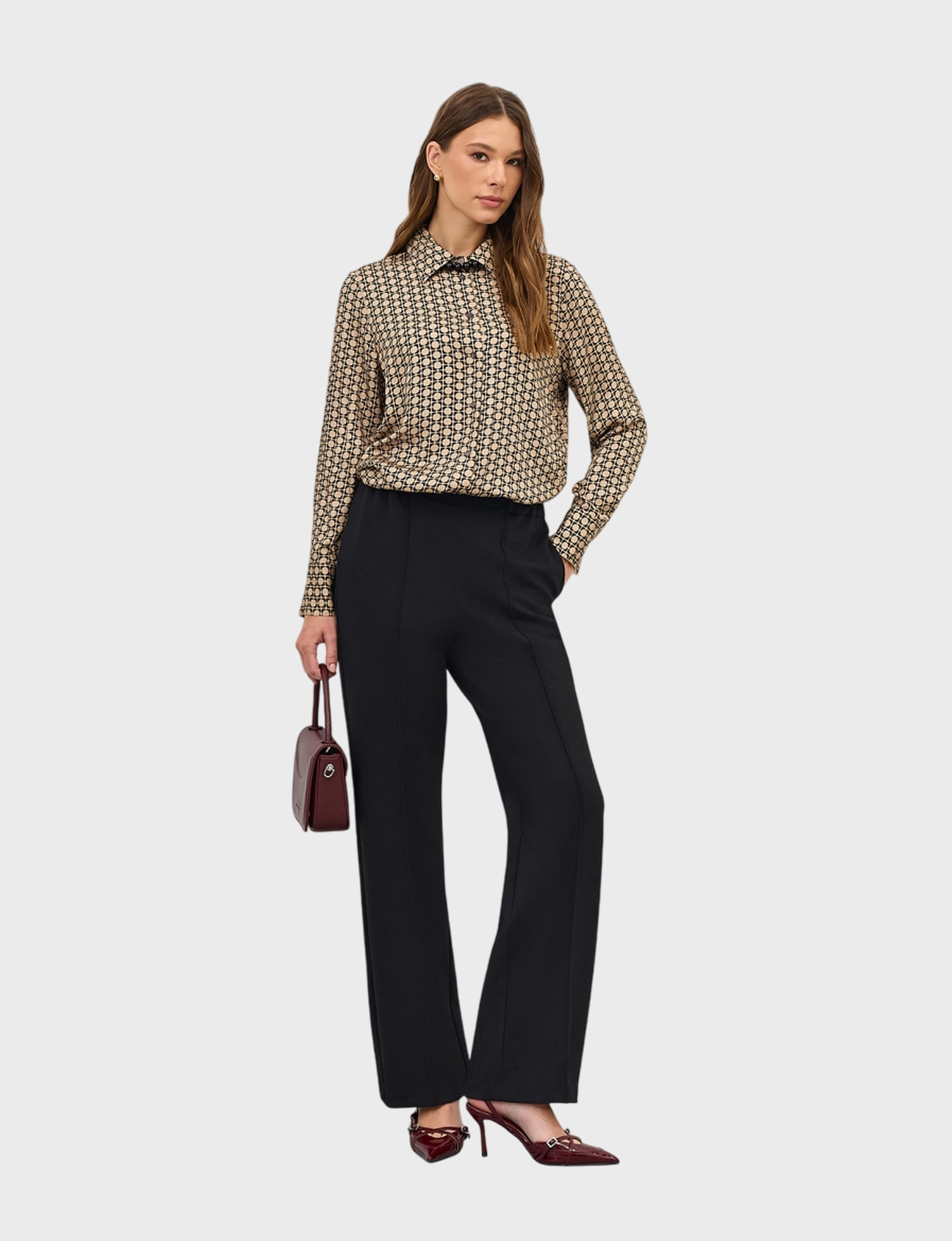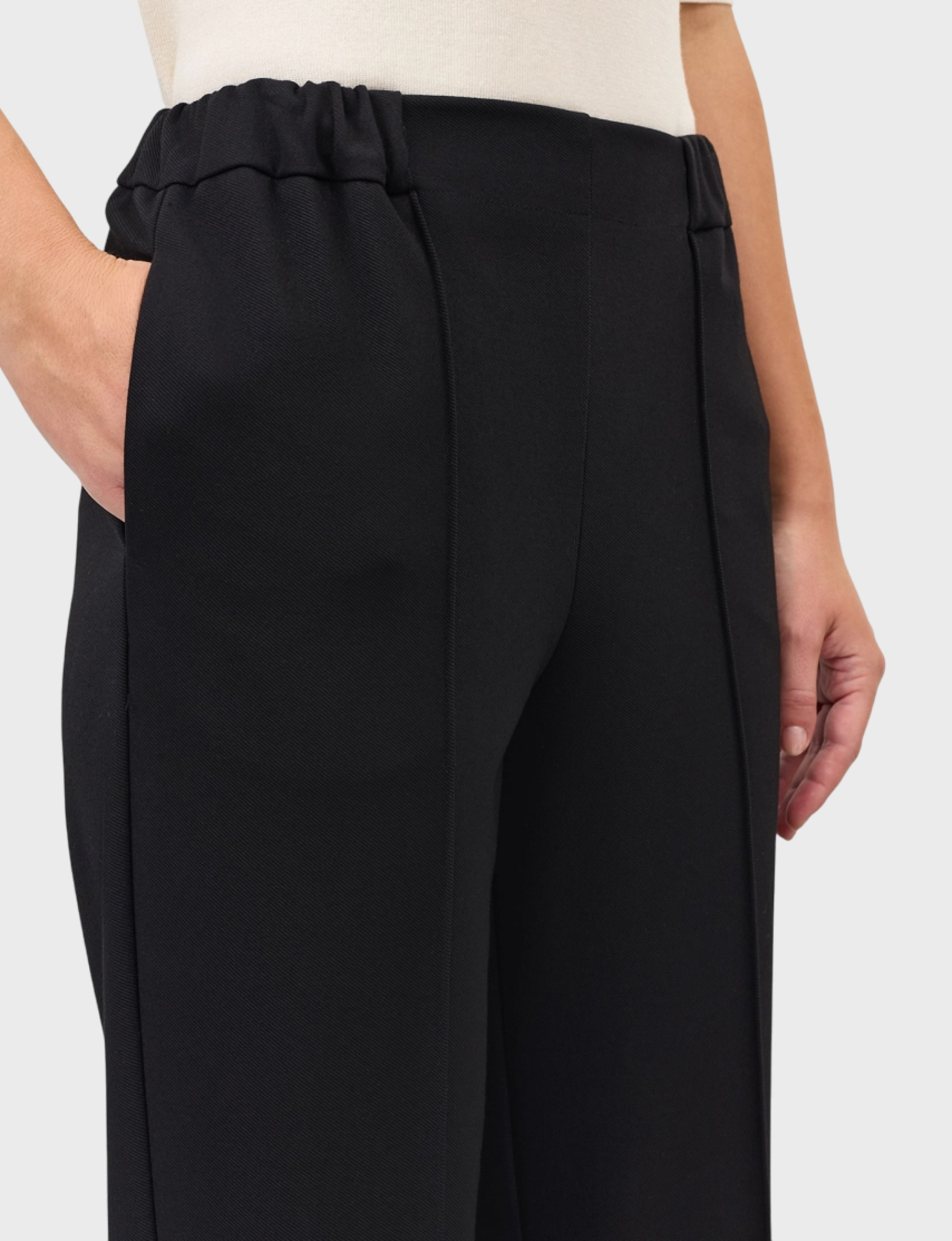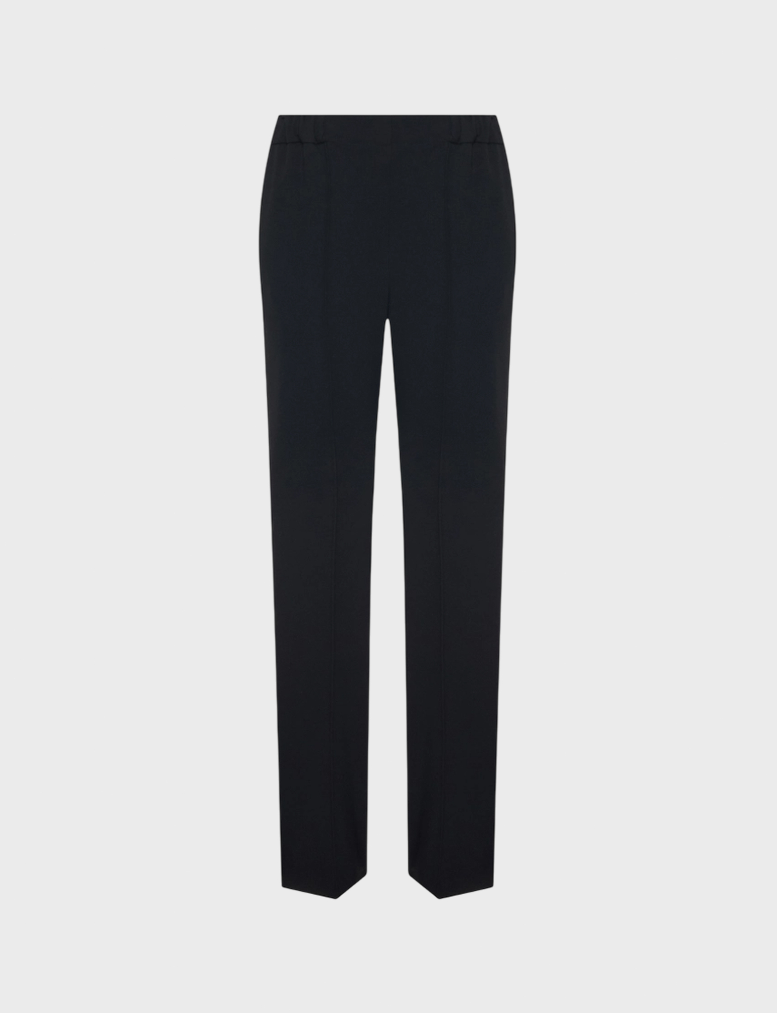 Базовые трикотажные брюки с простроченными стрелками. Прямой силуэт. Резинка по линии талии спинки. Боковые карманы в швах. В составе вискоза.