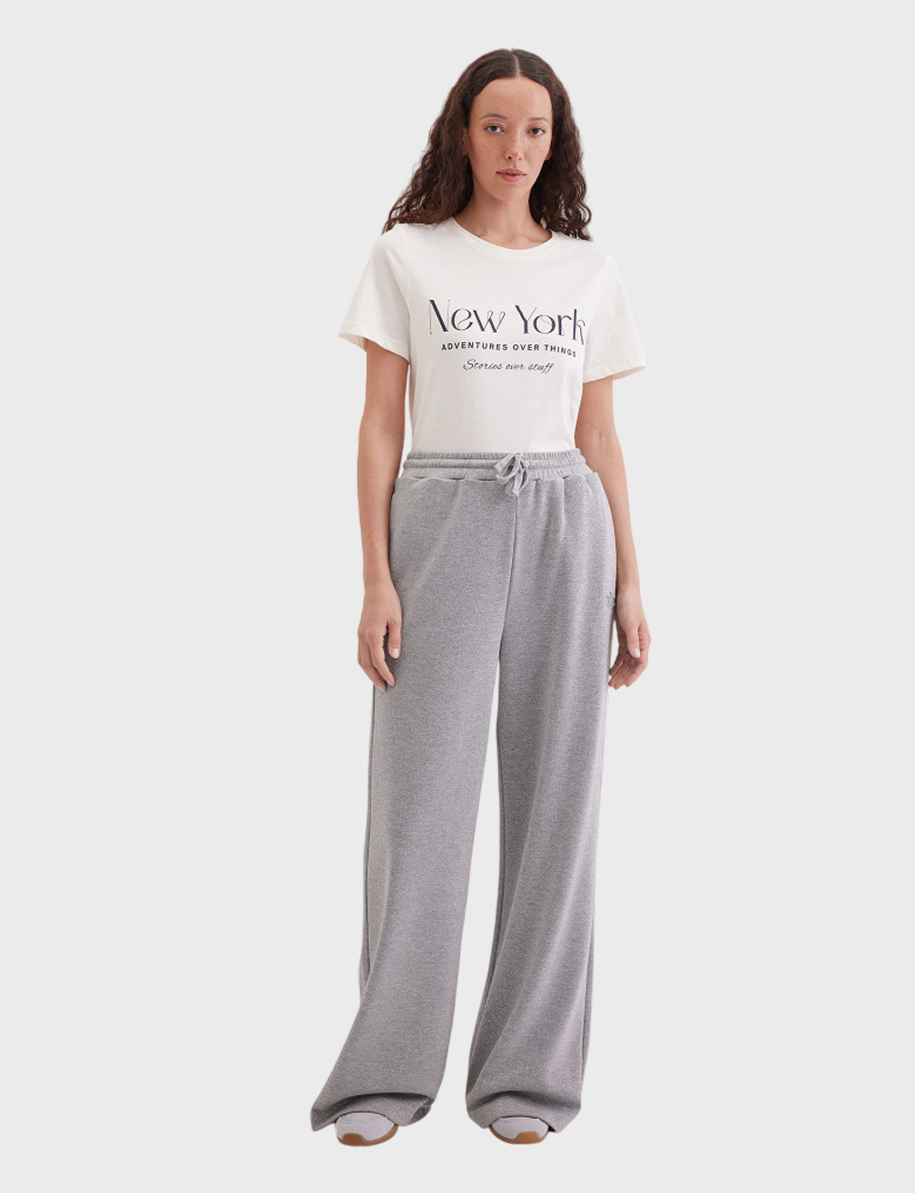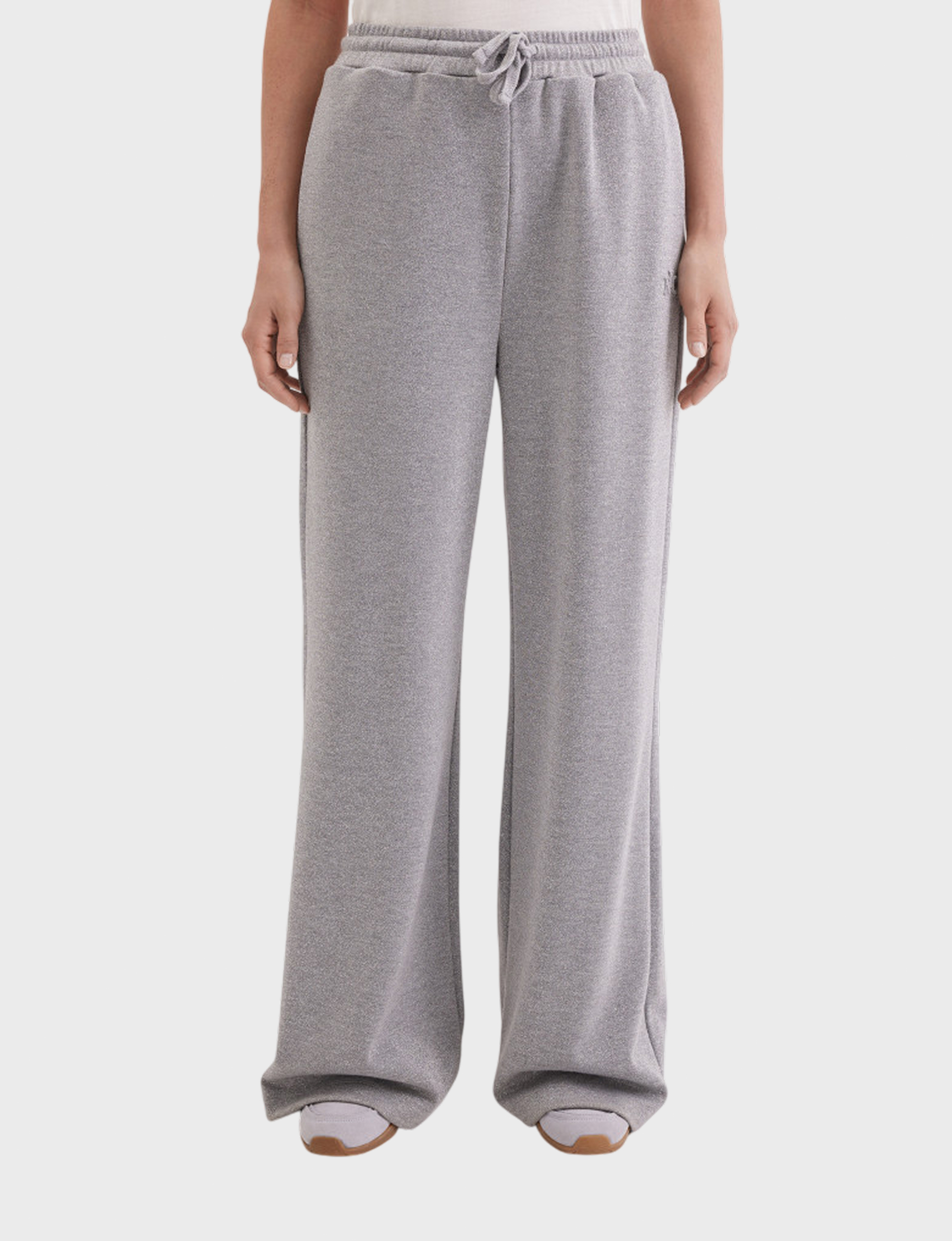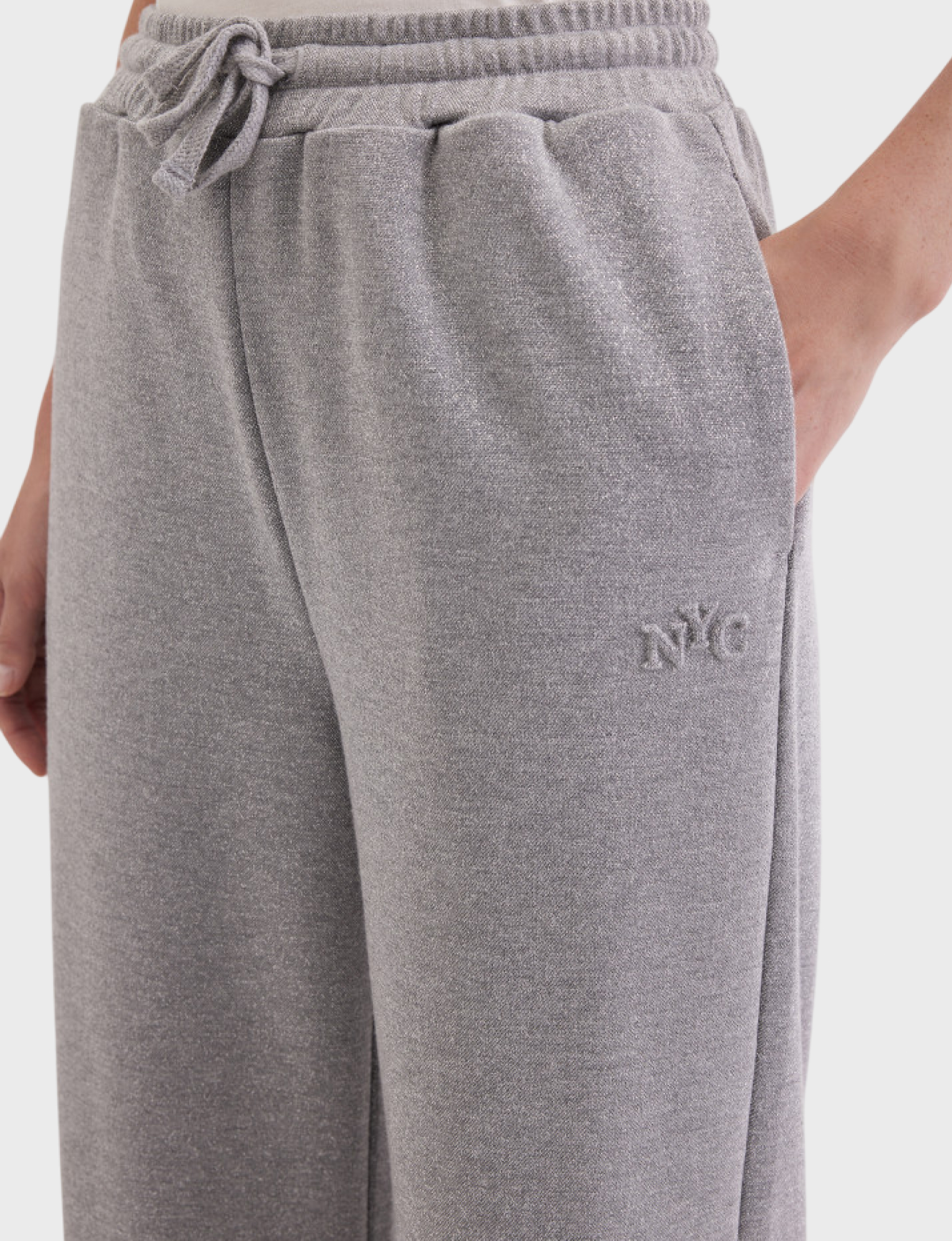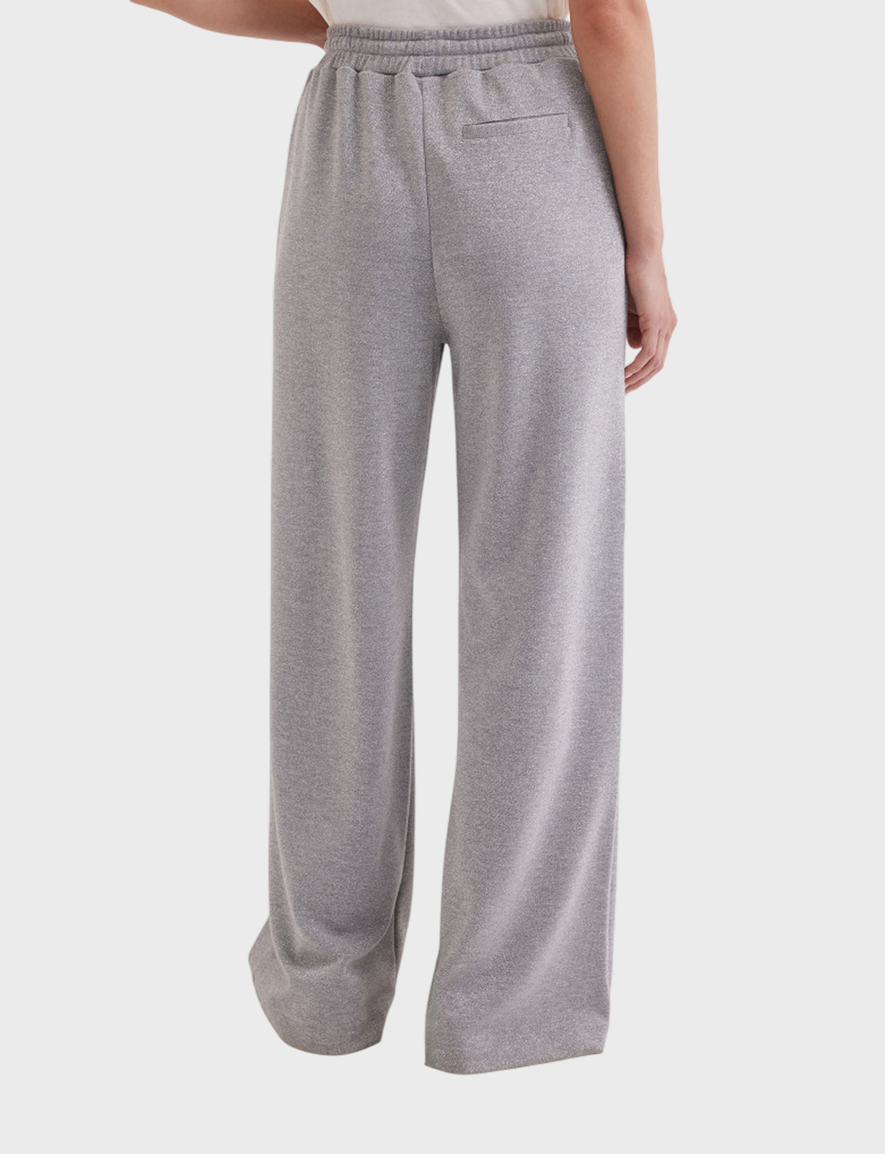 Прямые свободные трикотажные брюки из смесовой мягкой вискозы с добавлением люрекса, на резинке с завязками, с карманами в шве и вышивкой и ложным карманом сзади.