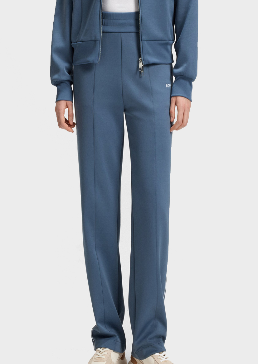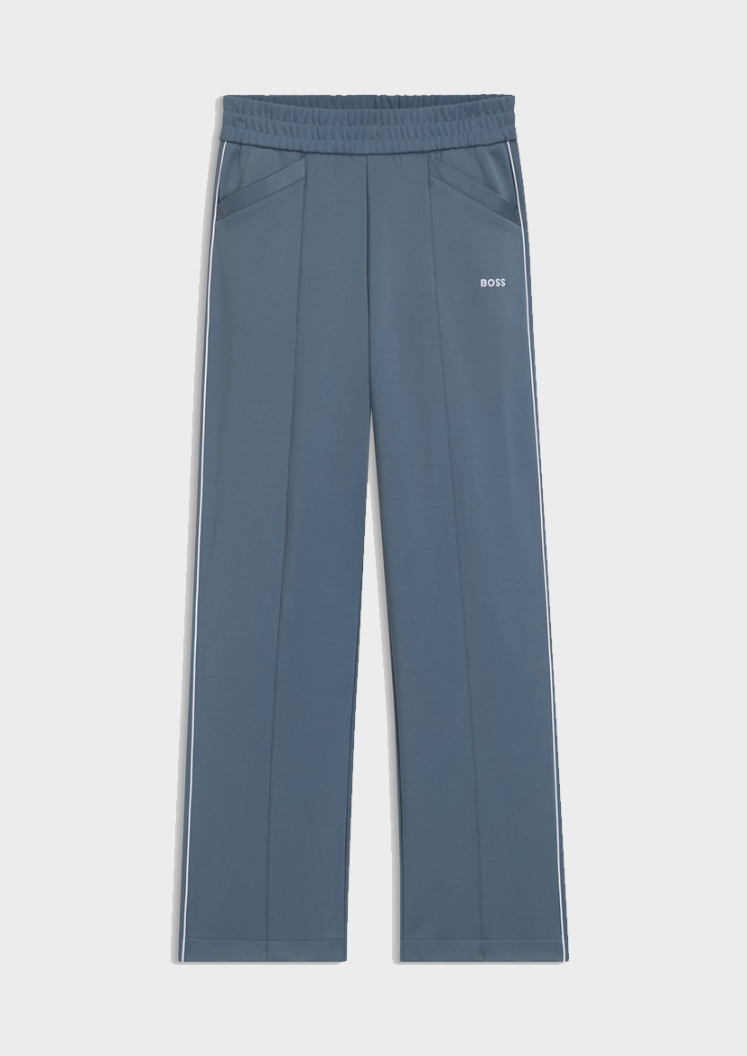 Брюки от спортивного костюма BOSS с контрастной окантовкой и фирменным принтом создают классический спортивный образ. Прямой крой из двусторонней эластичной ткани.
