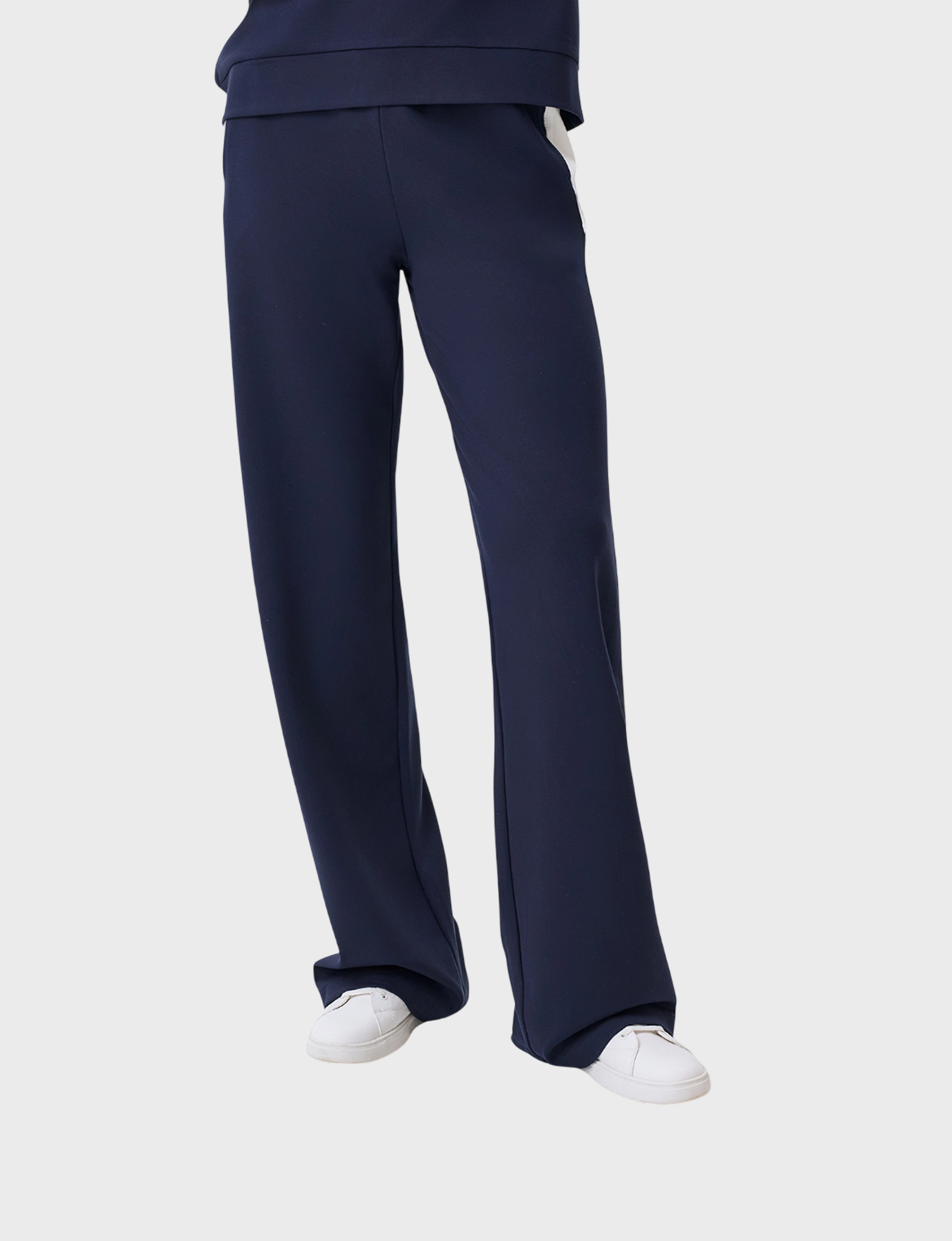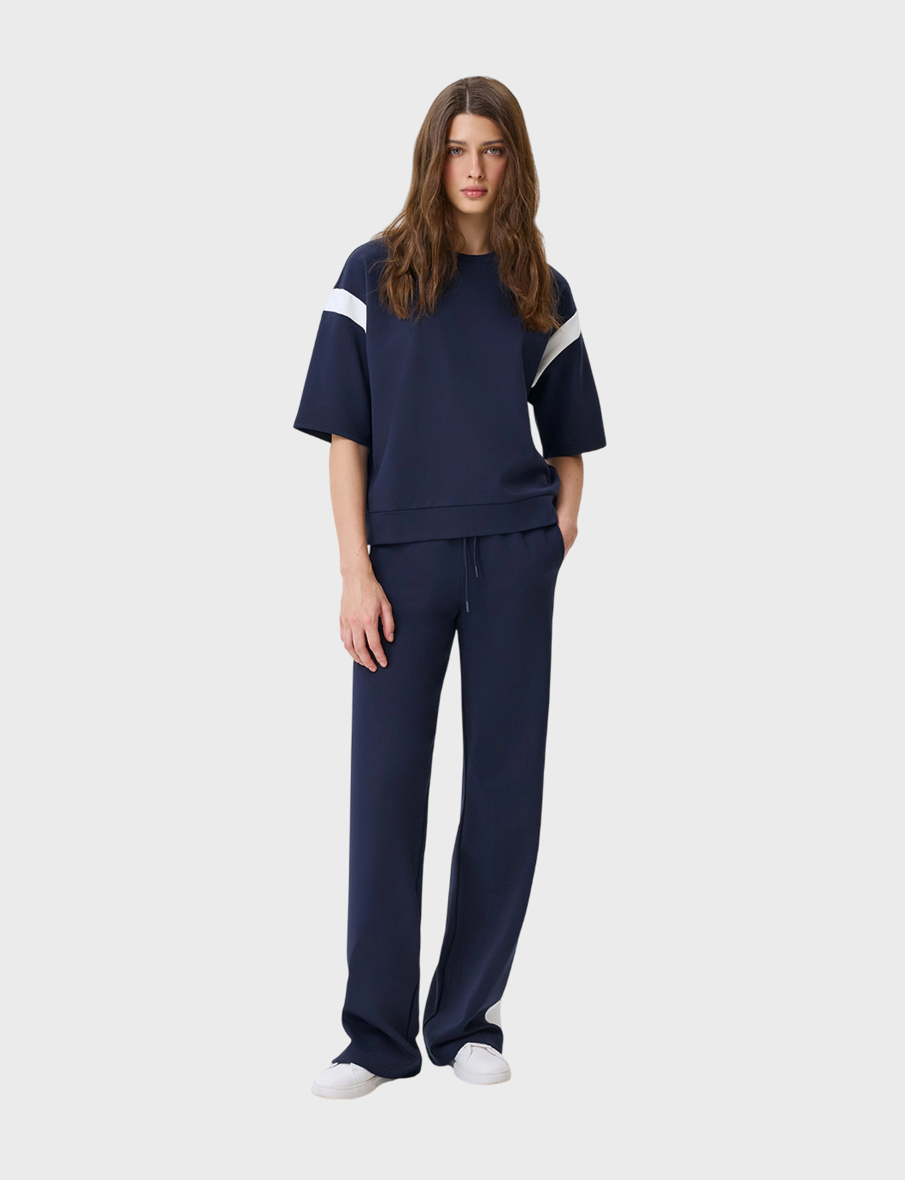 Брюки с контрастными лампасами. Свободный силуэт. Резинка по линии талии. Боковые карманы в швах. В составе нейлон и вискоза.