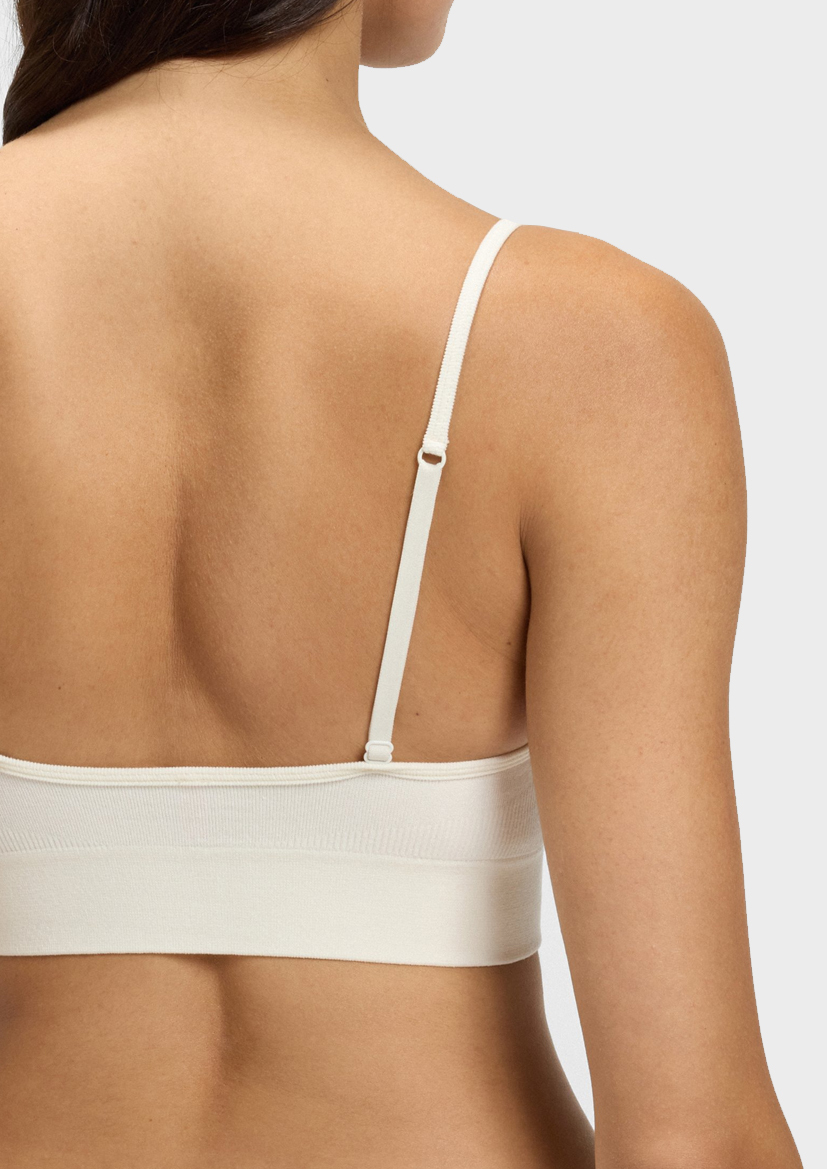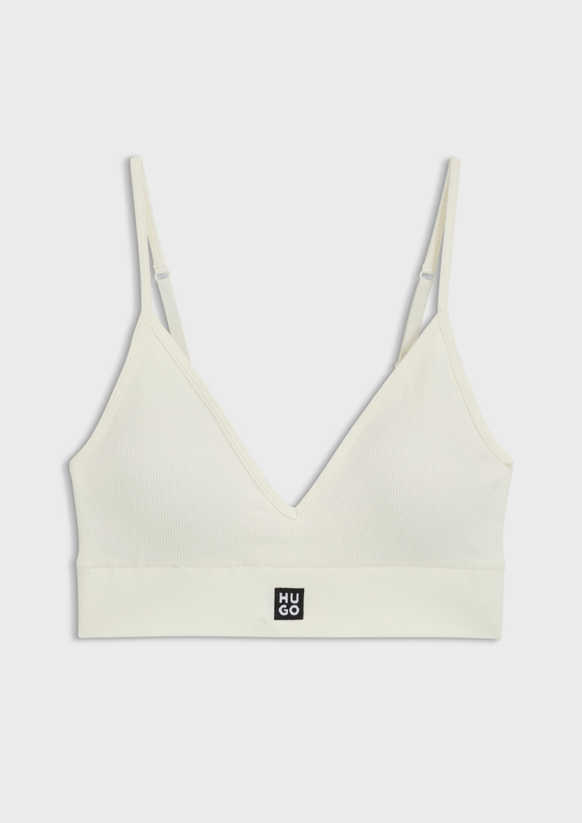 Бюстгальтер без косточек, украшенный контрастным многослойным логотипом, имеет комбинированную структуру в рубчик для удобной посадки. Съемные накладки и регулируемые бретельки.