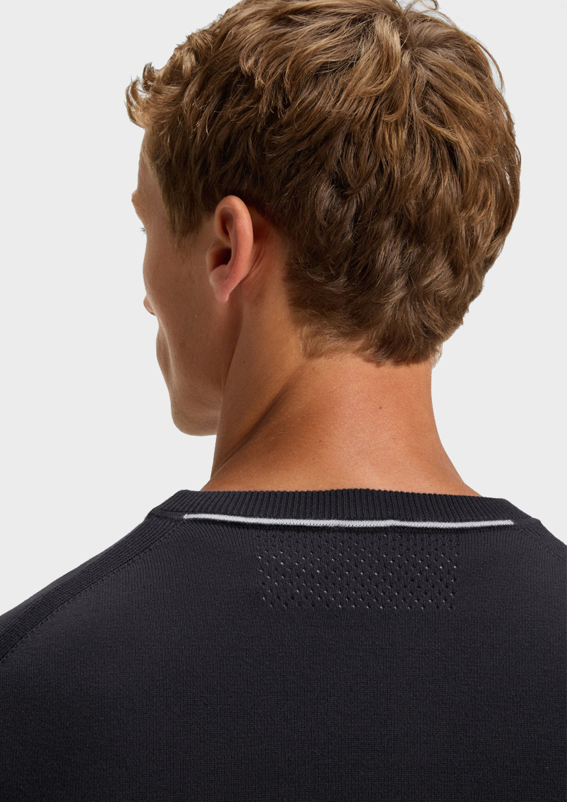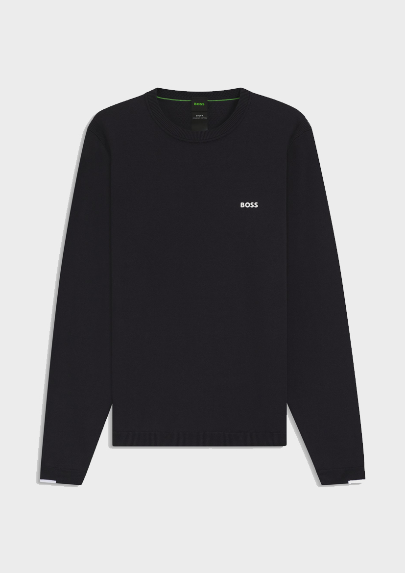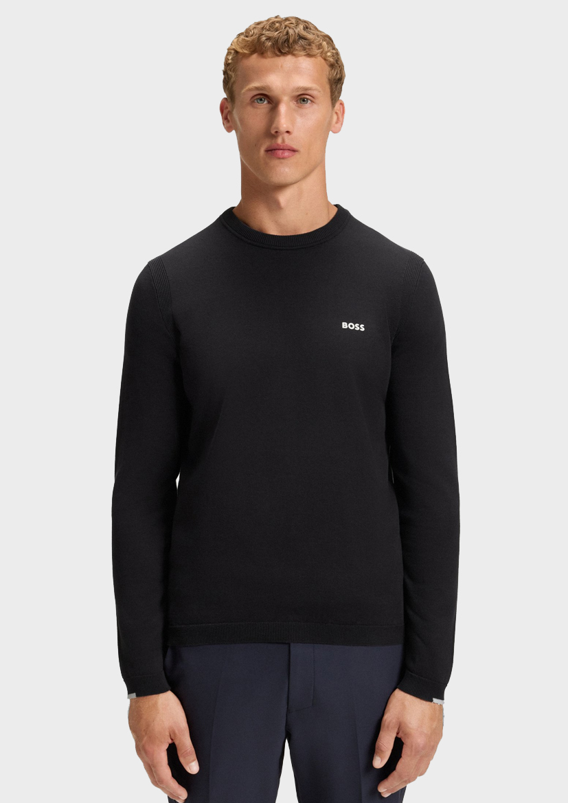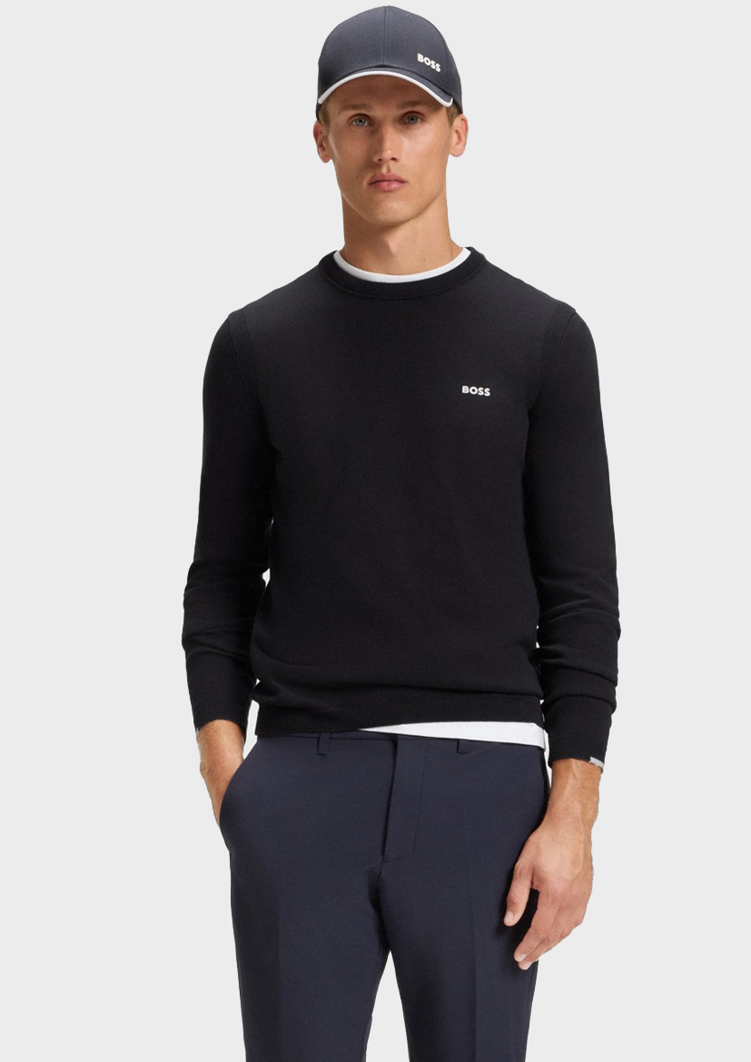 Этот мужской свитер BOSS со встроенной перфорацией и эргономичными швами обеспечивает воздухопроницаемость и эластичность. Вязаный из мягкого хлопка. Контрастный логотип и окантовка.