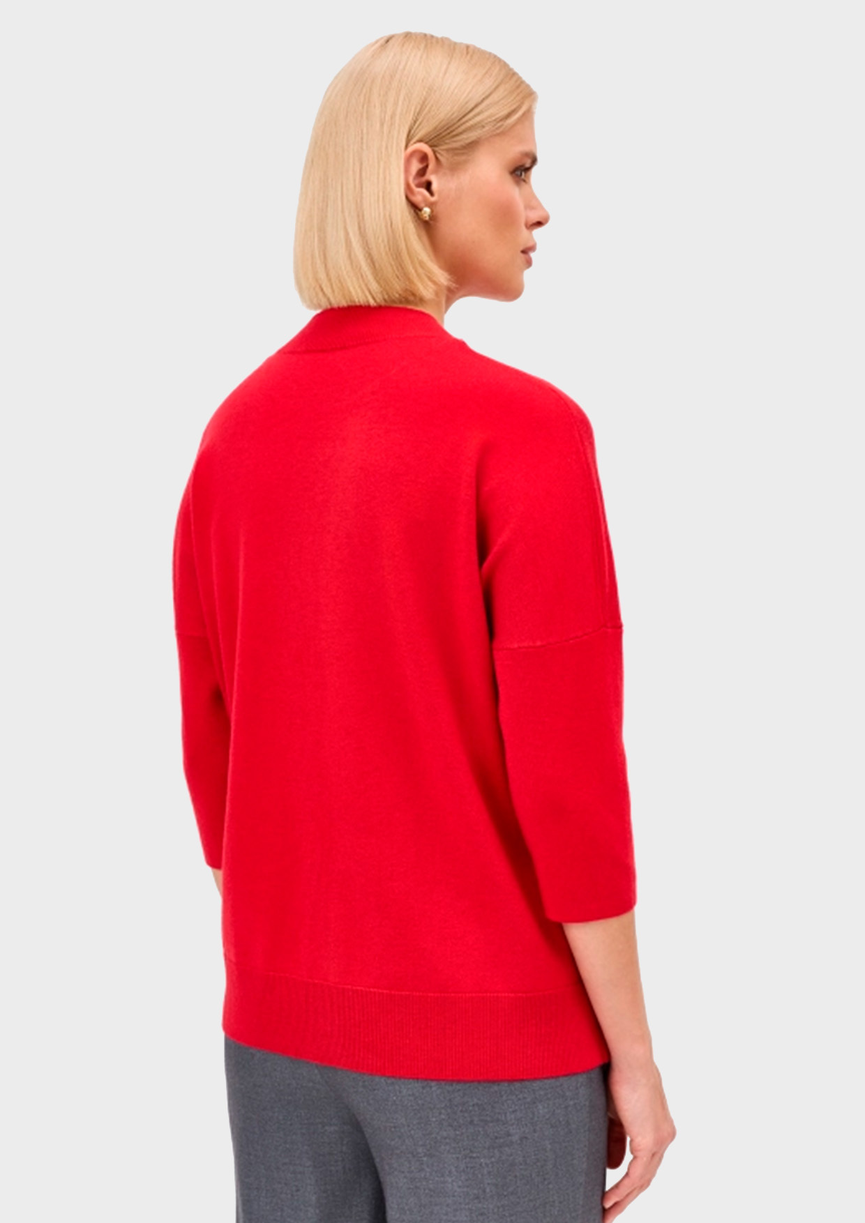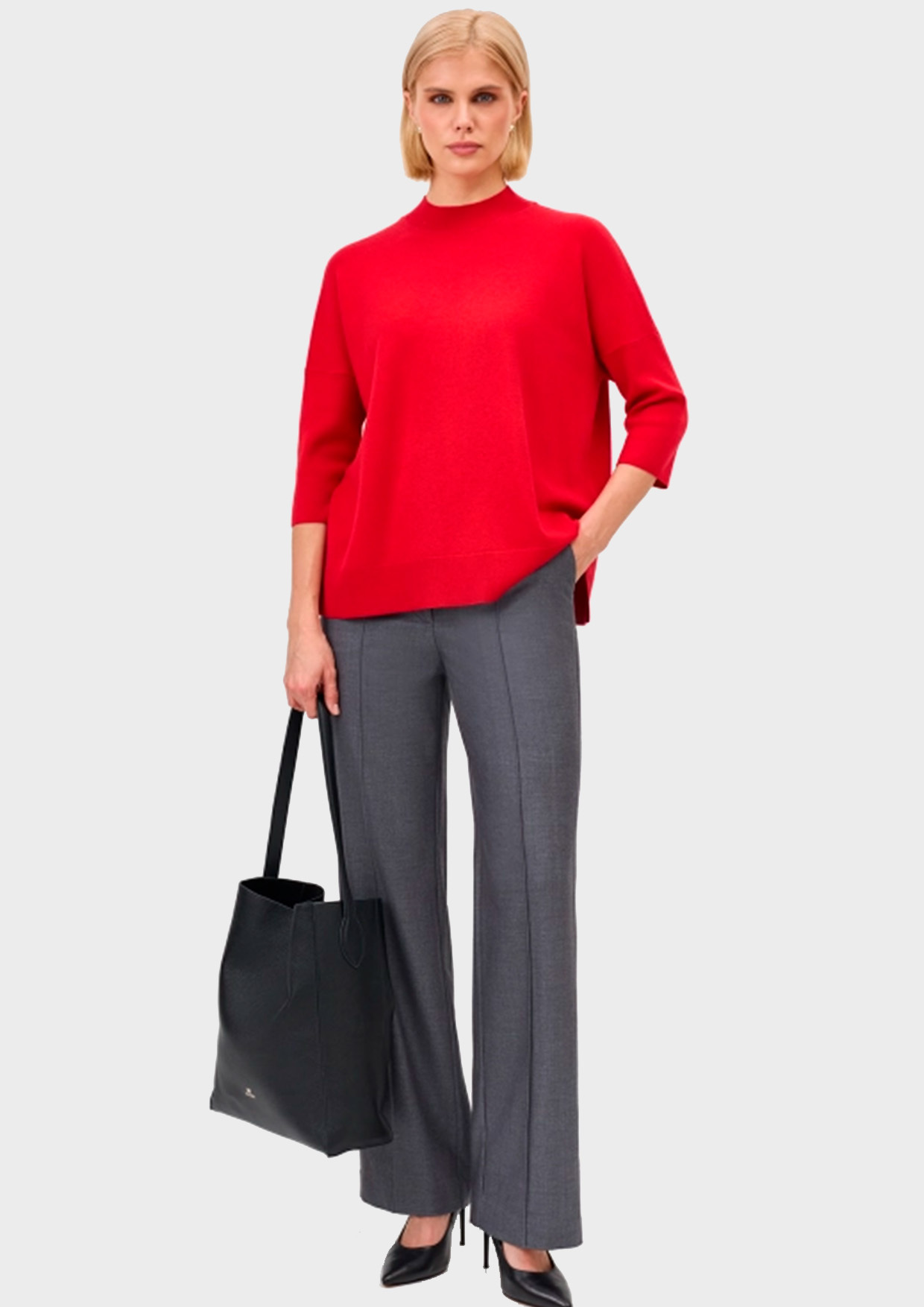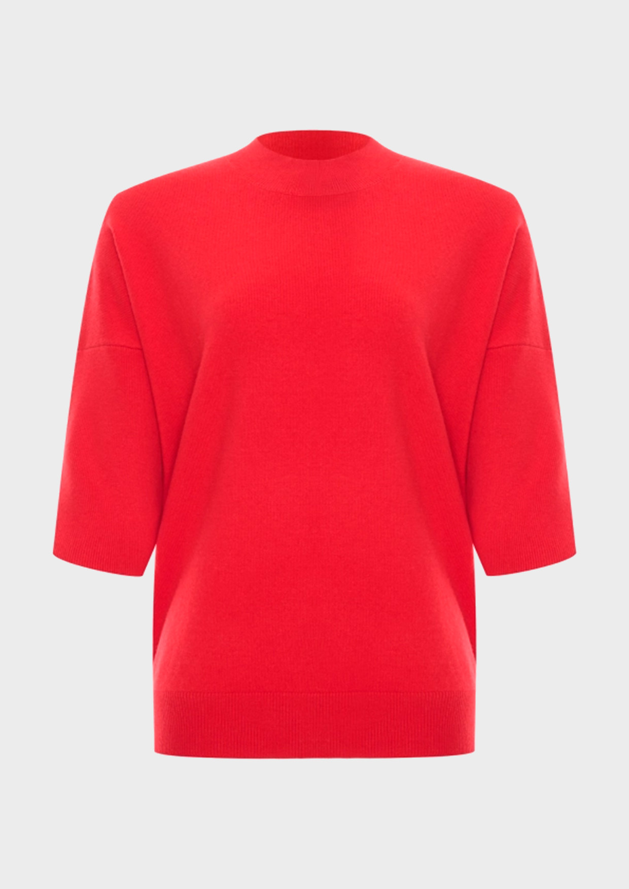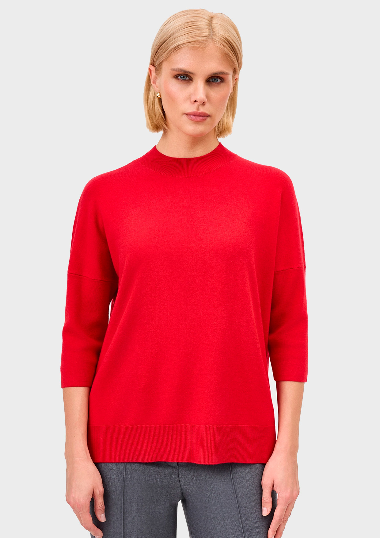 Яркий джемпер с укороченными рукавами. Свободный силуэт. Спущенная линия плеч. Воротник стойка. Рукава 3/4. В составе вискоза и ангора.