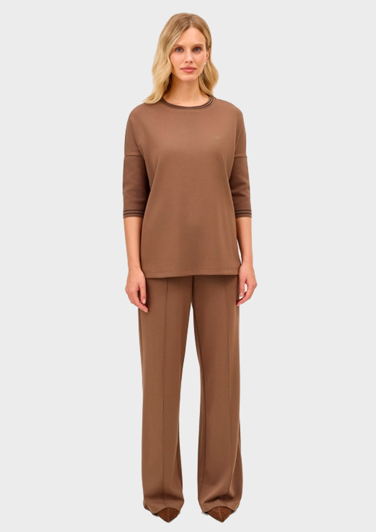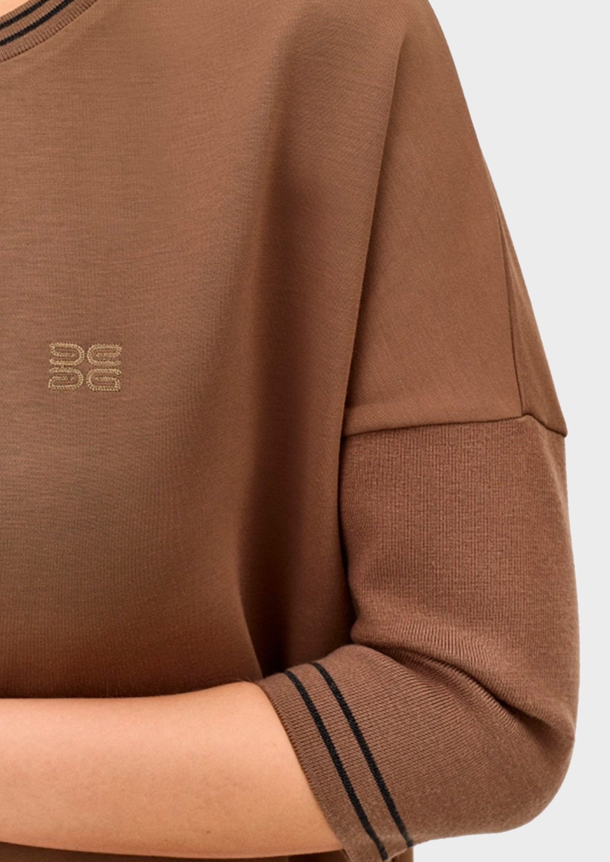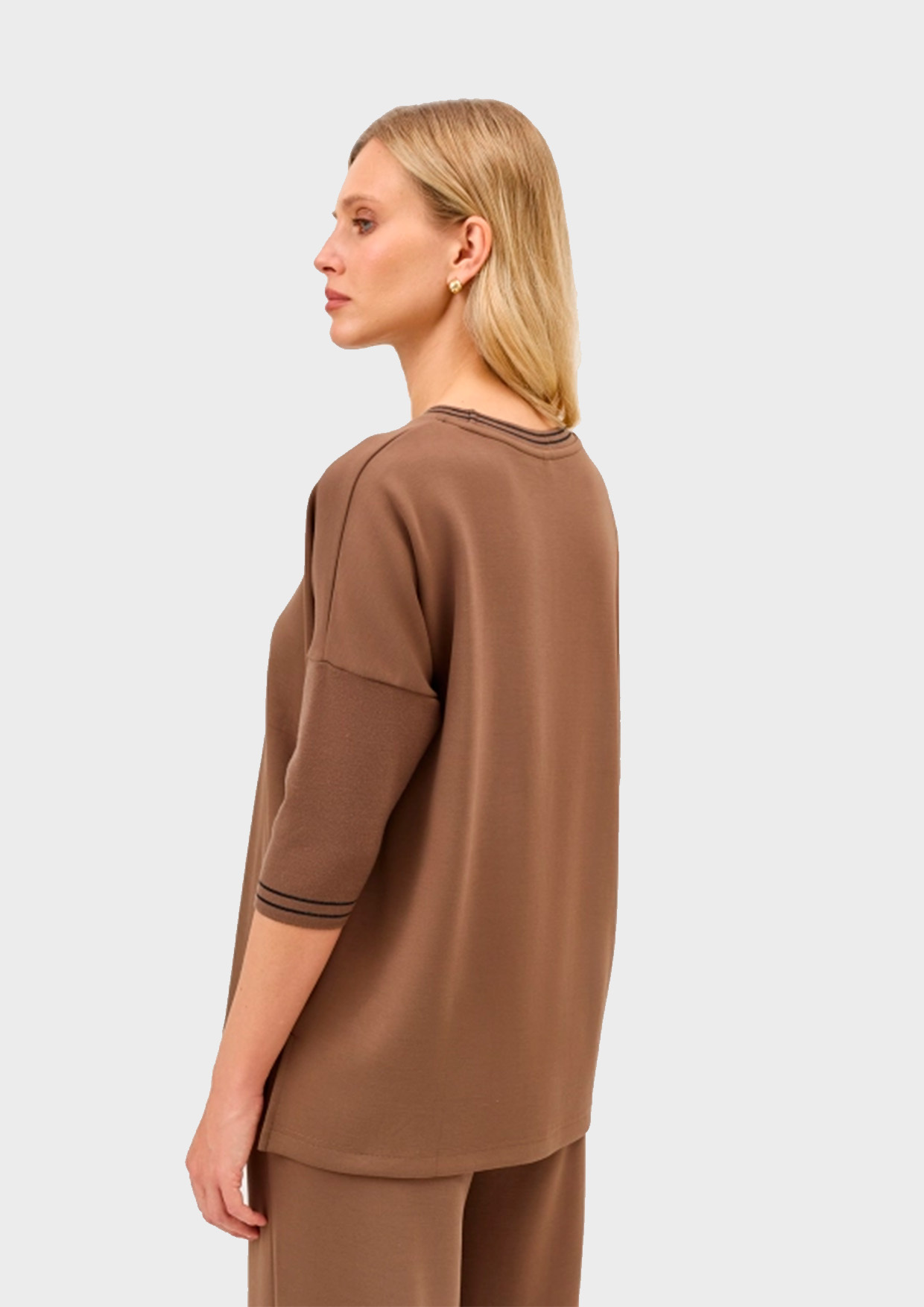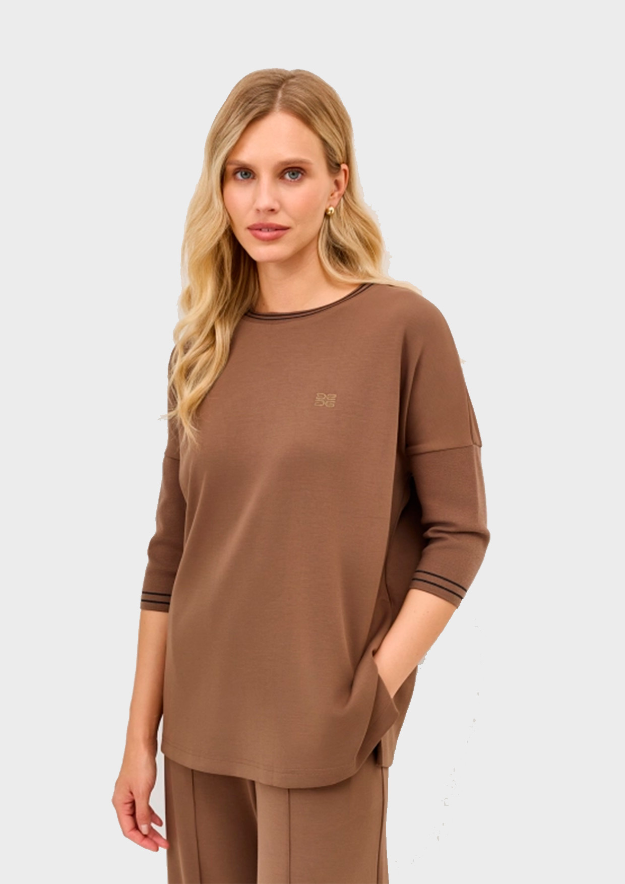 Свободный трикотажный джемпер с укороченными рукавами 3/4. Круглый вырез. Контрастный кант по низу рукавов и горловине. Спущенная линия плеч. Боковые разрезы в швах. Минималистичная вышивка на груди