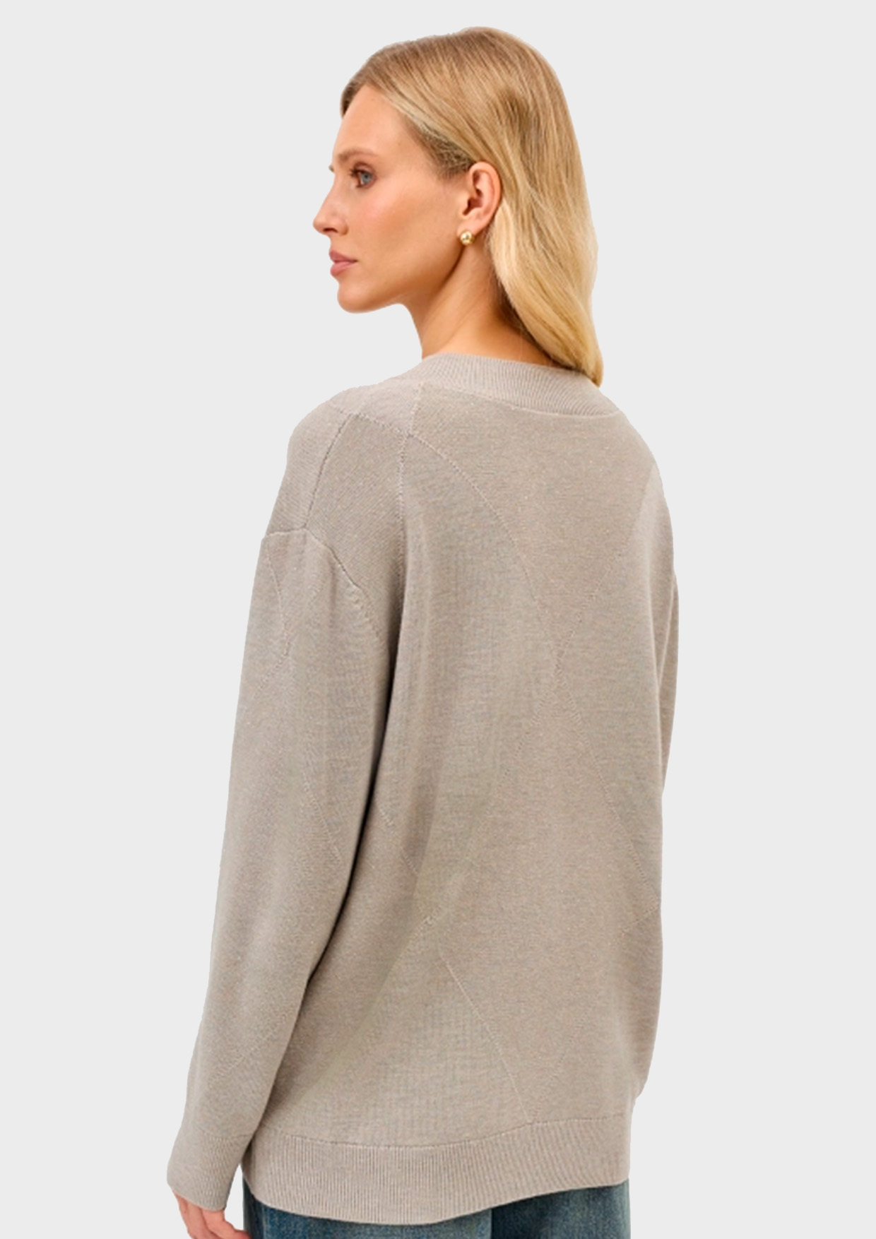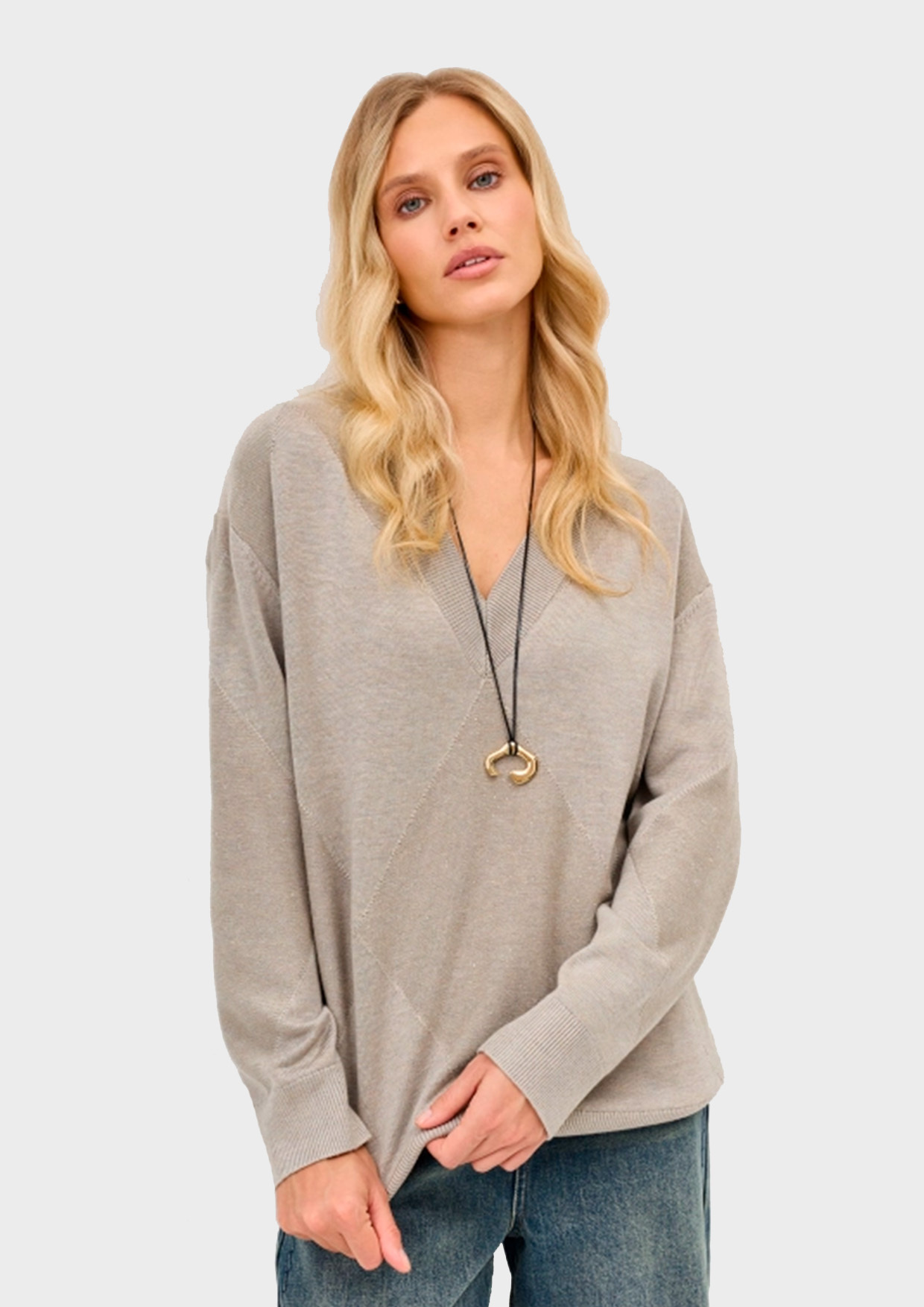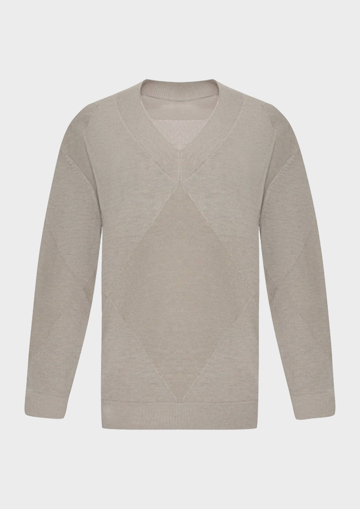 Джемпер-туника с V-образным вырезом. Свободный силуэт. Спущенная линия плеч. Риб по горловине, низу рукавов и изделия. Дополнен узором крупными ромбами с мерцающими пайетками. В составе шерсть.