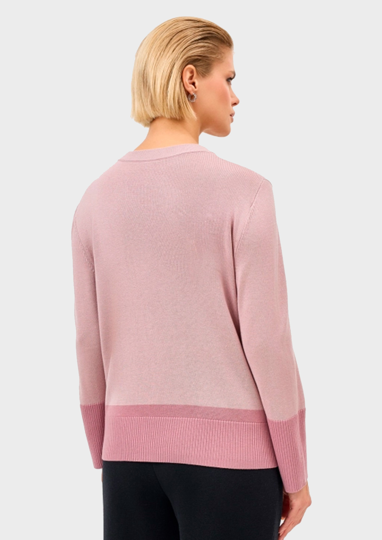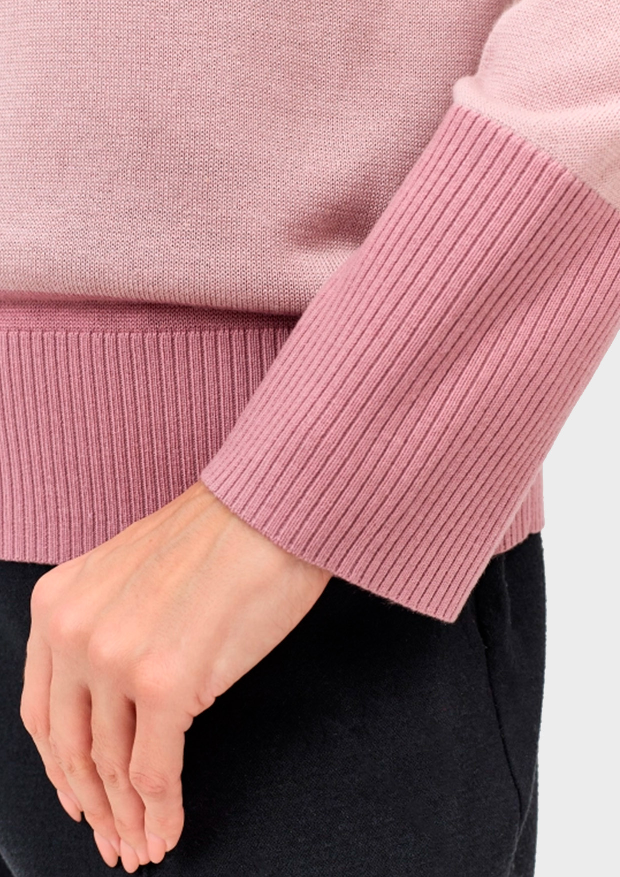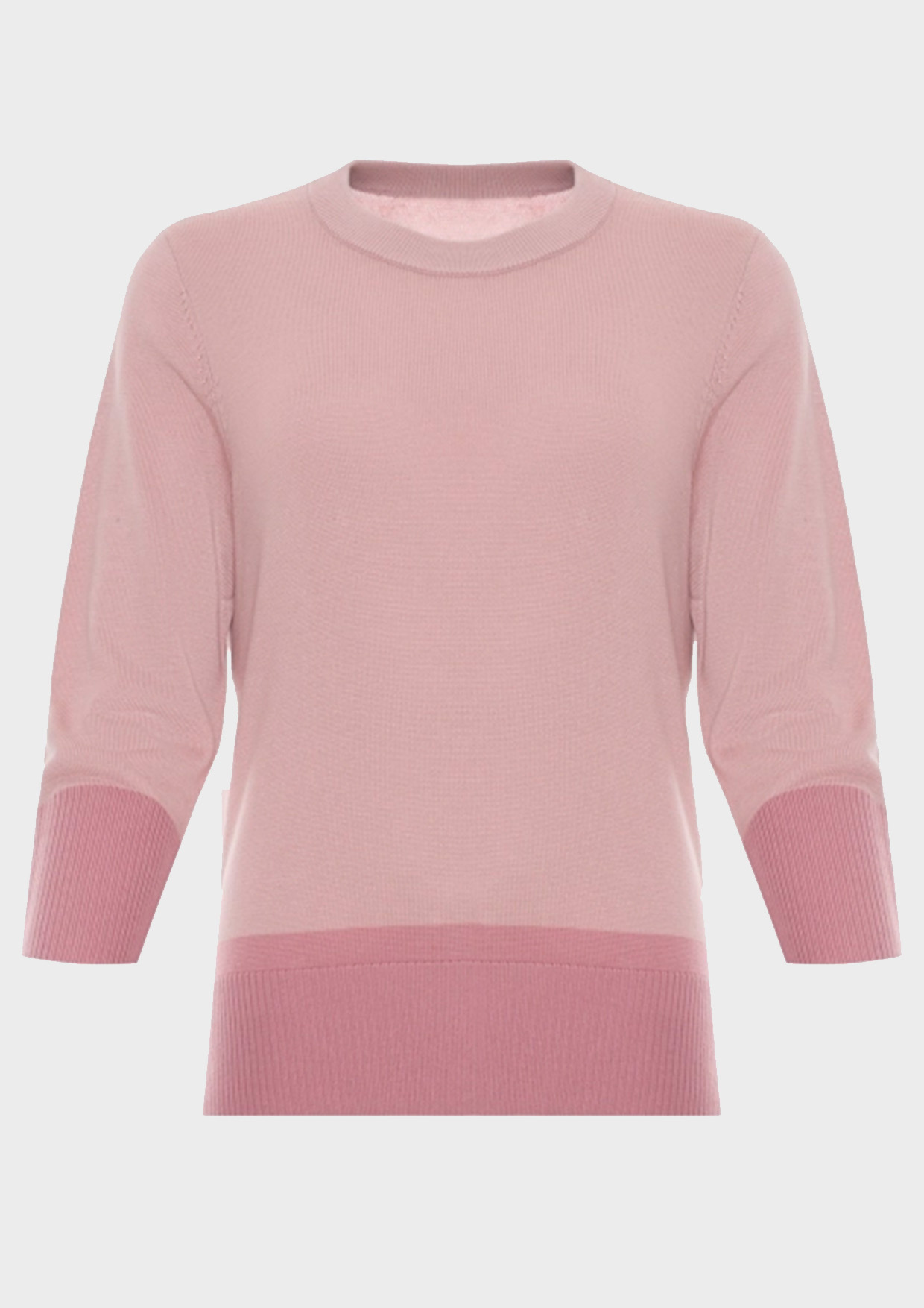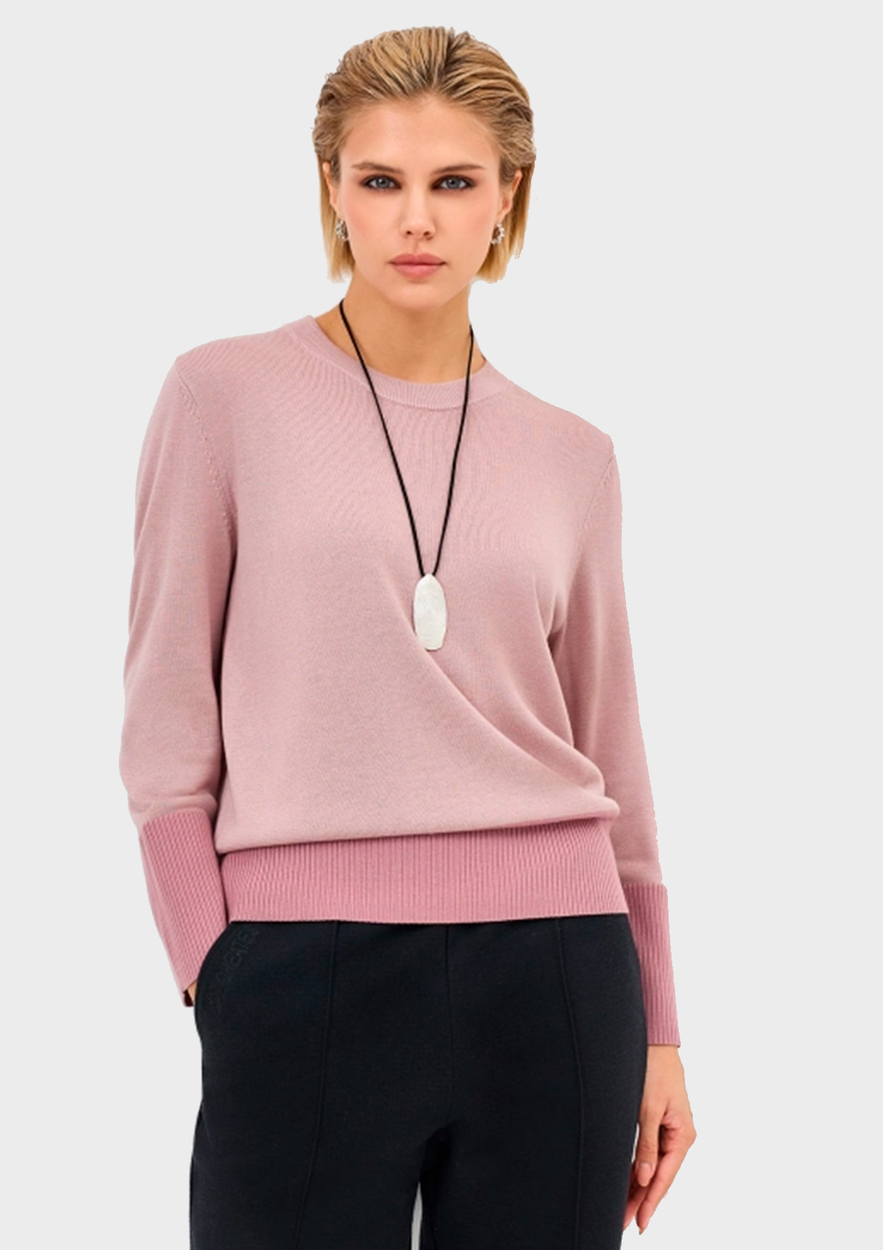 Свободный джемпер с шерстью и шелком в составе. Круглый вырез. Рукава немного укорочены и расширены к низу. Широкий контрастный риб по низу рукавов и изделия.