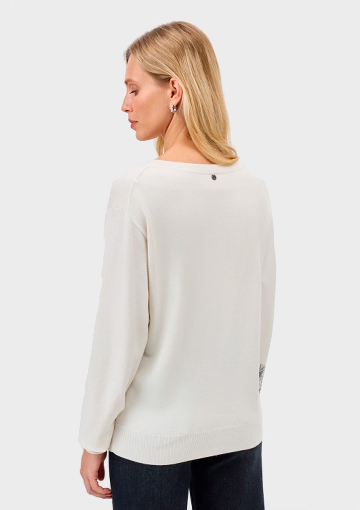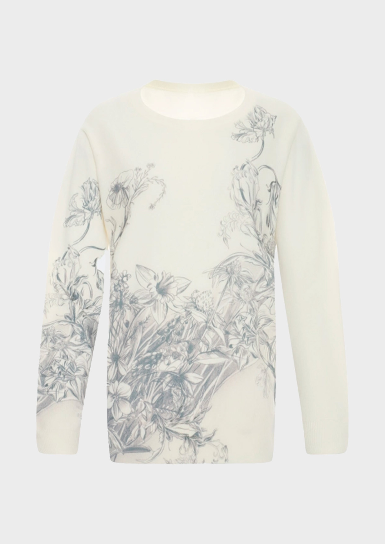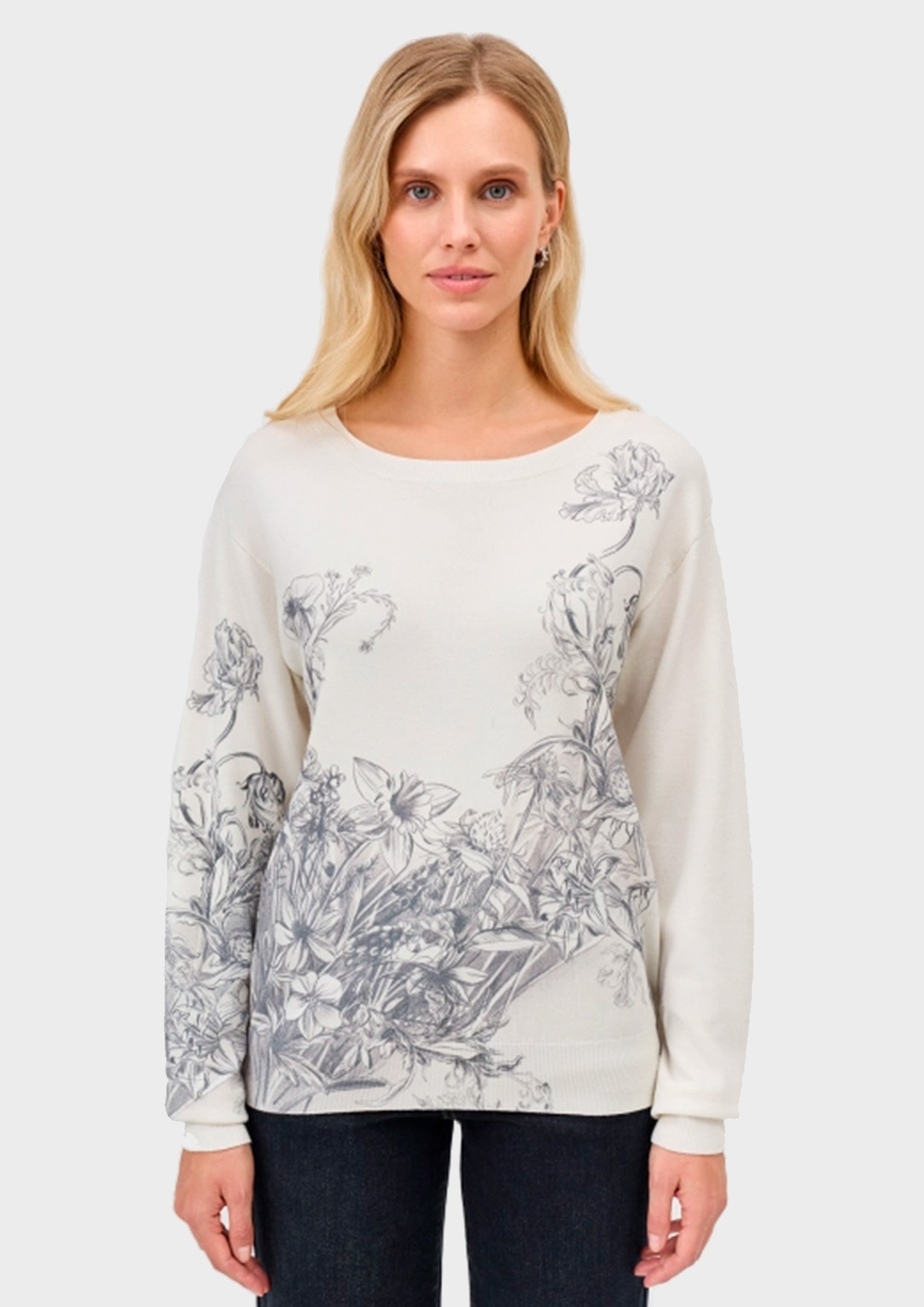 Вязаный джемпер с деликатным цветочным принтом из смесовой вискозы. Прямой силуэт. Вырез лодочка. Линия плеч немного спущена. В составе шерсть.