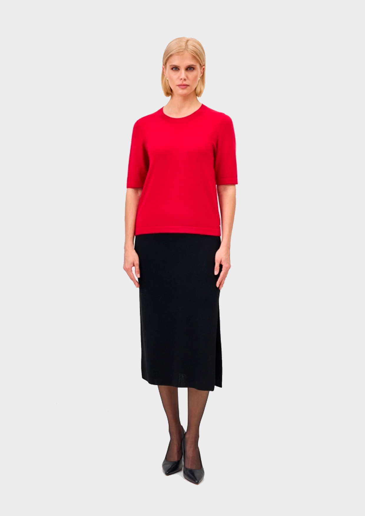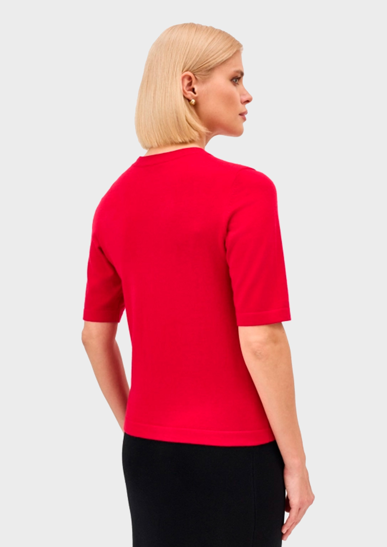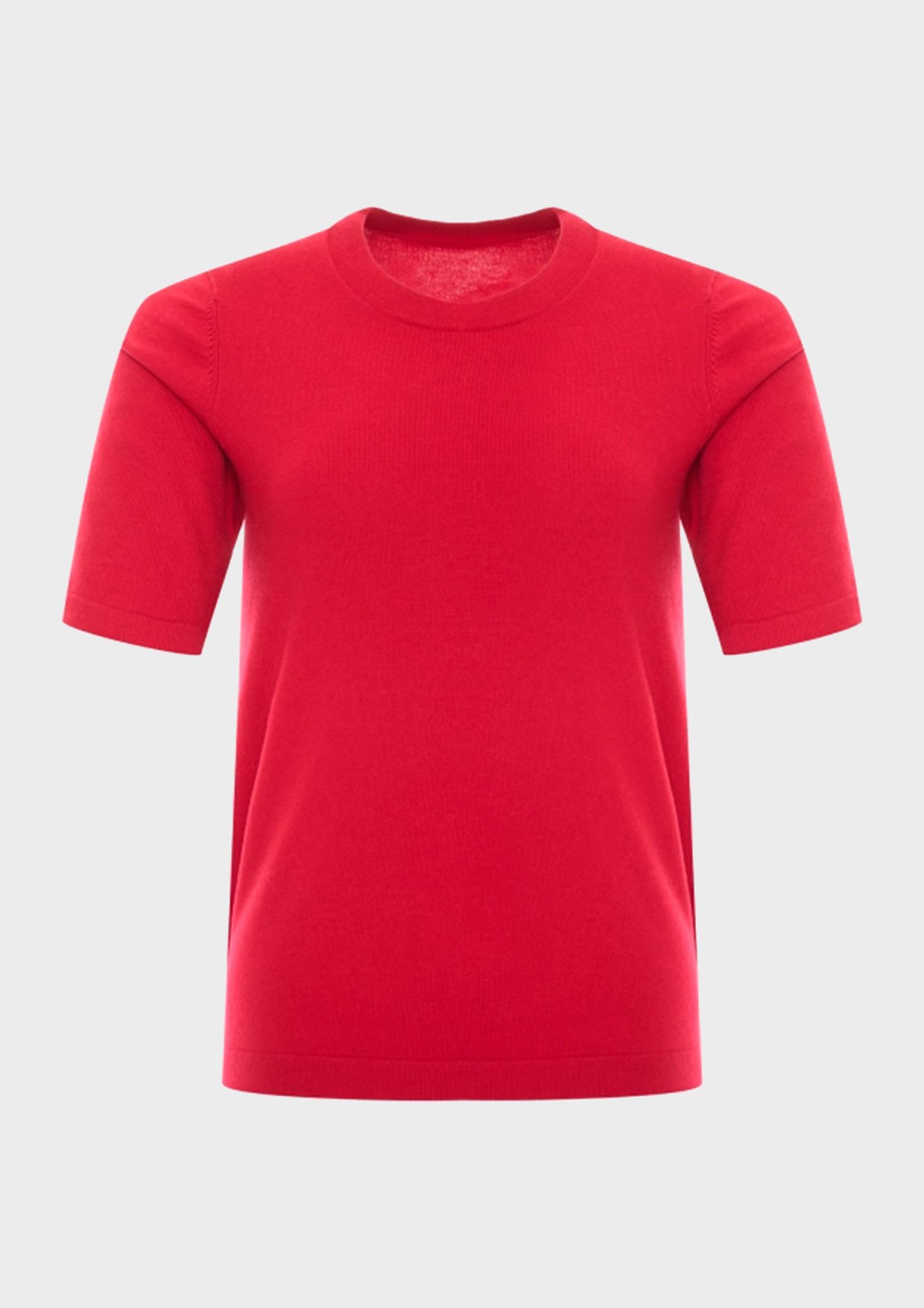Базовый вязаный джемпер с укороченными рукавами с широкими манжетами и кашемиром в составе. Прямой силуэт. Круглый вырез. Спущенная линия плеча. Дополнен минималистичным металлическим шильдом.