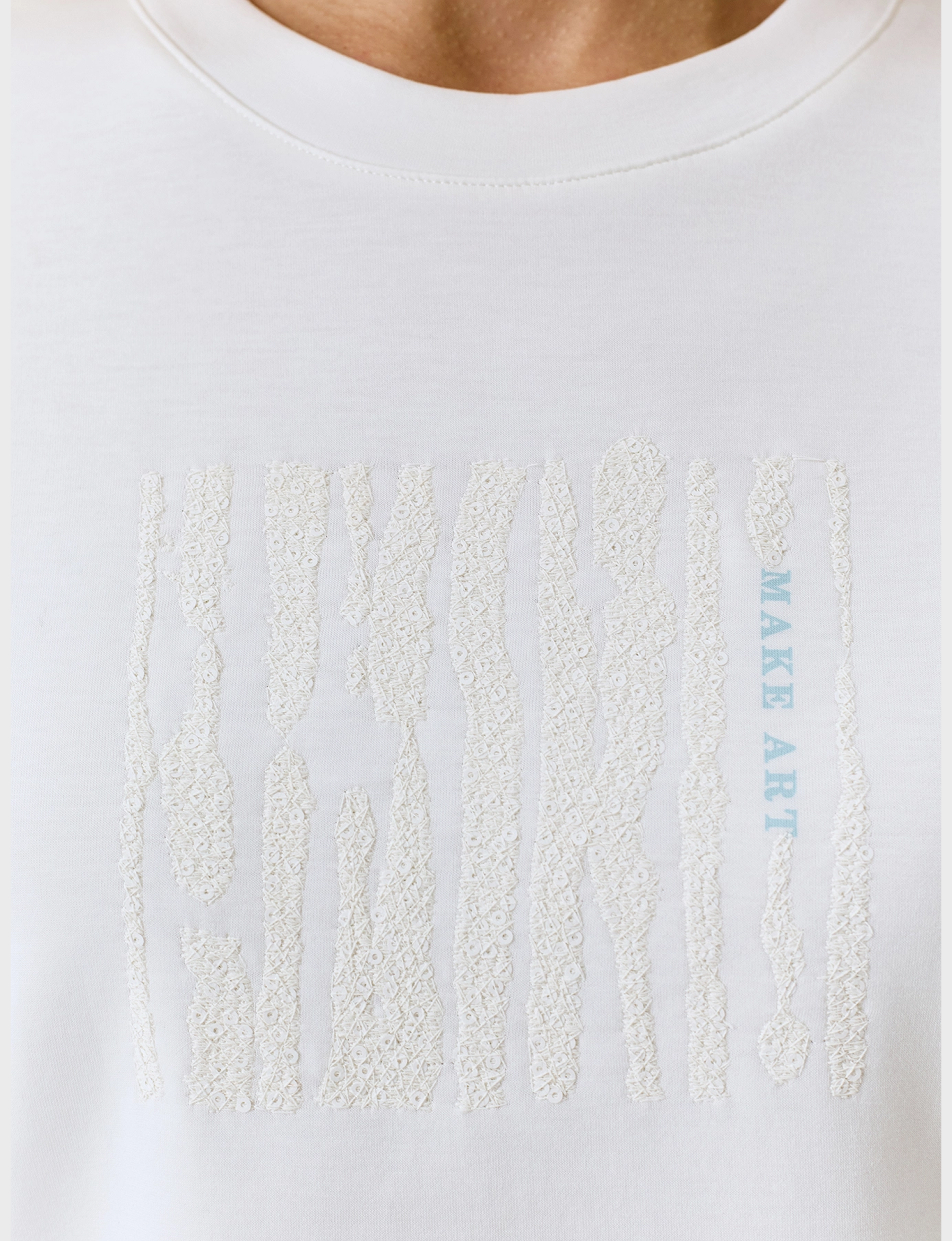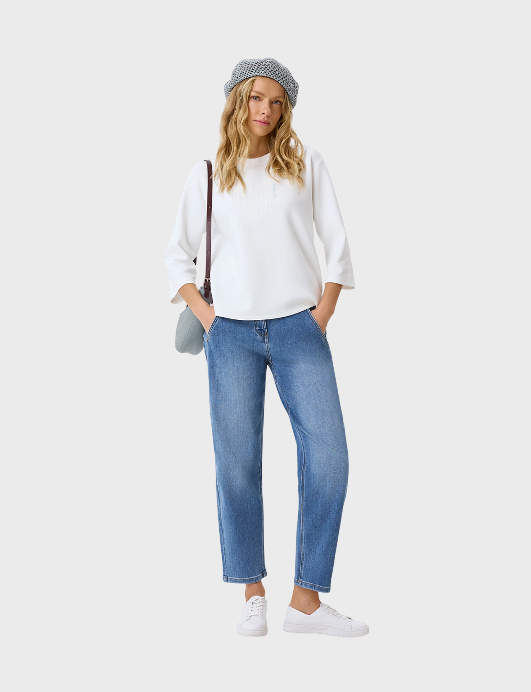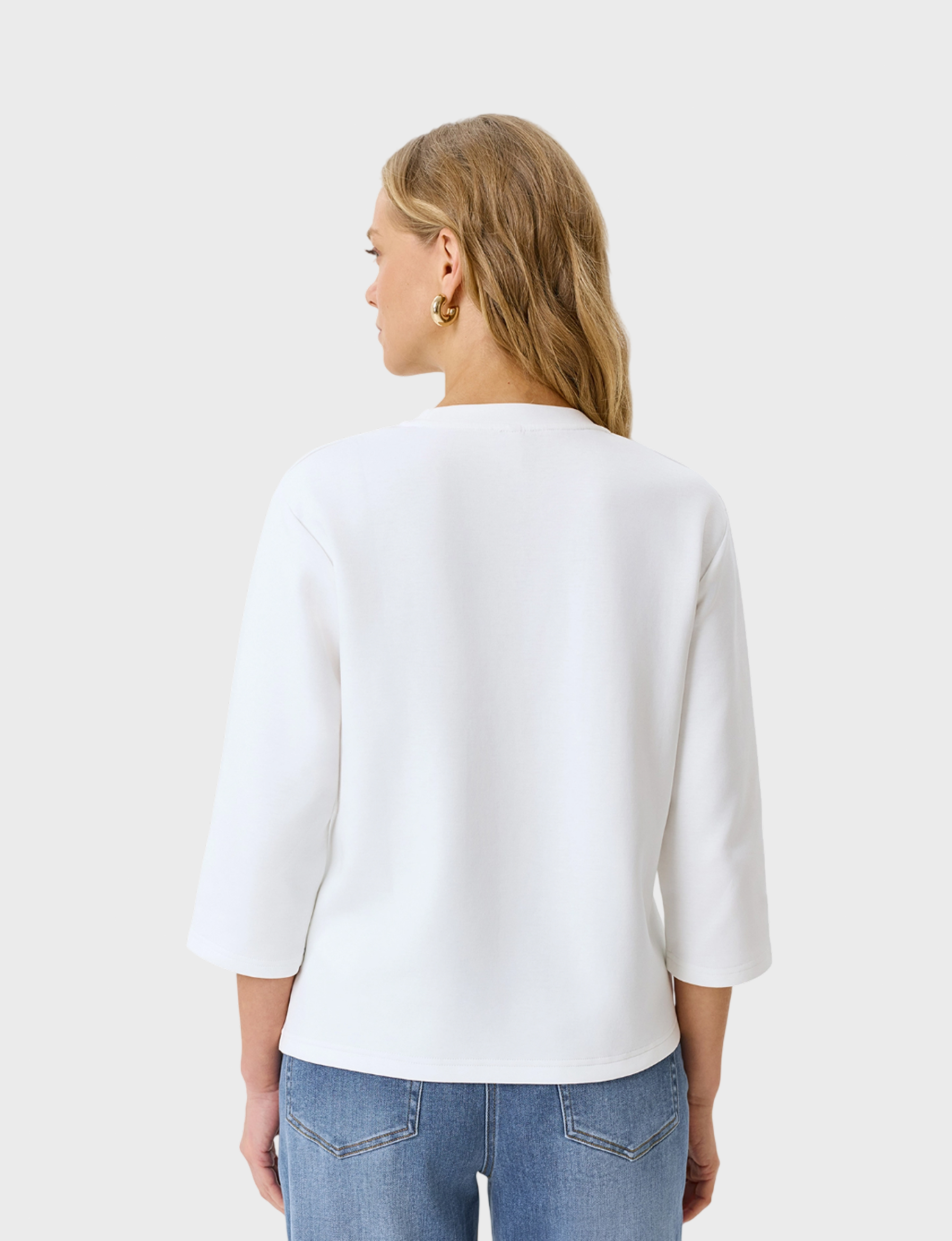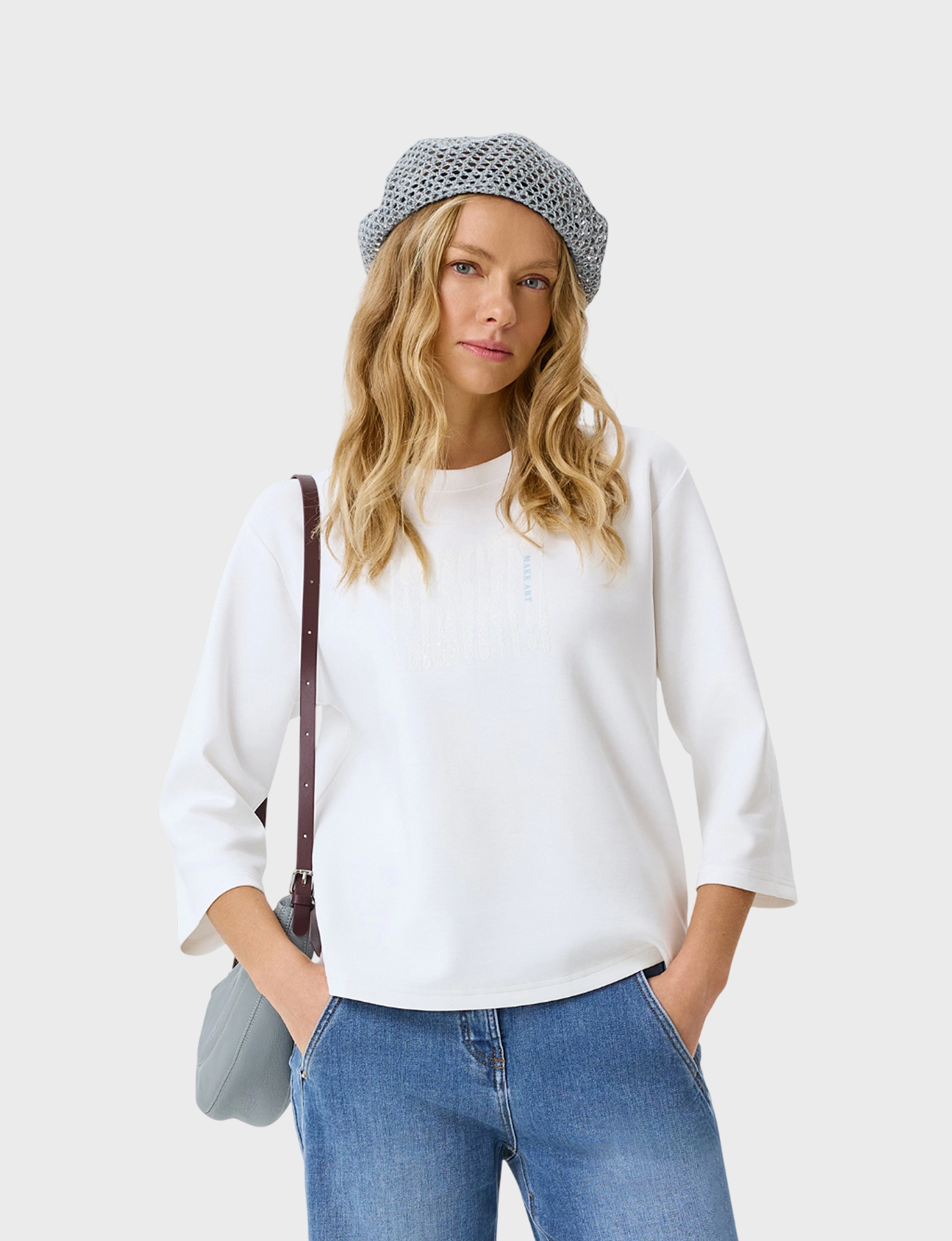 Трикотажный Oversize джемпер с укороченными рукавами 3/4. Свободный силуэт. Линия плеч немного спущена. Круглый вырез. Дополнен мерцающей вышивкой. В составе хлопок и модал.