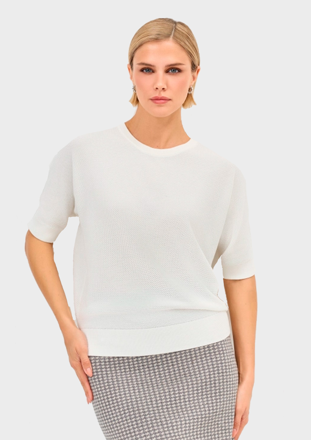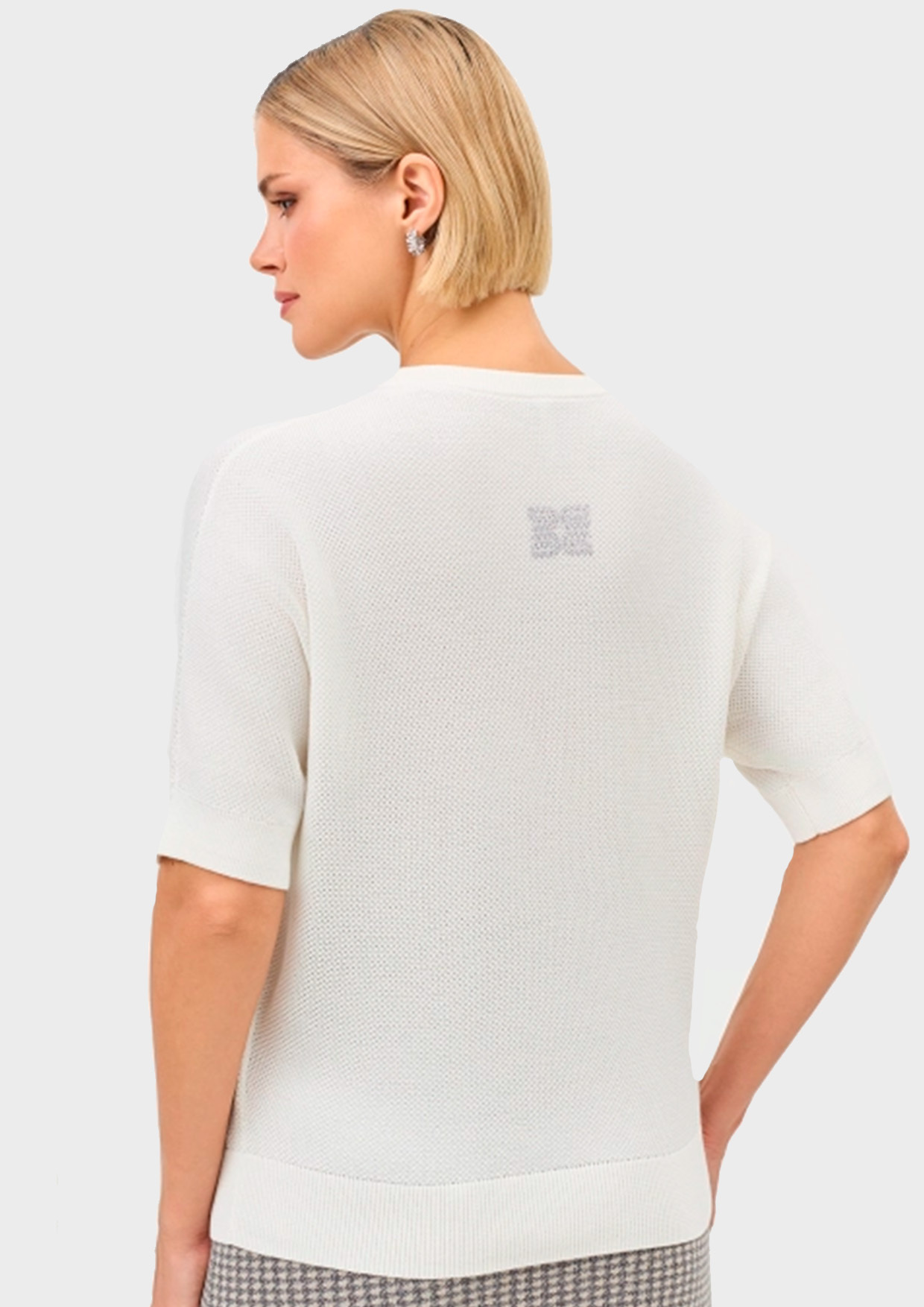Базовый вязаный джемпер. Свободный силуэт. Круглый вырез. Короткие цельнокроенные рукава с манжетами. Деликатная аппликация на спинке. В составе хлопок и модал.