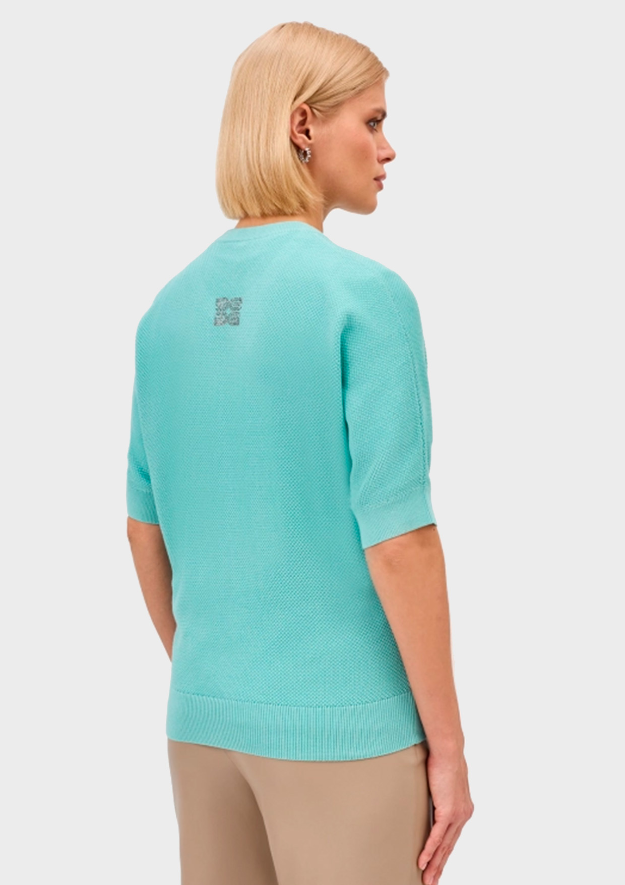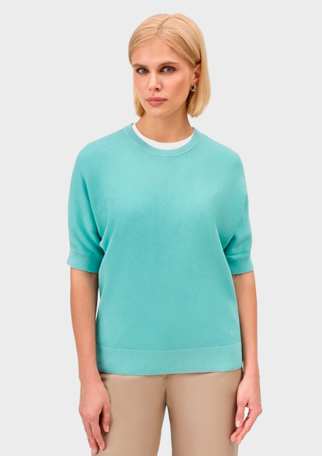 Базовый вязаный джемпер. Свободный силуэт. Круглый вырез. Короткие цельнокроенные рукава с манжетами. Деликатная аппликация на спинке. В составе хлопок и модал.