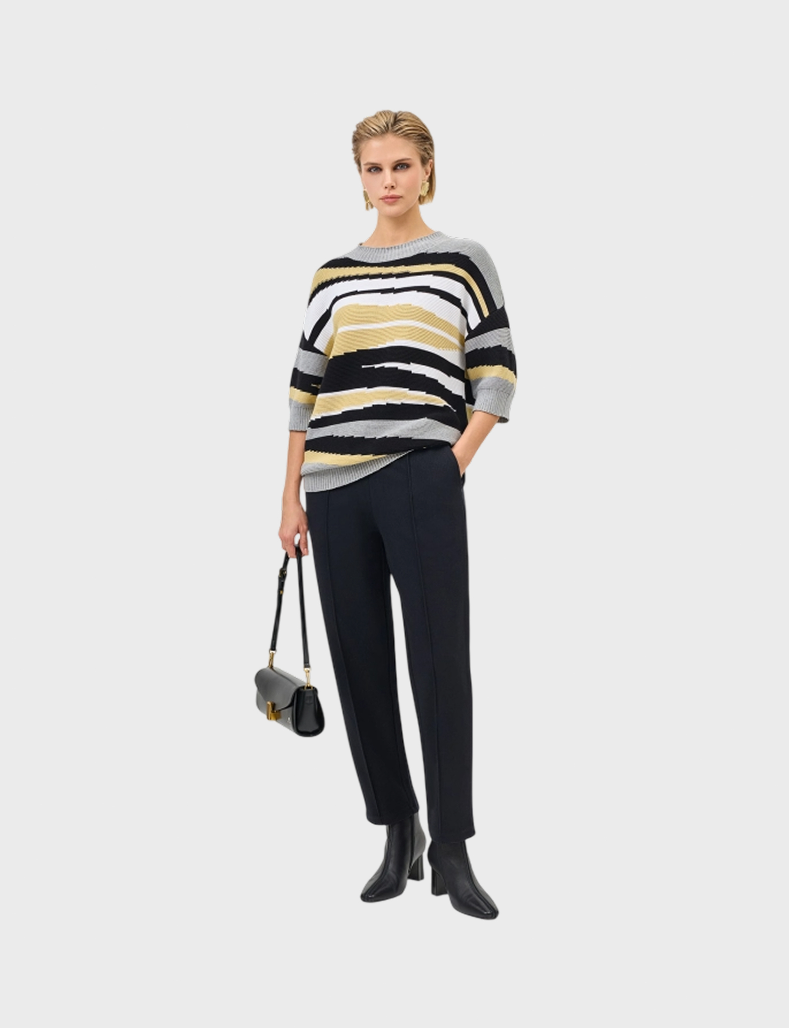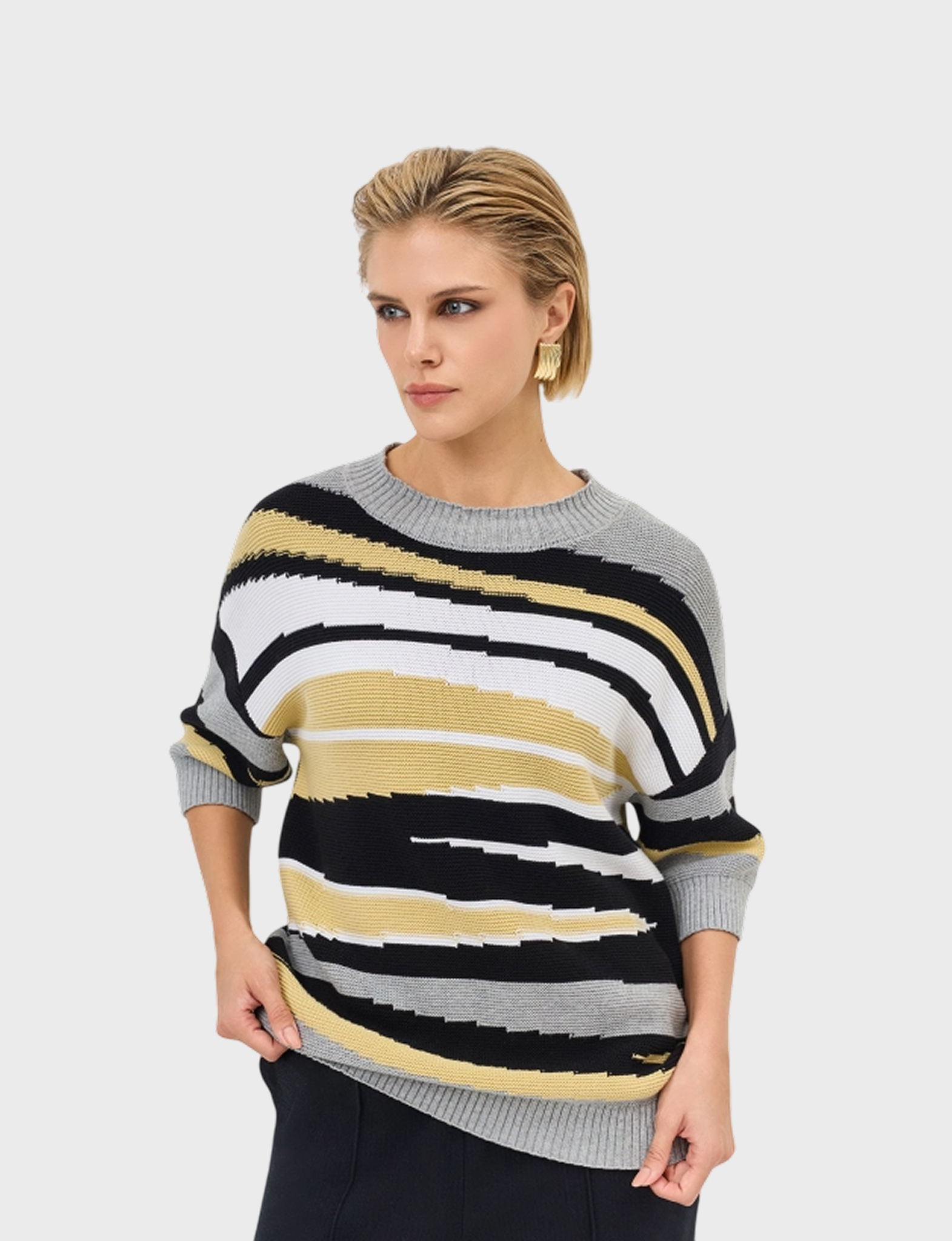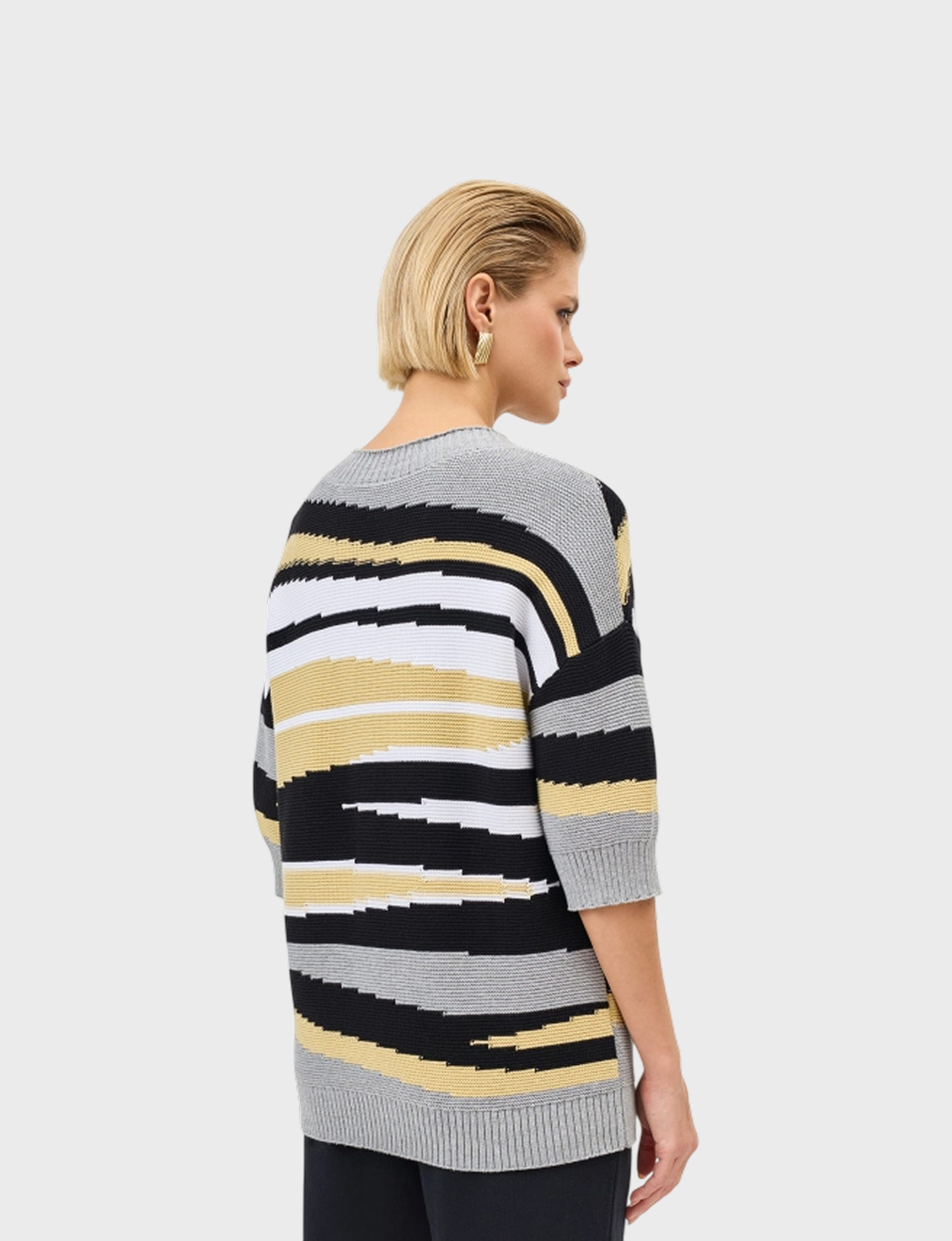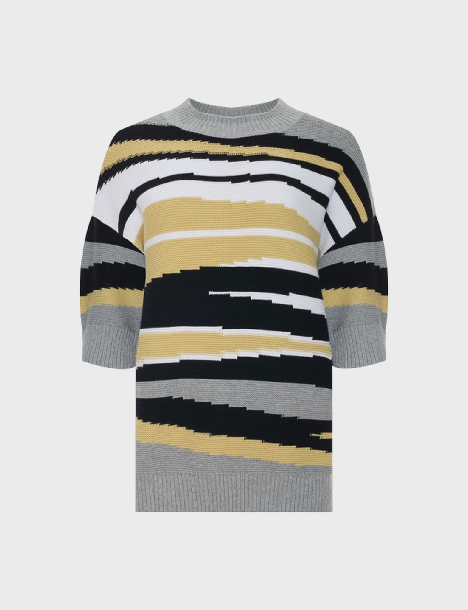 Джемпер из 100% хлопка ярким контрастным геометрическим принтом. Свободный силуэт. Круглый вырез. Спущенная линия плеч. Укороченные рукава с манжетами по низу.