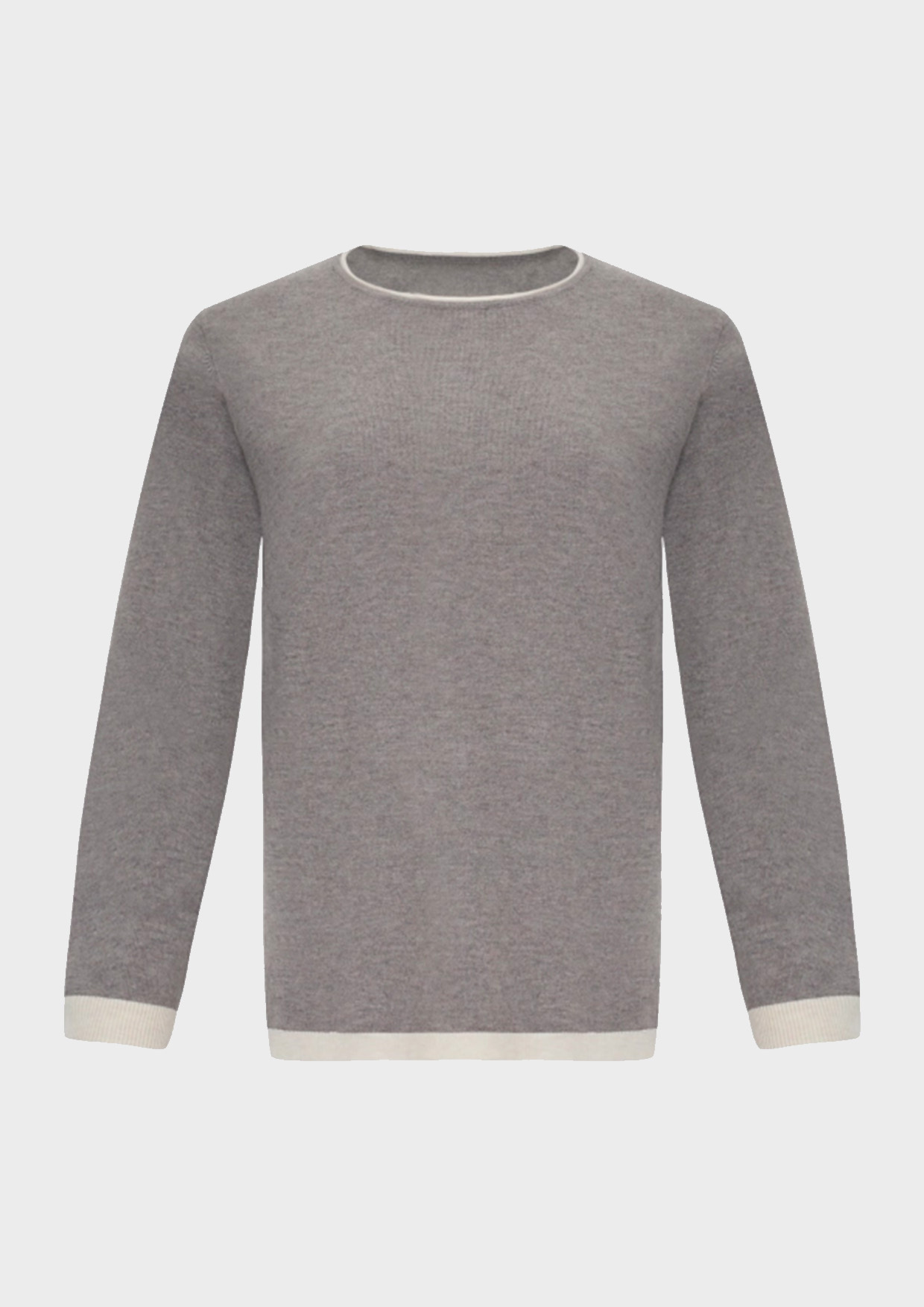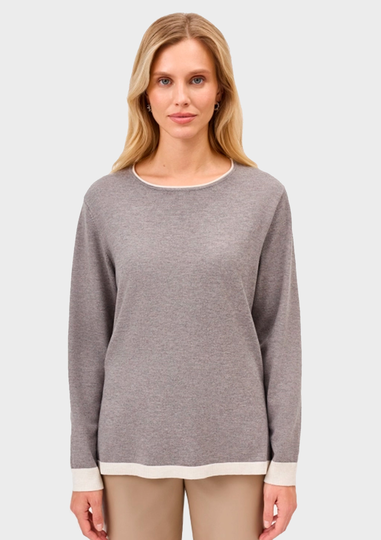 Джемпер с контрастными лампасами в боковых швах. Свободный силуэт. Круглый вырез. Высокие разрезы в боковых швах. Контрастные отделка по горловине и низу изделия и низу рукавов. В составе хлопок и шерсть.