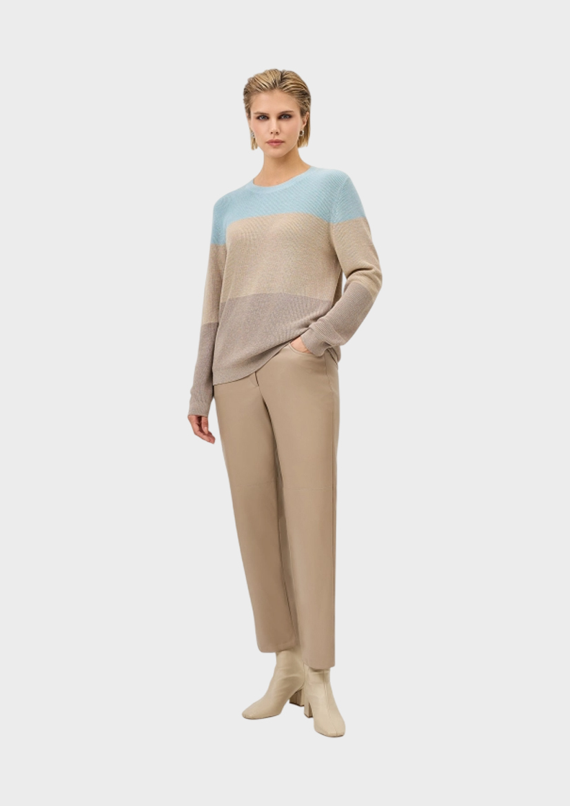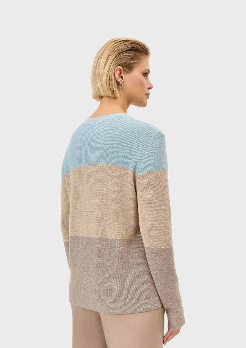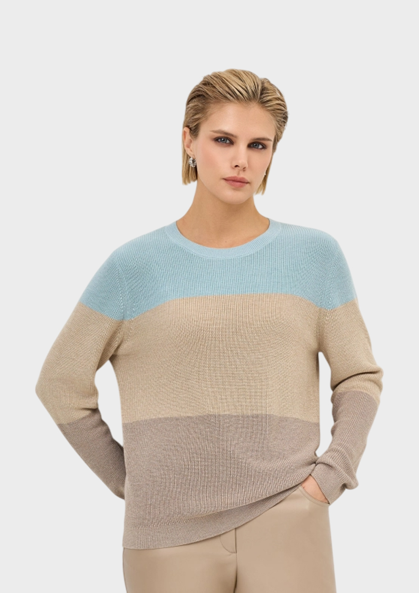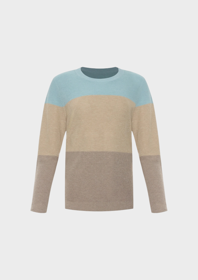 Джемпер в яркую широкую полоску Сolor block. Свободный силуэт. Круглый вырез. Фактурная вязка дополнена деликатным люрексом. В составе вискоза и кашемир.