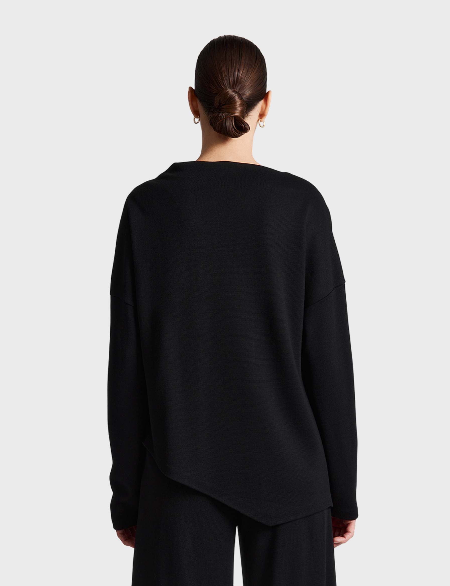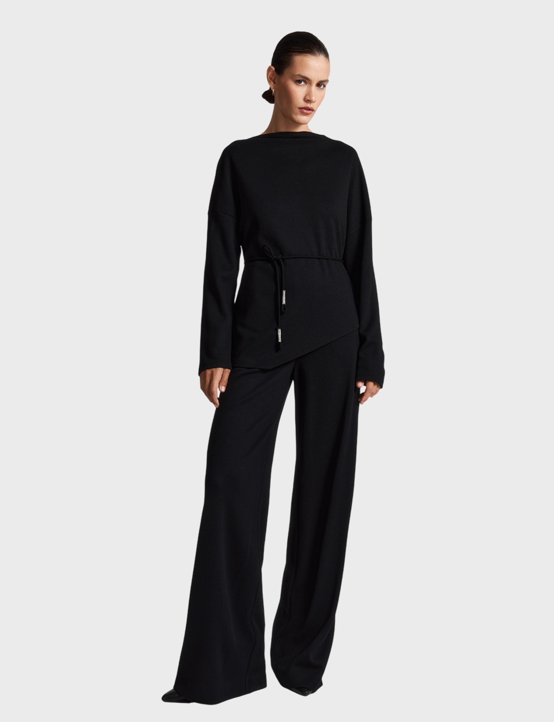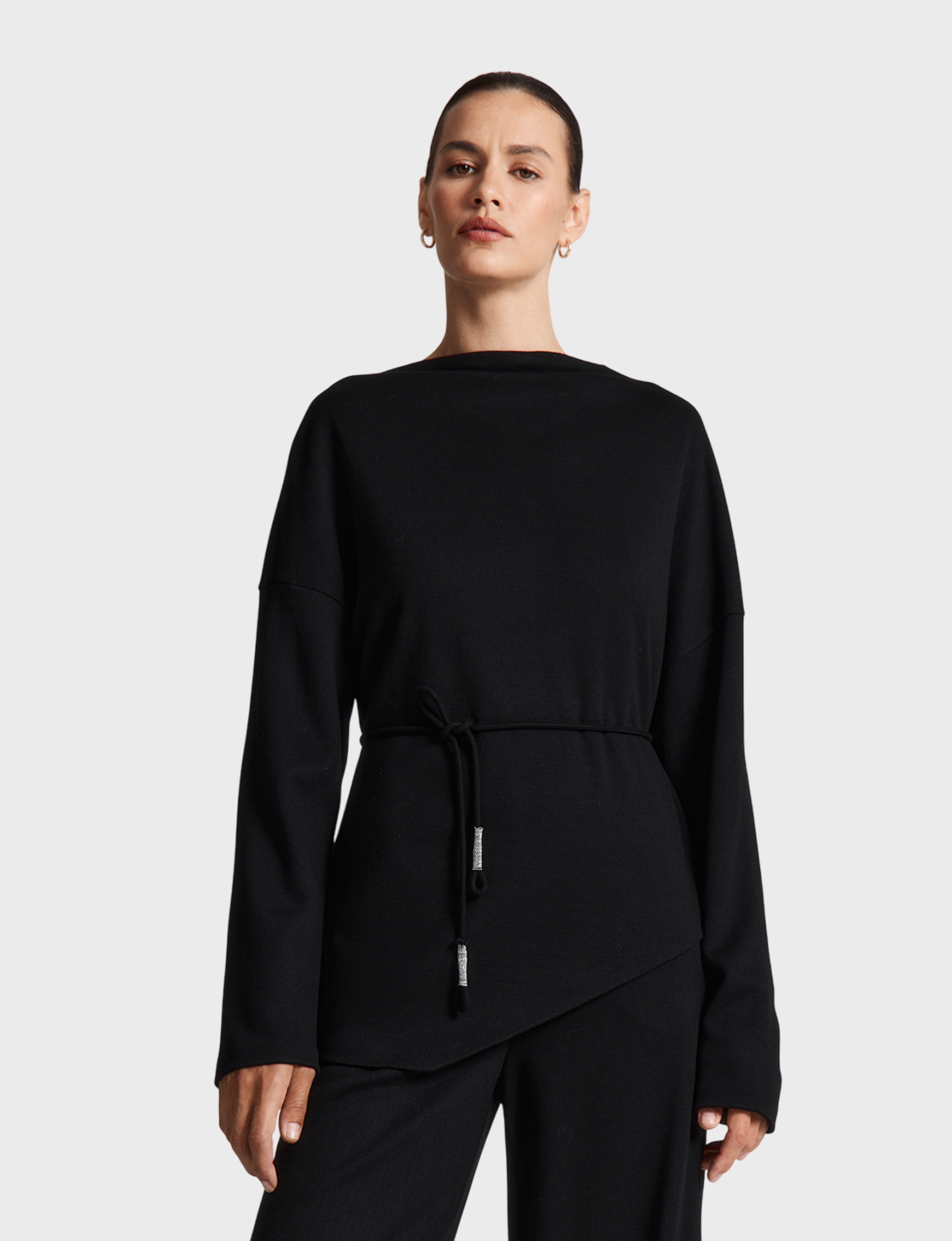Блуза полуприлегающего силуэта сшита из высокотехнологичного трикотажа с хлопком и шерстью. Полотняное переплетение оптимальной плотности создает комфортный трикотаж, держащий форму.