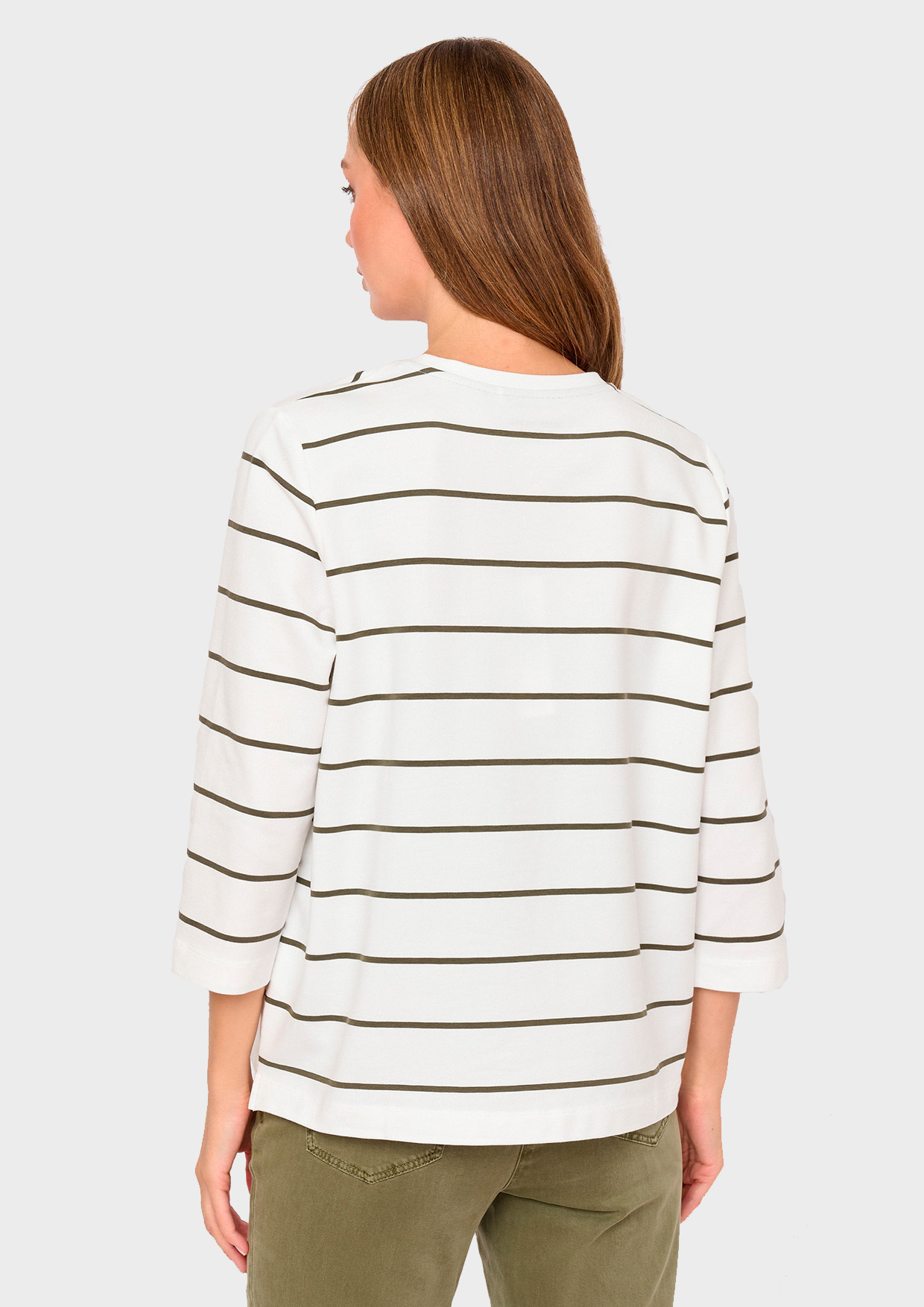 Джемпер с рукавом 3/4 и округлым вырезом — стильная модель в полоску с контрастным принтом листьев. Гармоничное сочетание базового рисунка и акцентного декора делает эту вещь универсальной для повседневного гардероба. Мягкий материал и прямой крой обеспечивают комфорт в носке.