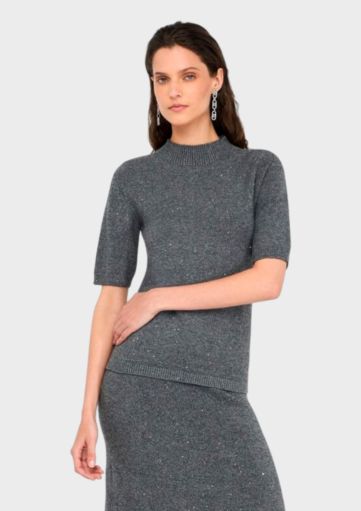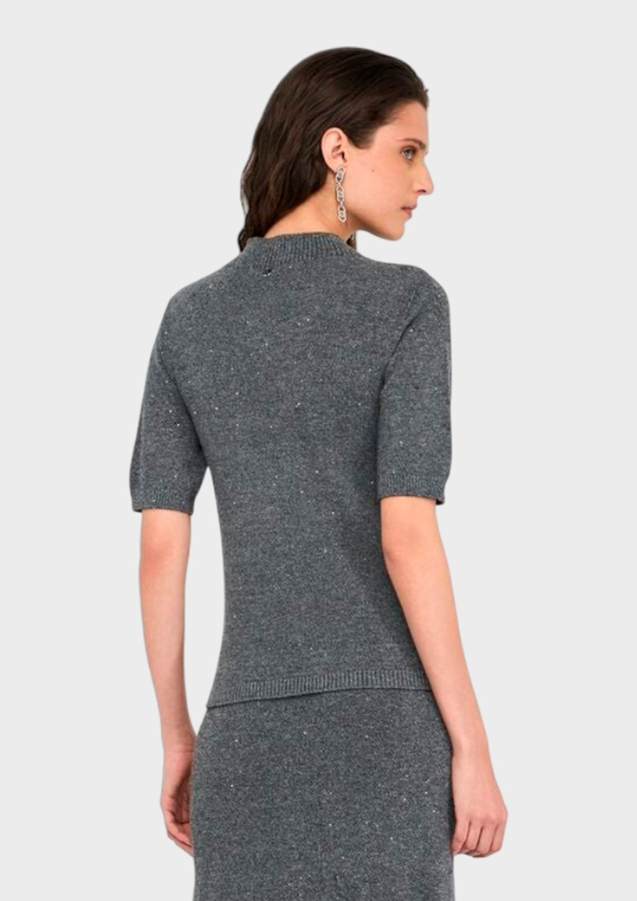 Мягкая ткань из смеси вискозы, полиэстера и эластана обеспечивает комфорт при носке, а мелкие пайетки добавляют элегантного блеска и делают образ неповторимым. Идеален как база под жакет или куртку, прекрасно смотрится сам по себе.