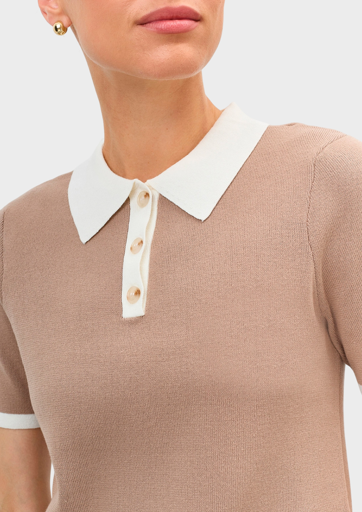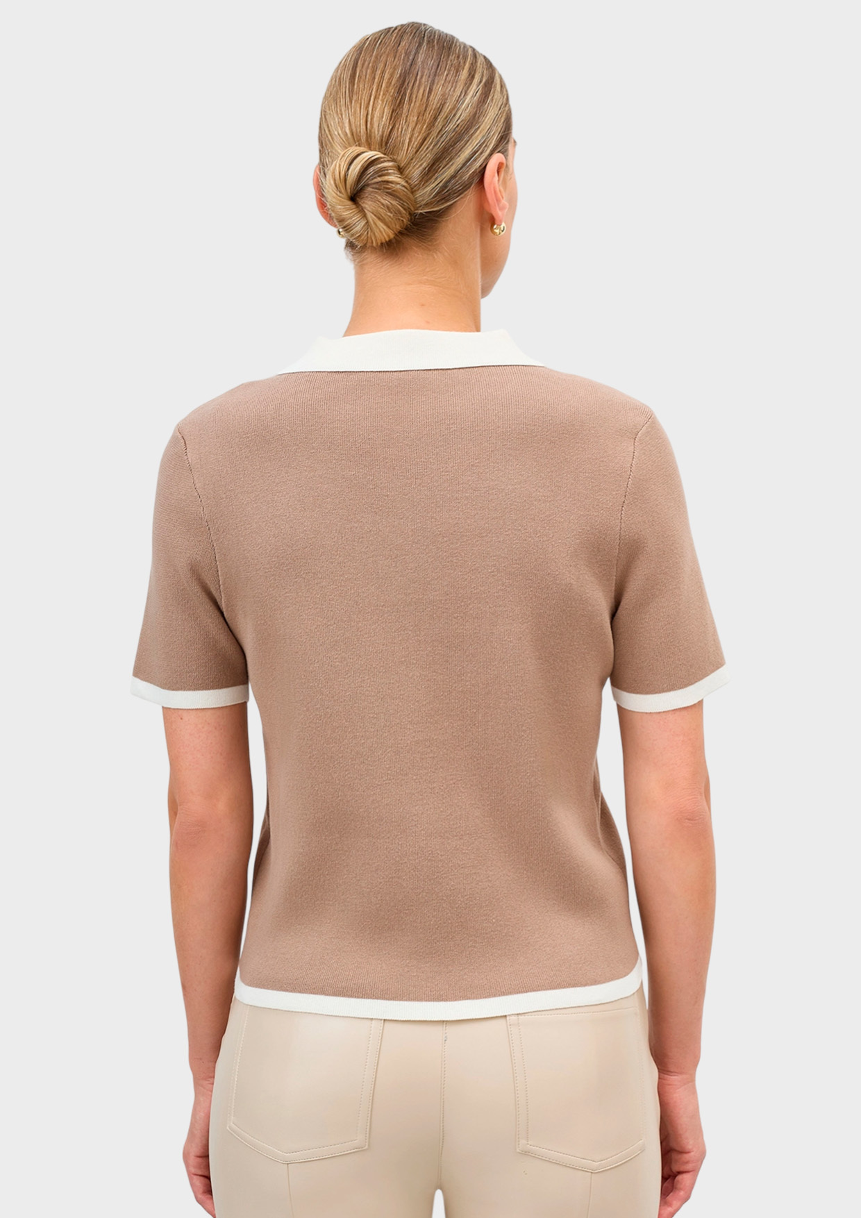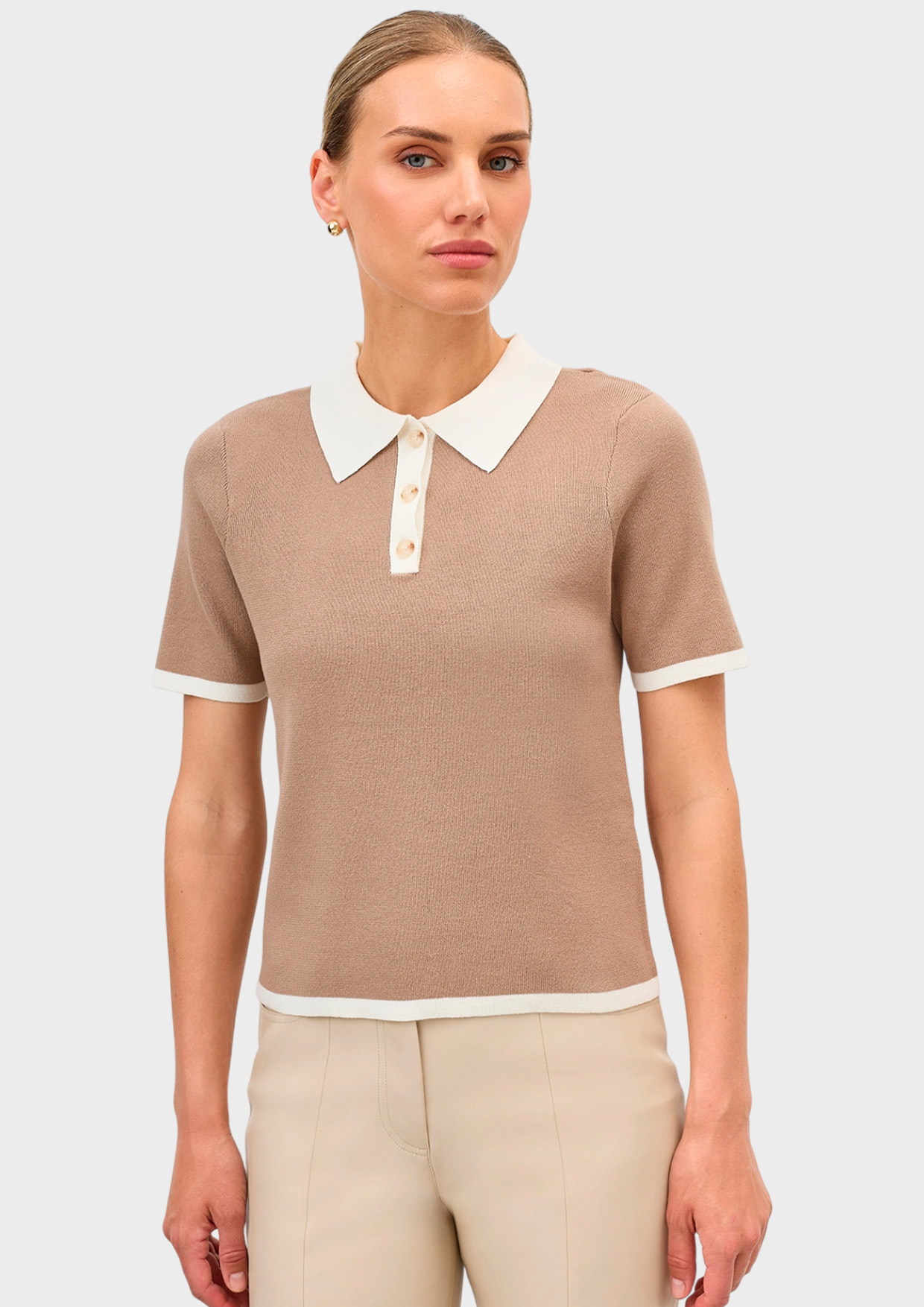 Укороченный джемпер с контрастными деталями. Классический прямой силуэт. Воротник поло контрастного цвета. Короткие рукава. В составе хлопок и нейлон.