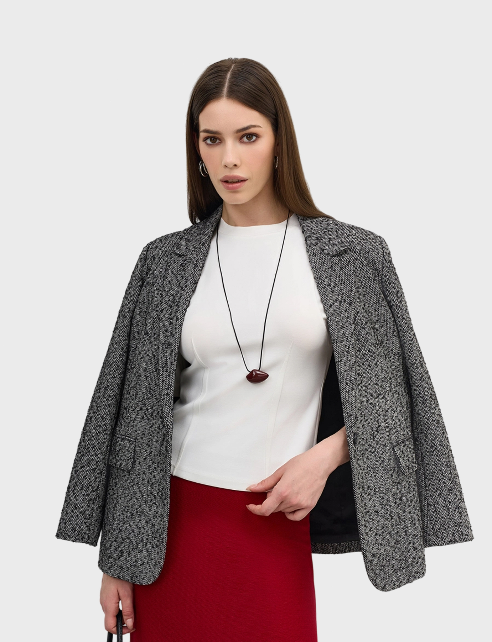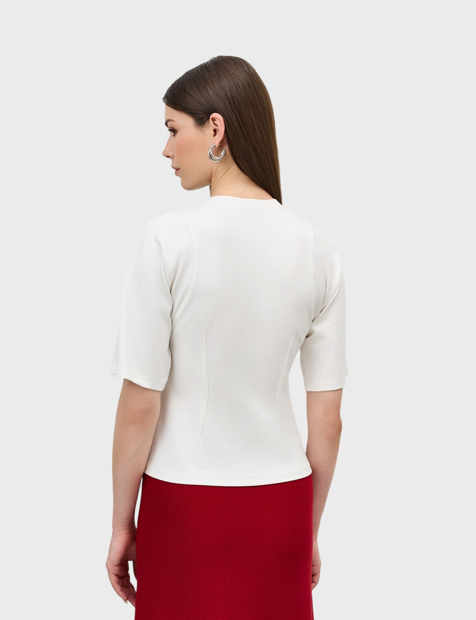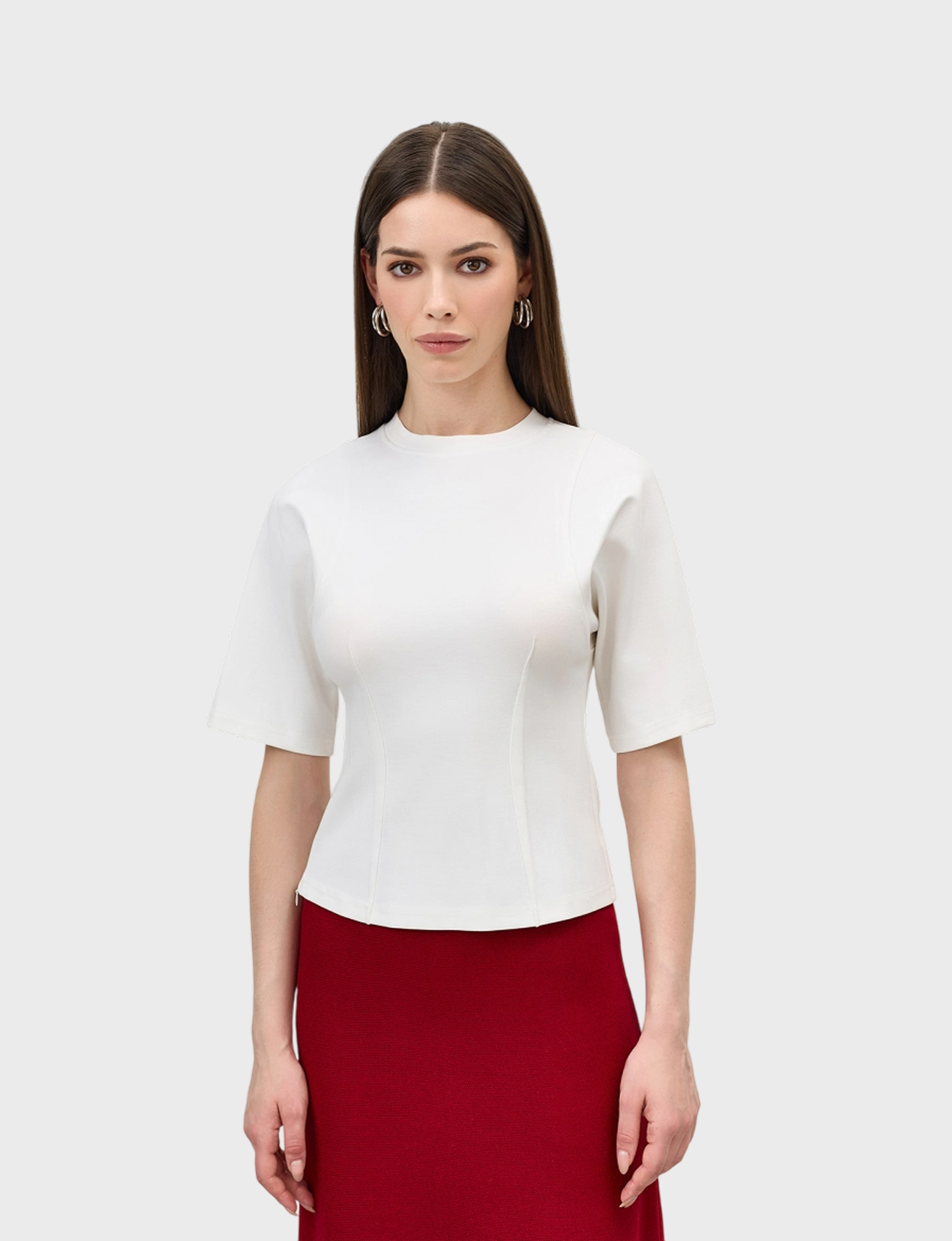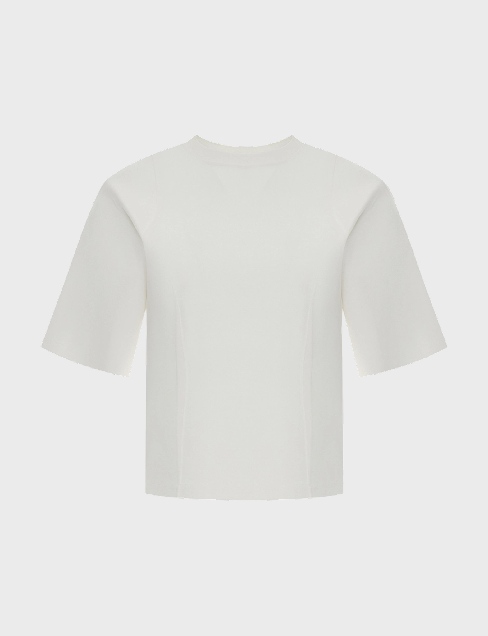 Джемпер из смесовой вискозы с рельефами на плечах. Приталенный силуэ за счет декоративных вытачек, застроченных наружу. Круглый вырез. Короткий рукав.