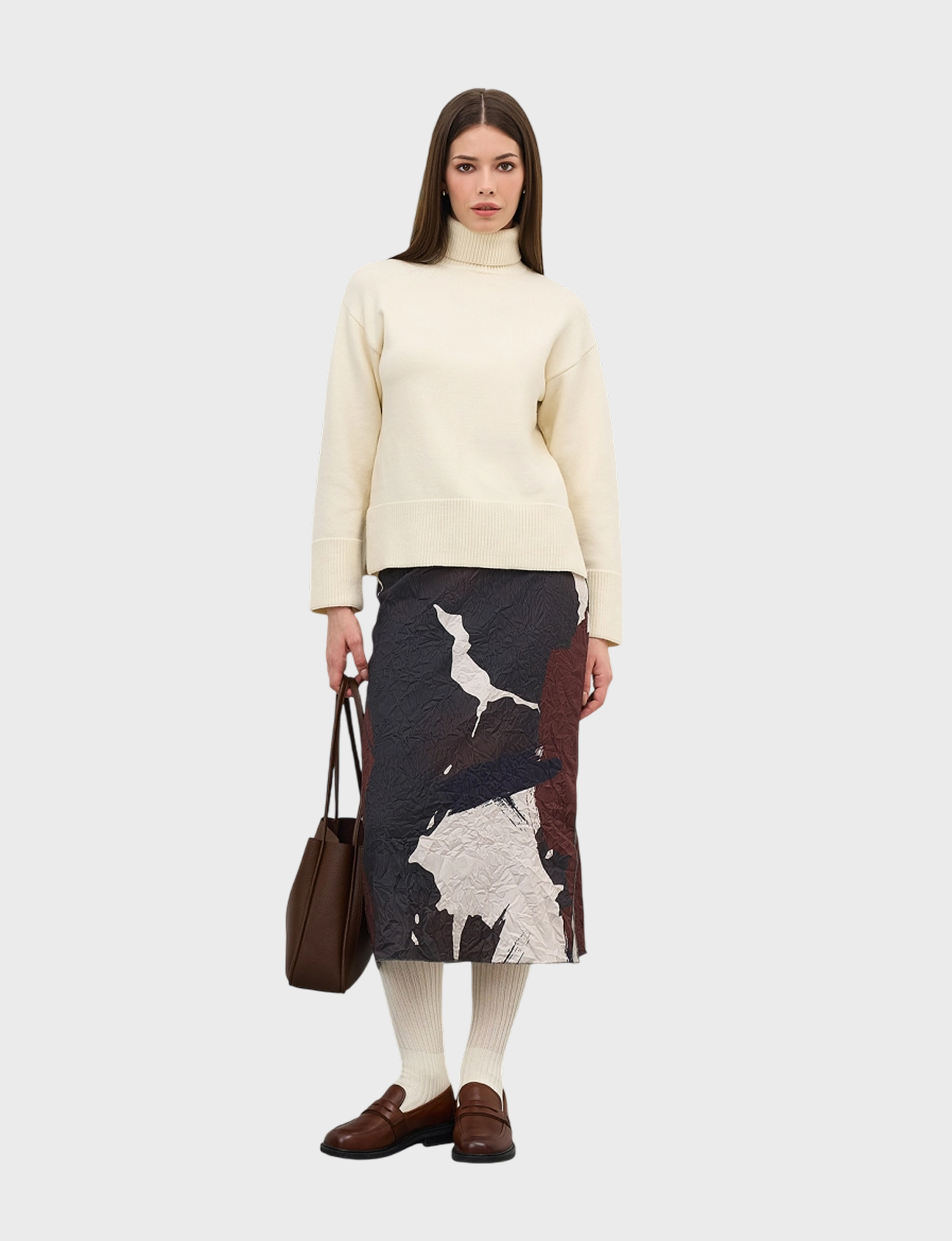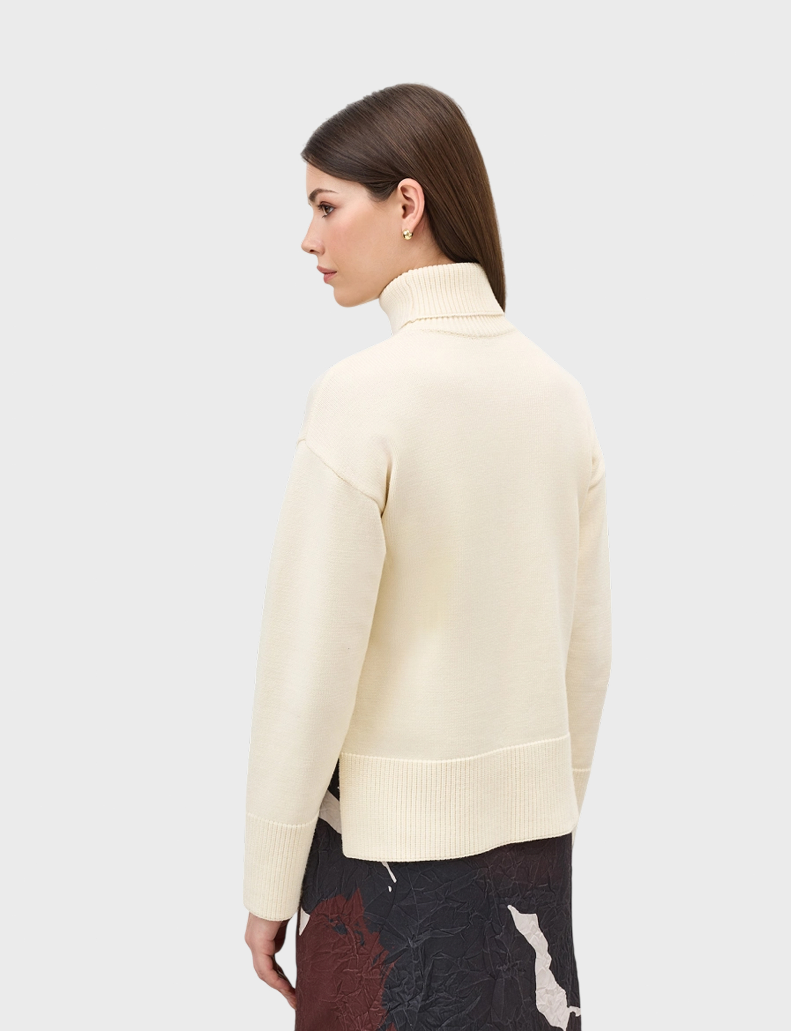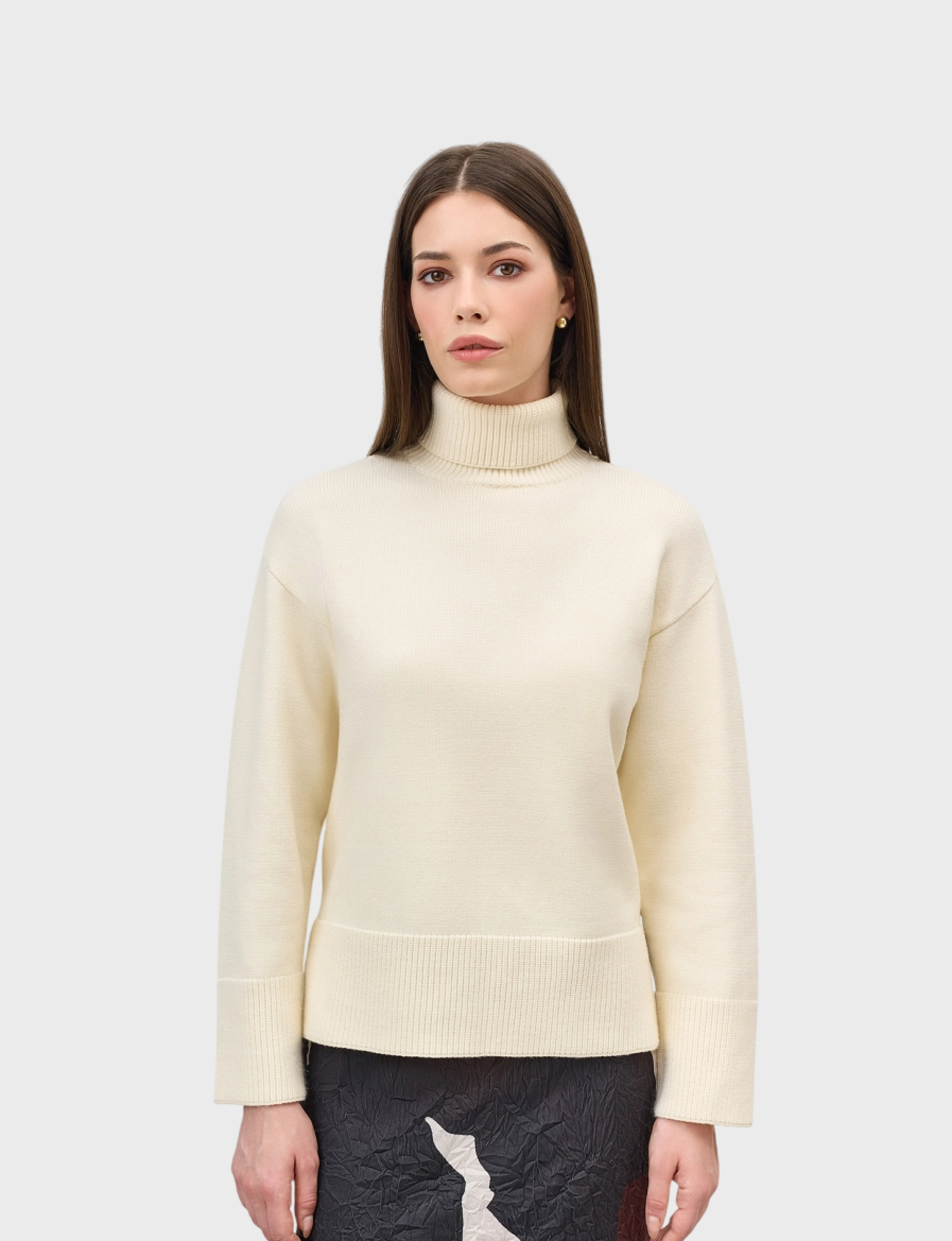 Удлиненный джемпер с высоким воротником стойкой с отворотом. Свободный силуэт. Спущенная линия плеч. Боковые разрезы в швах. Широкие манжеты по низу рукавов. В составе вискоза.