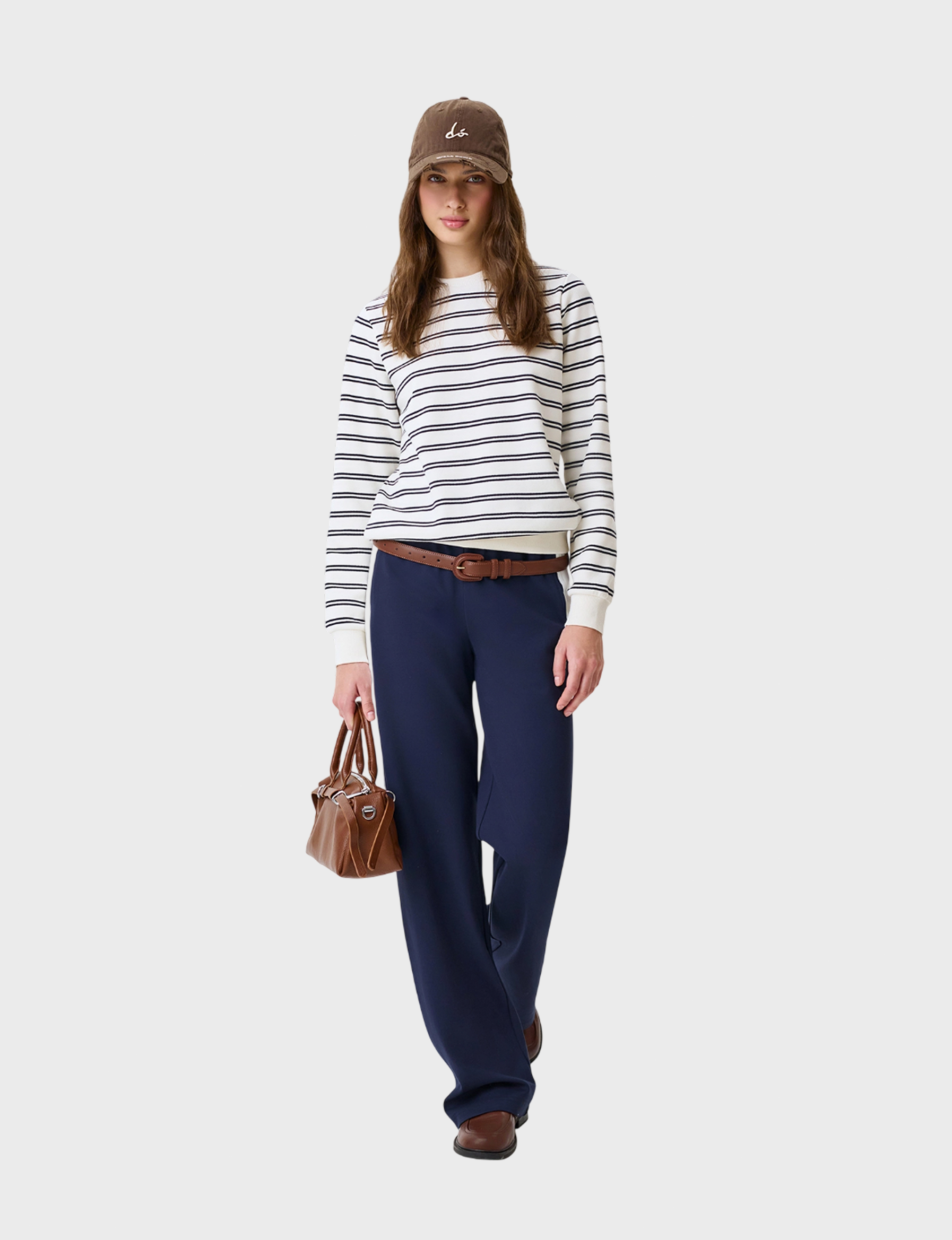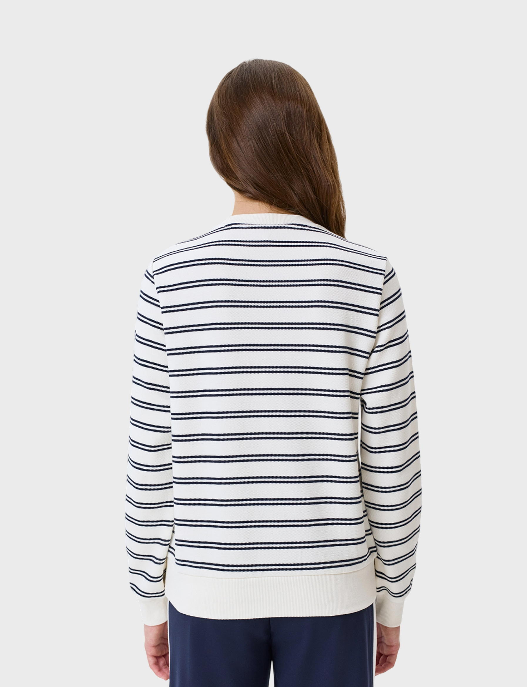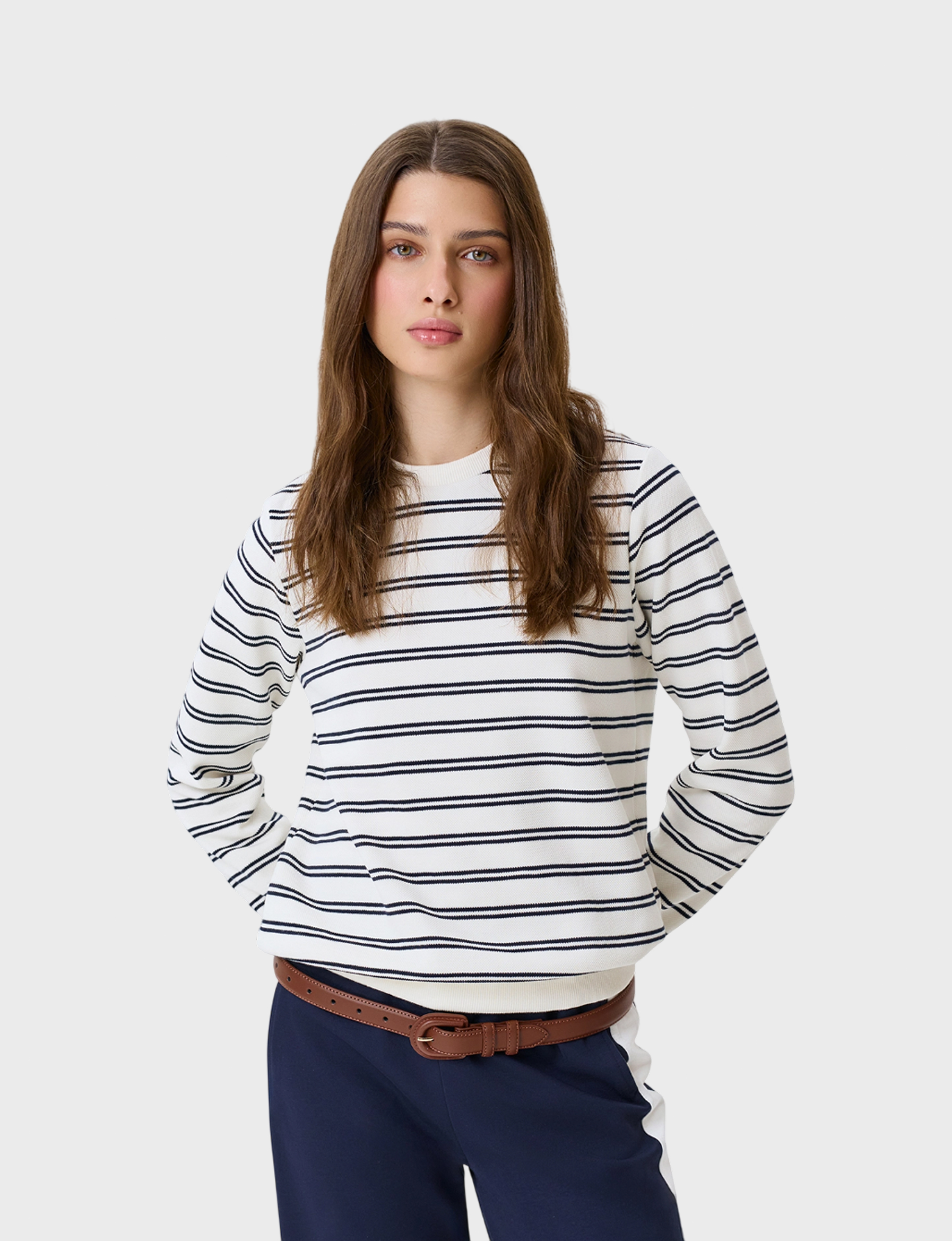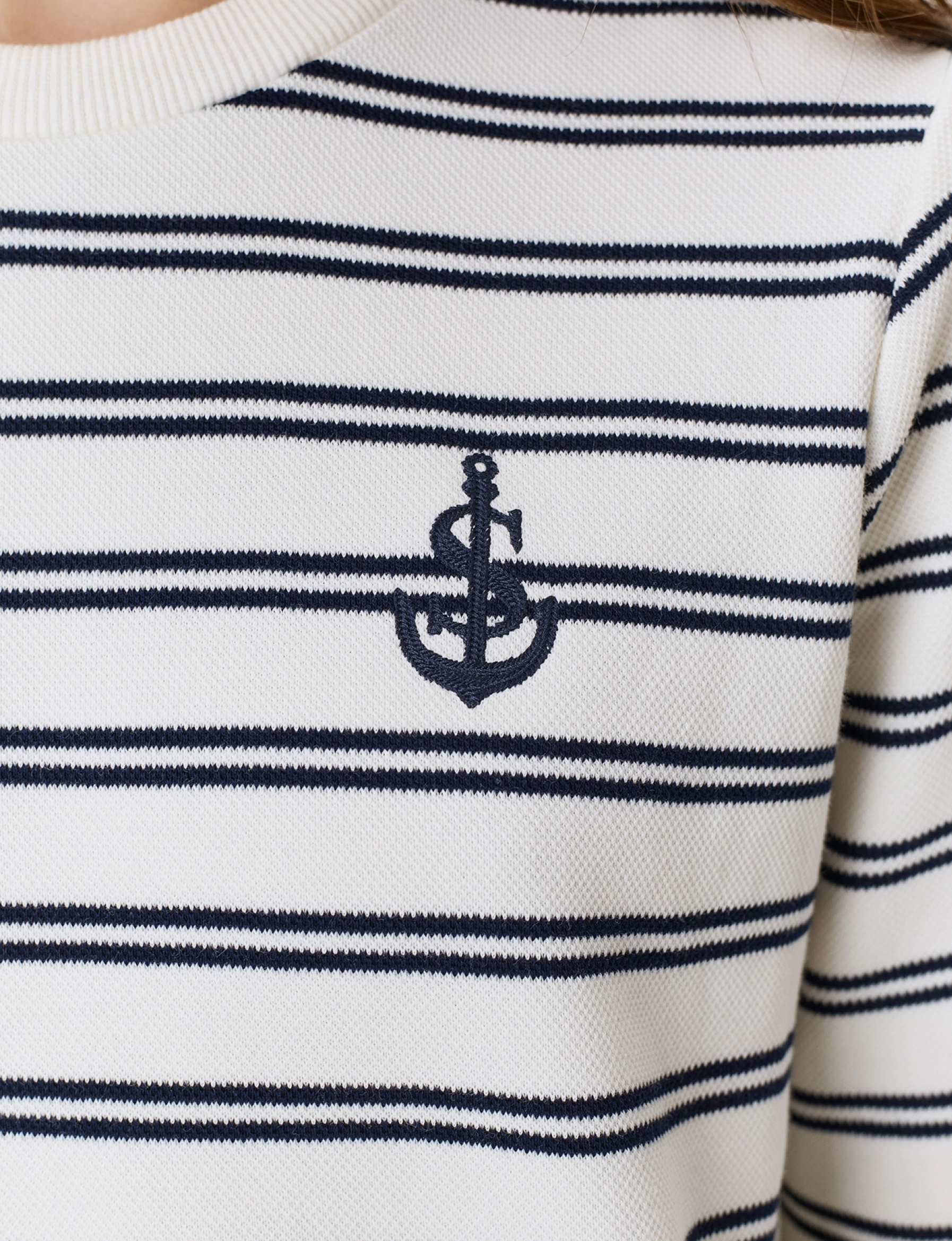 Свободный джемпер в тонкую контрастную полоску. Спущенная линия плеч. Круглый вырез. Риб по горловине, низу изделия и рукавов. Дополнен деликатной вышивкой. В составе хлопок.
