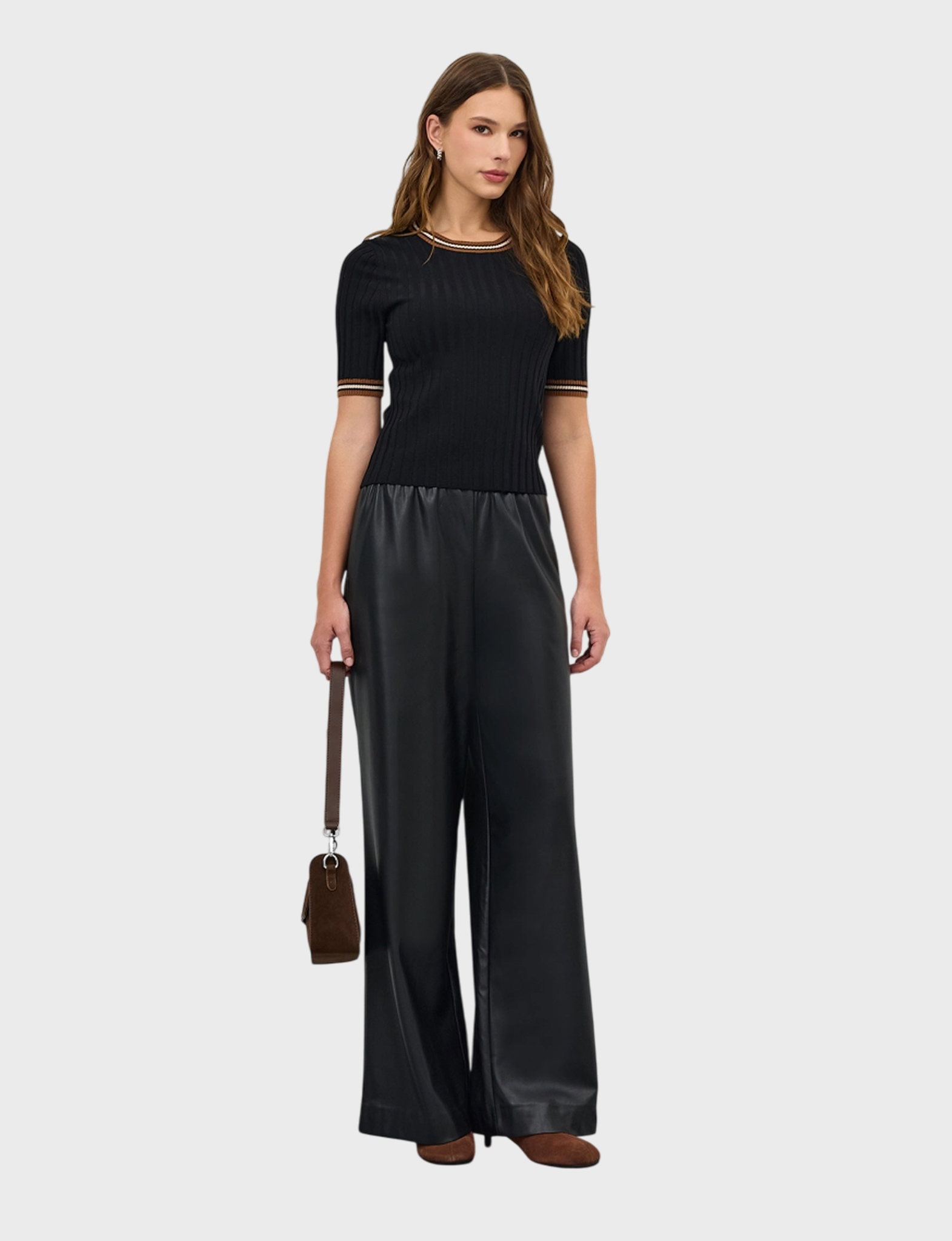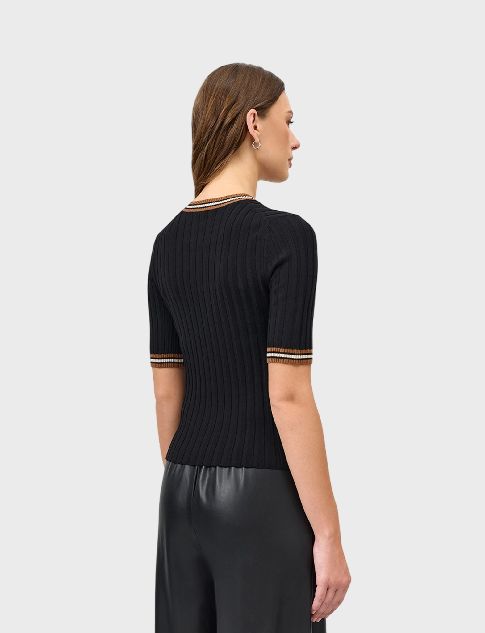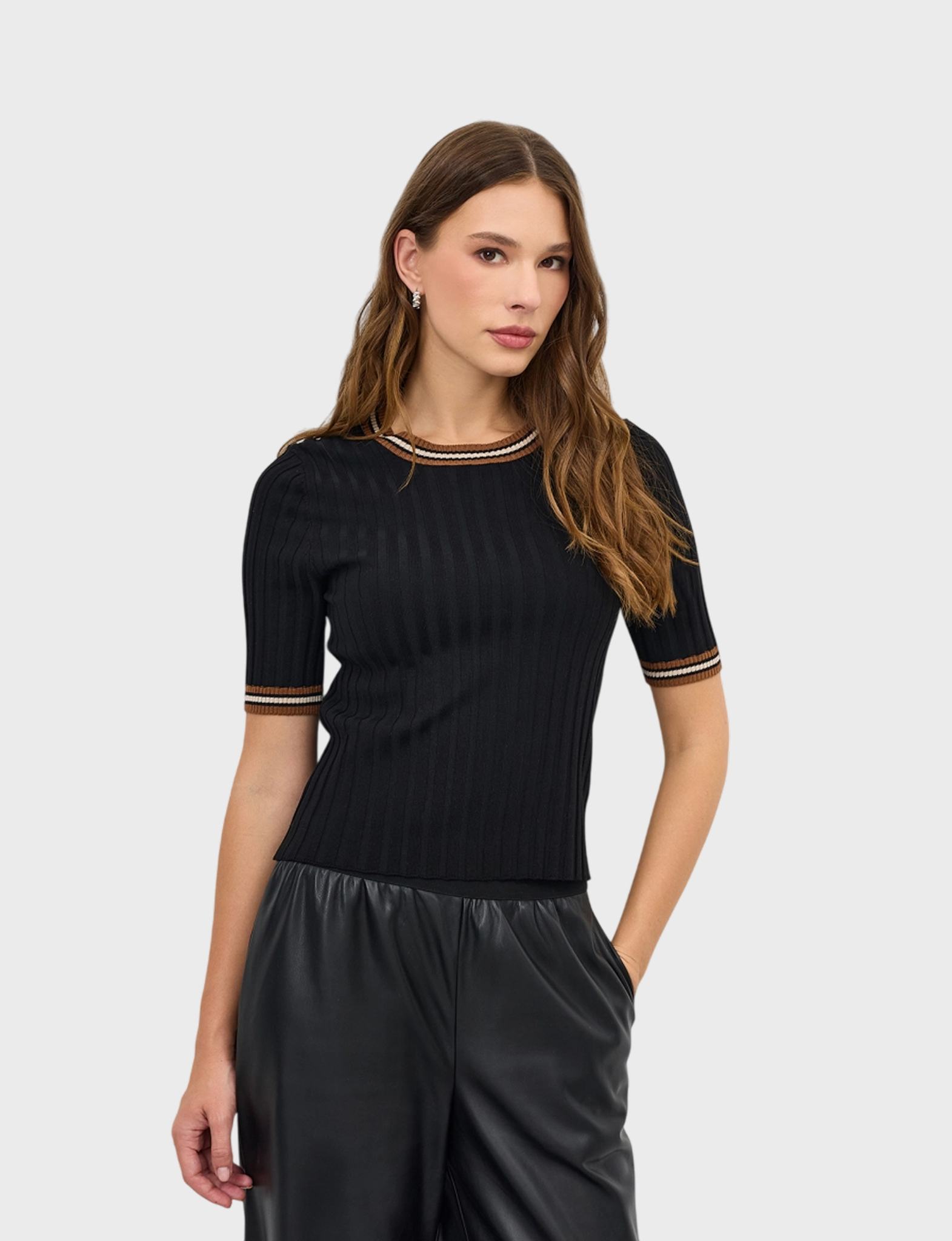 Укороченный джемпер с контрастным рибом по горловине и низу рукавов. Прилегающий силуэт. Круглый вырез. Укороченные рукава с контрастной отделкой по низу.