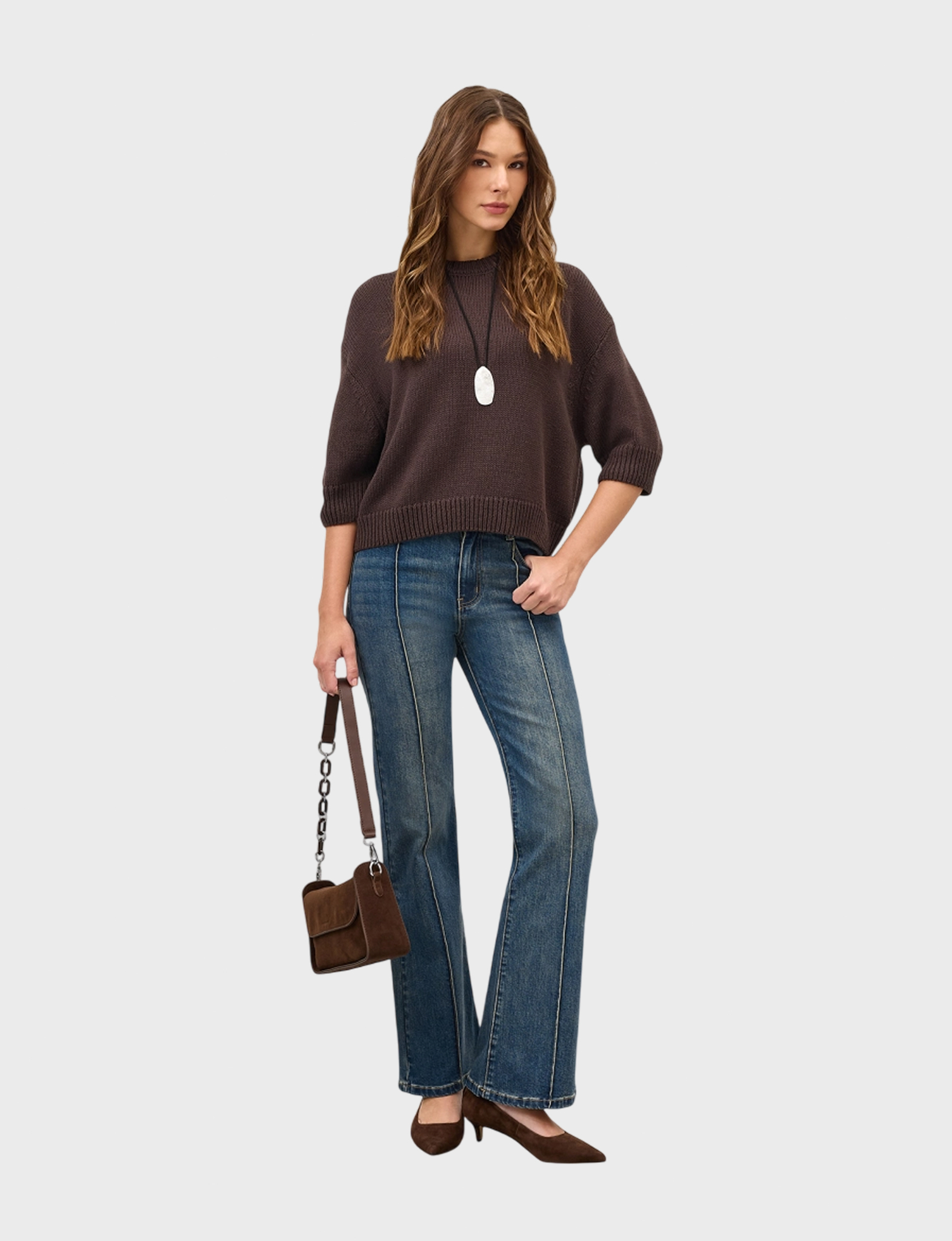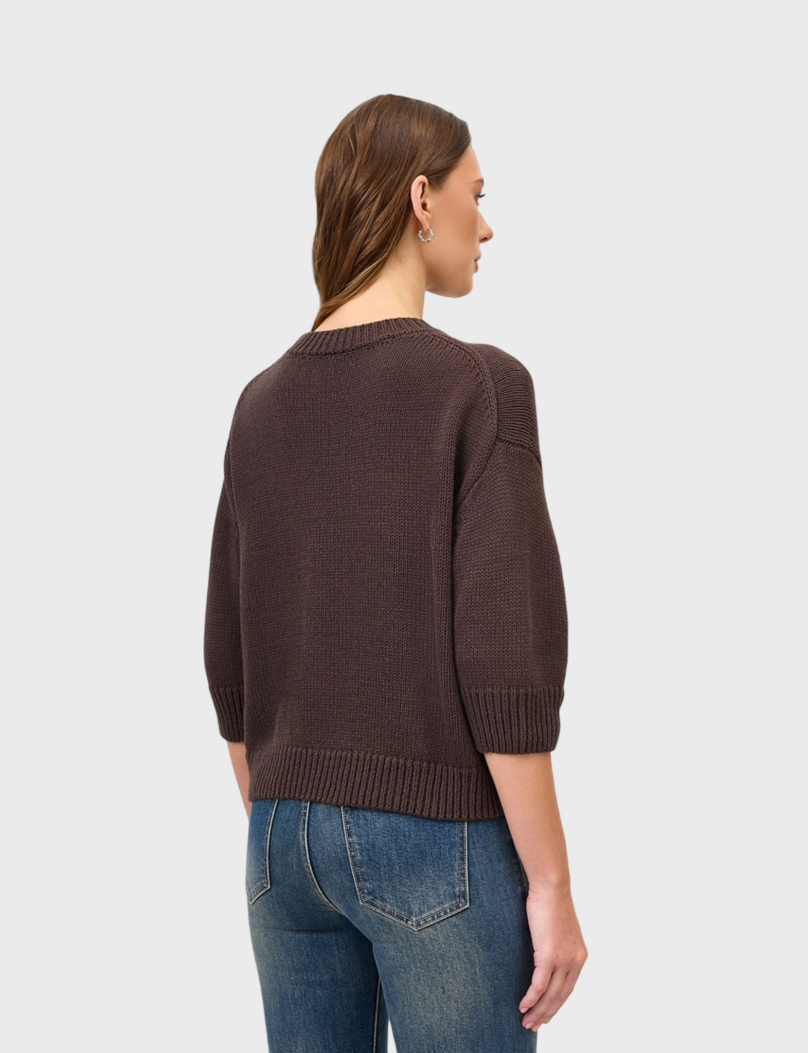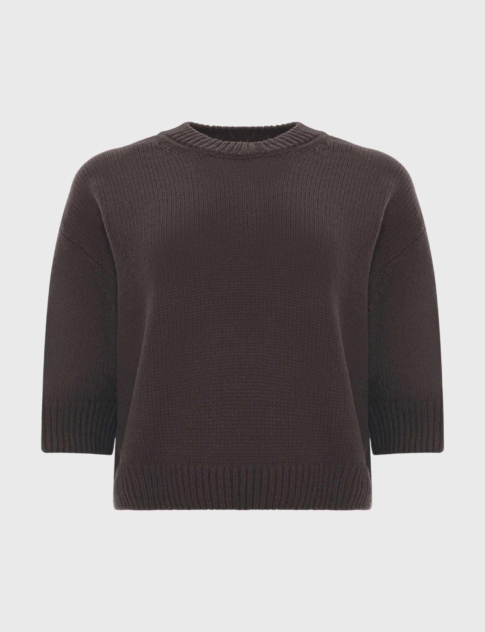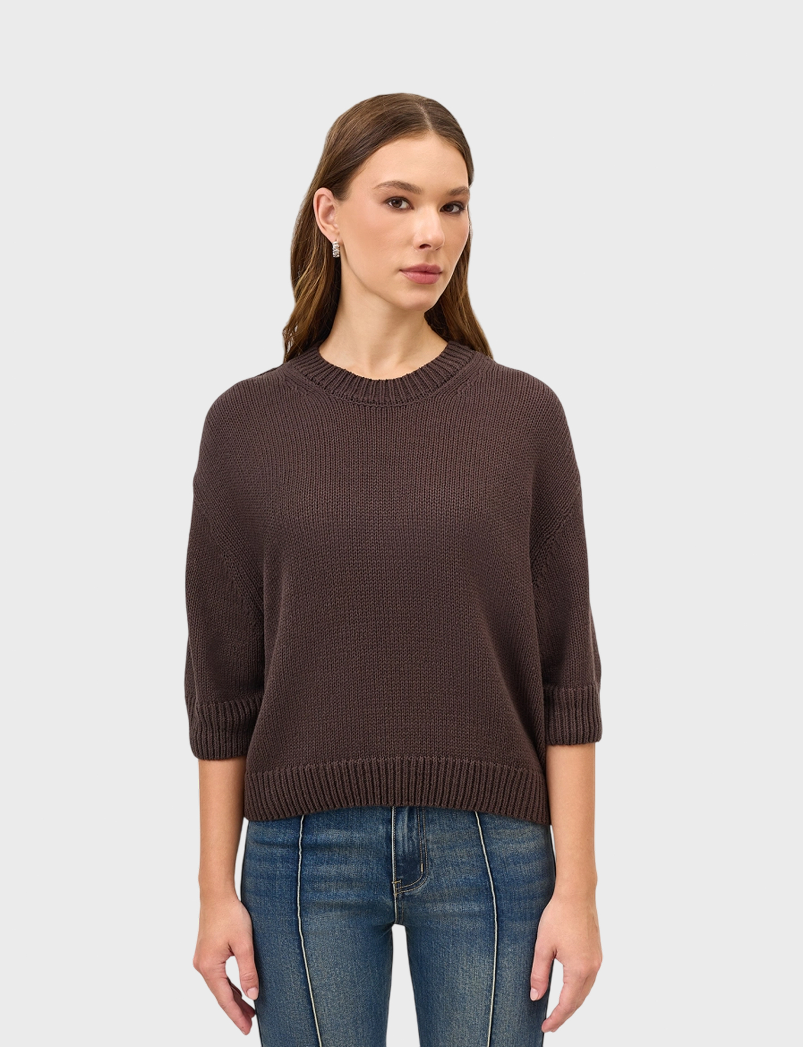Укороченный свитер свободного силуэта. Рукава 3/4. Круглый вырез. Спущенная линия плеч. В составе хлопок.