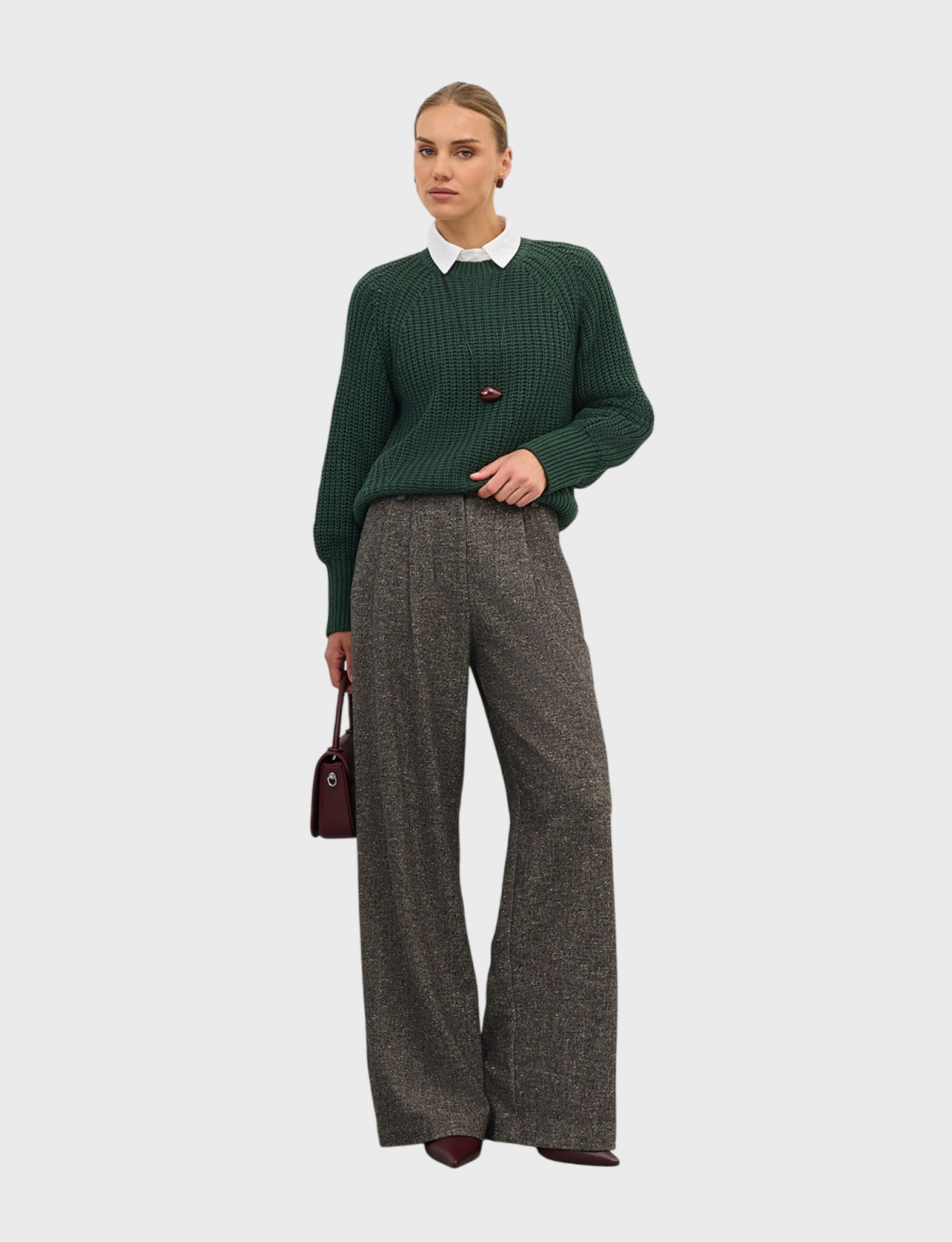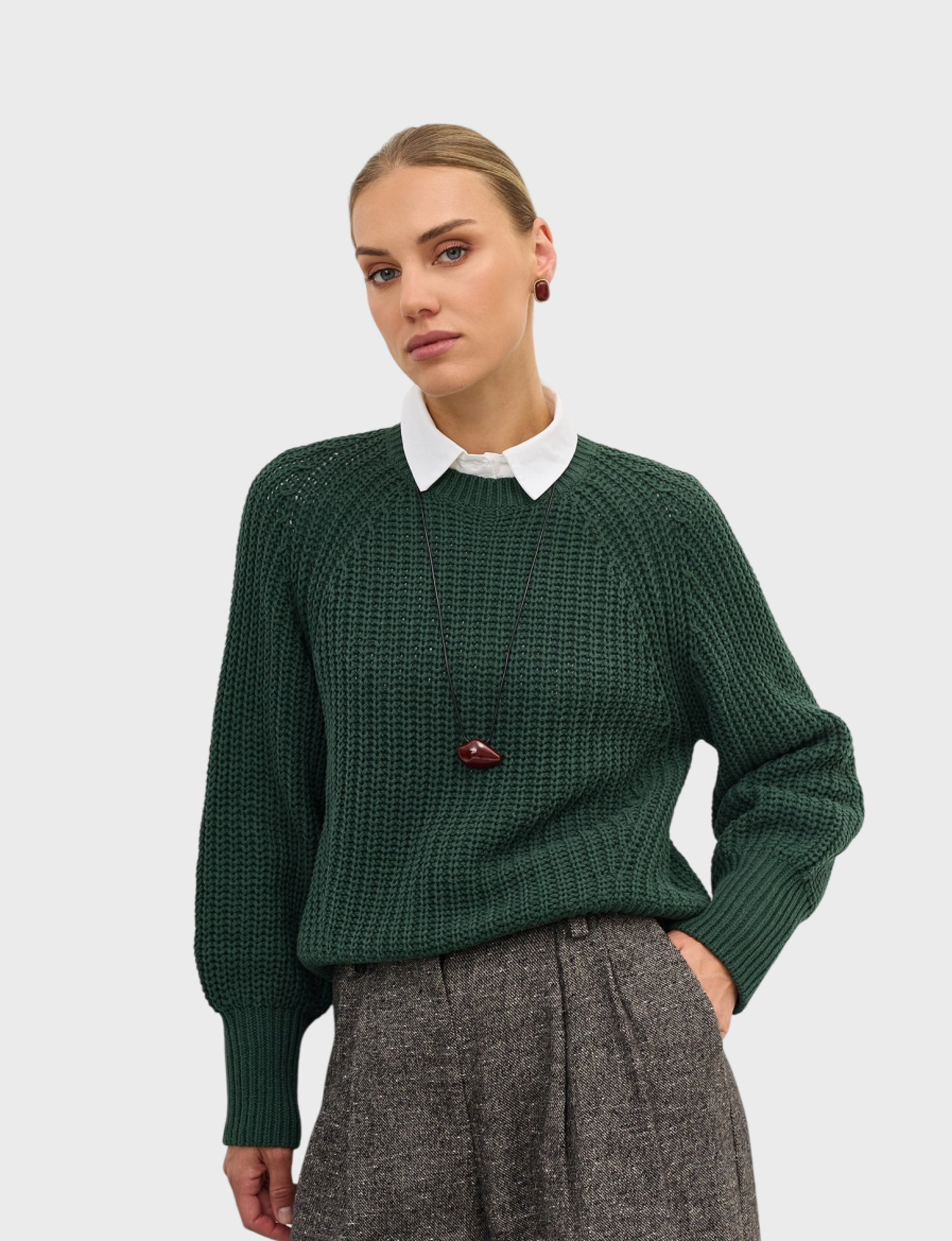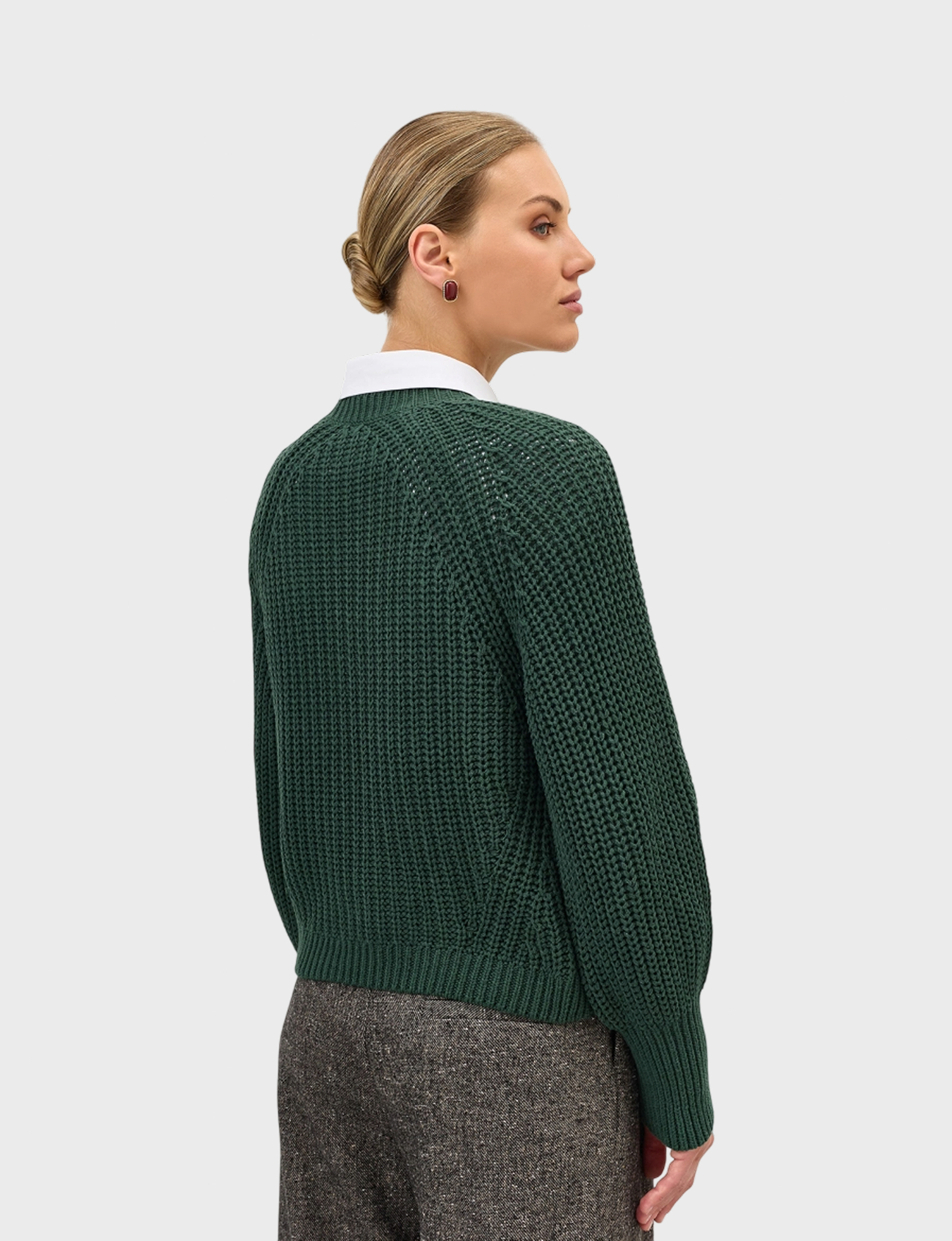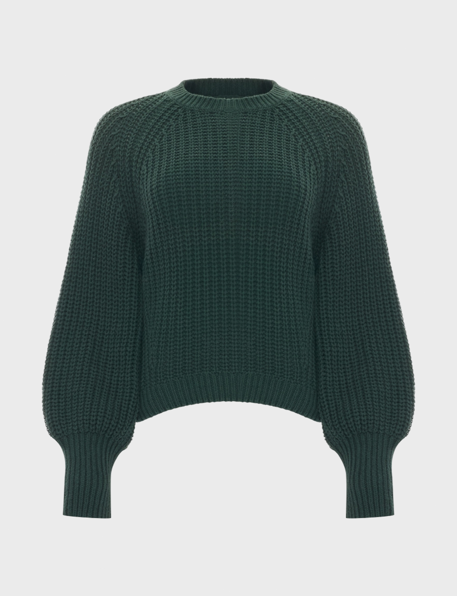 Объемный свитер крупной вязки из смесового хлопка. Свободный силуэт. Круглый вырез. Объемные длинные рукава реглан. Манжеты по низу рукавов.