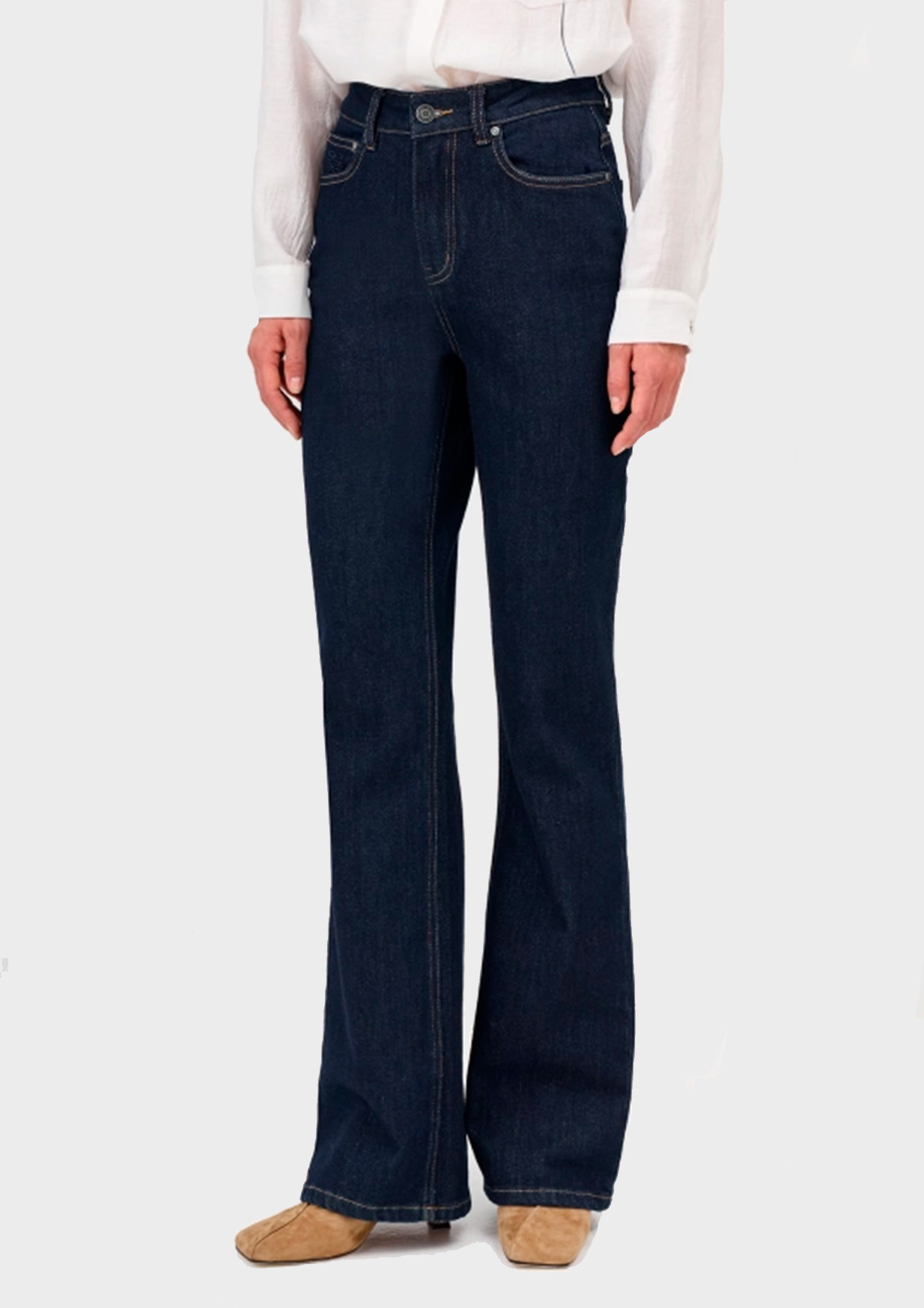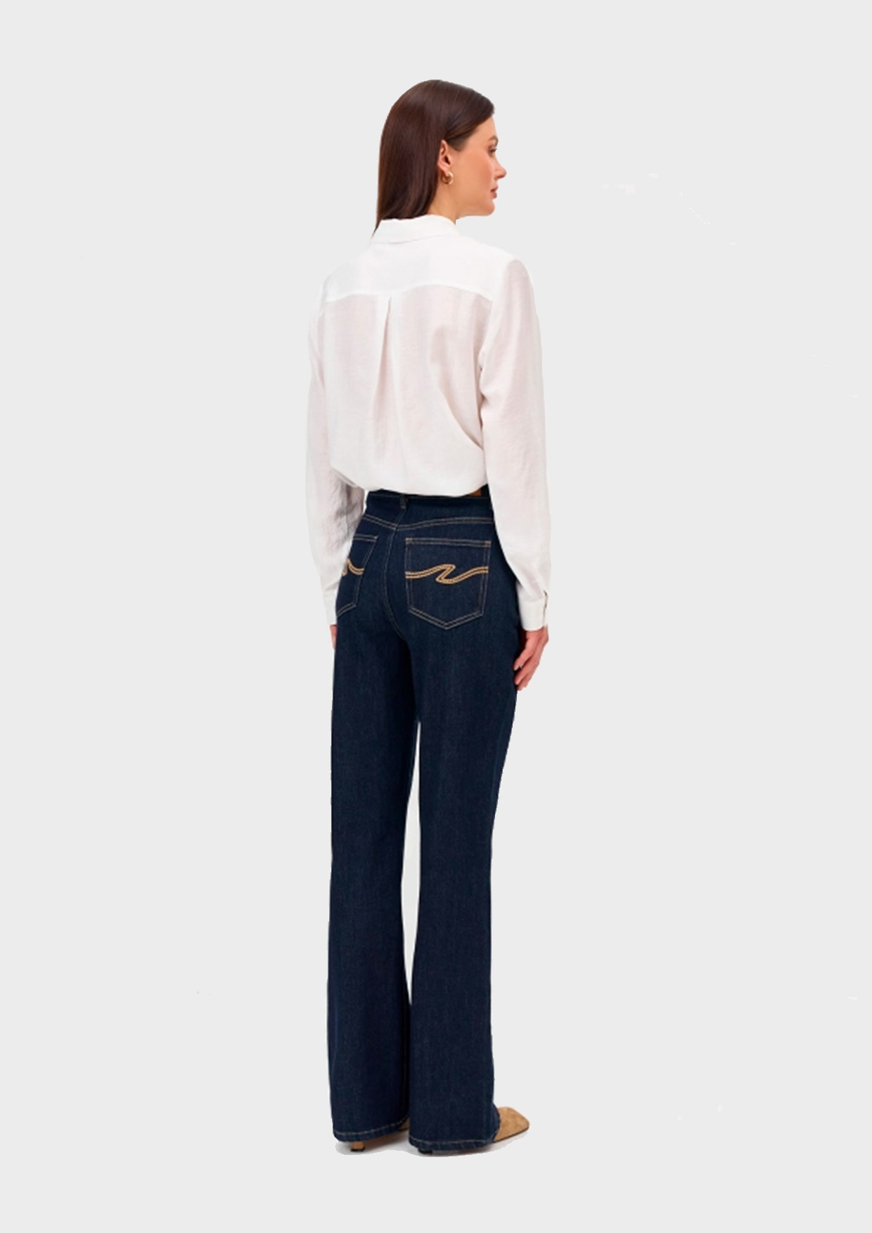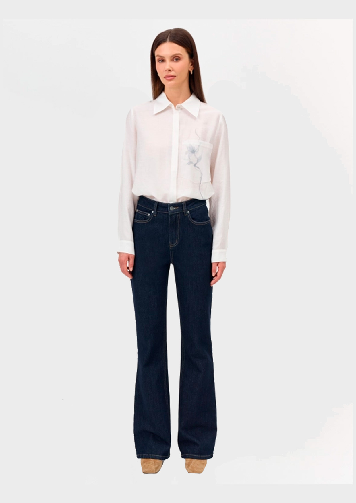 Базовые синие джинсы Bootcut. Прямой силуэт слегка расширен к низу. Застежка на молнию и металлическую пуговицу. Пять карманов. Контрастная вышивка на задних карманах. В составе спандекс.