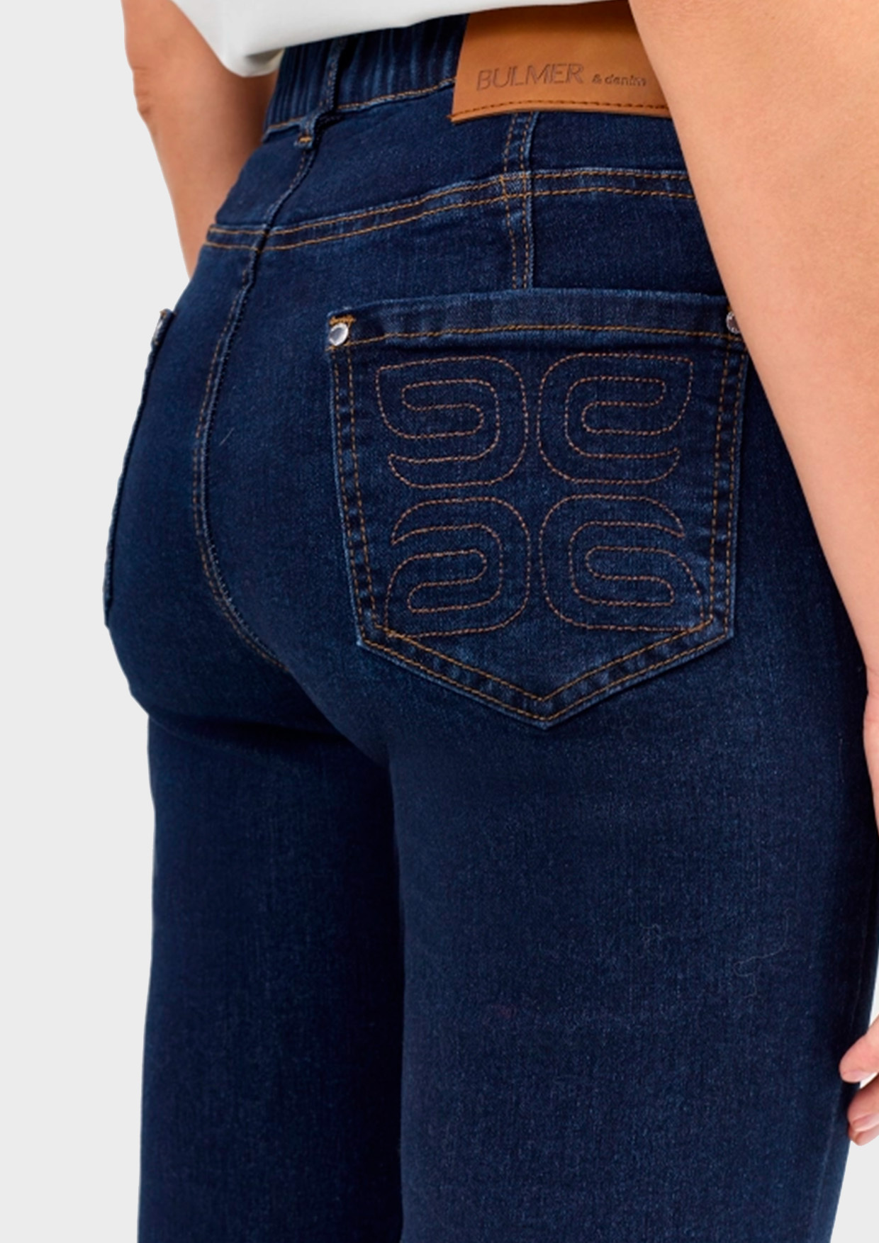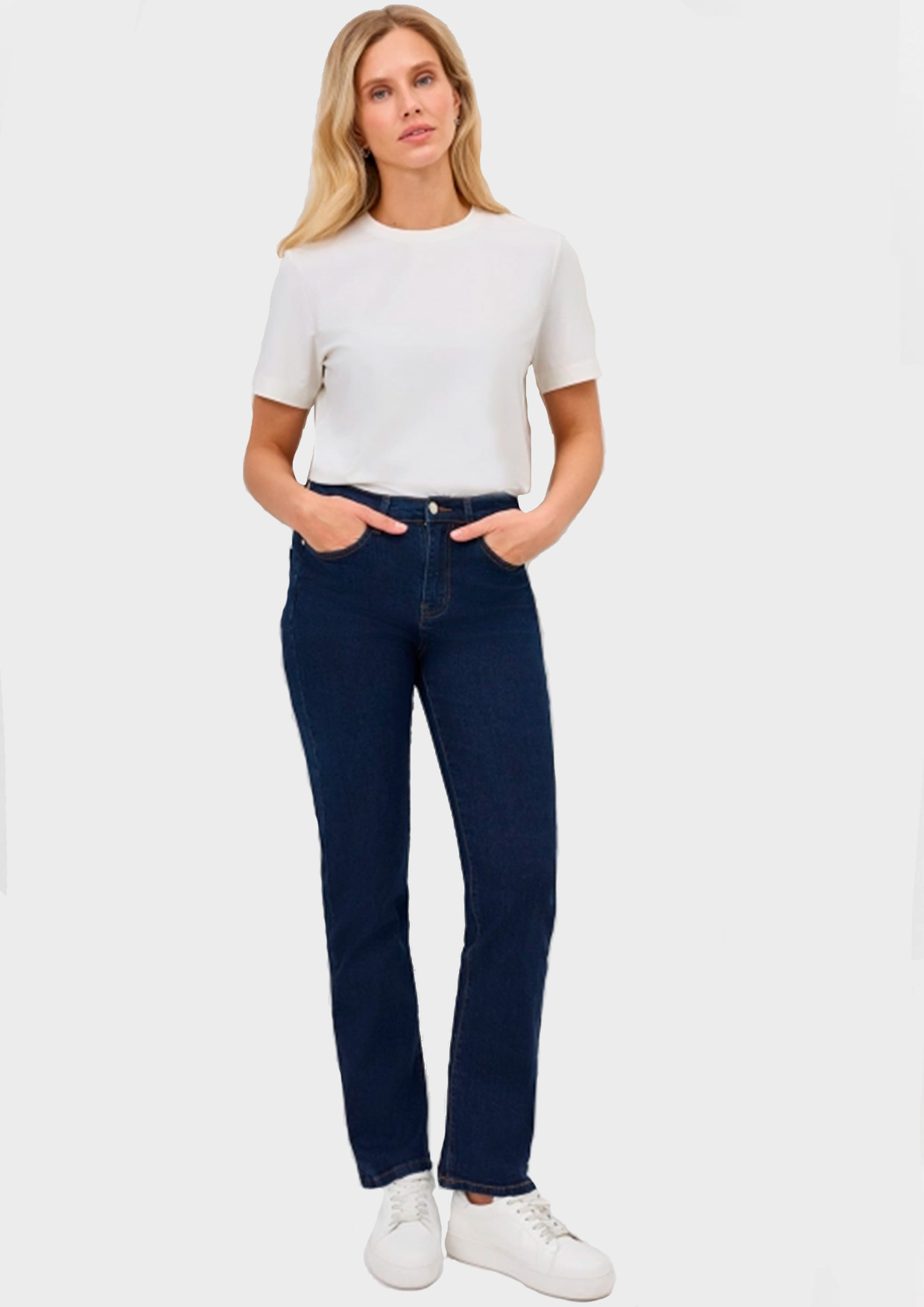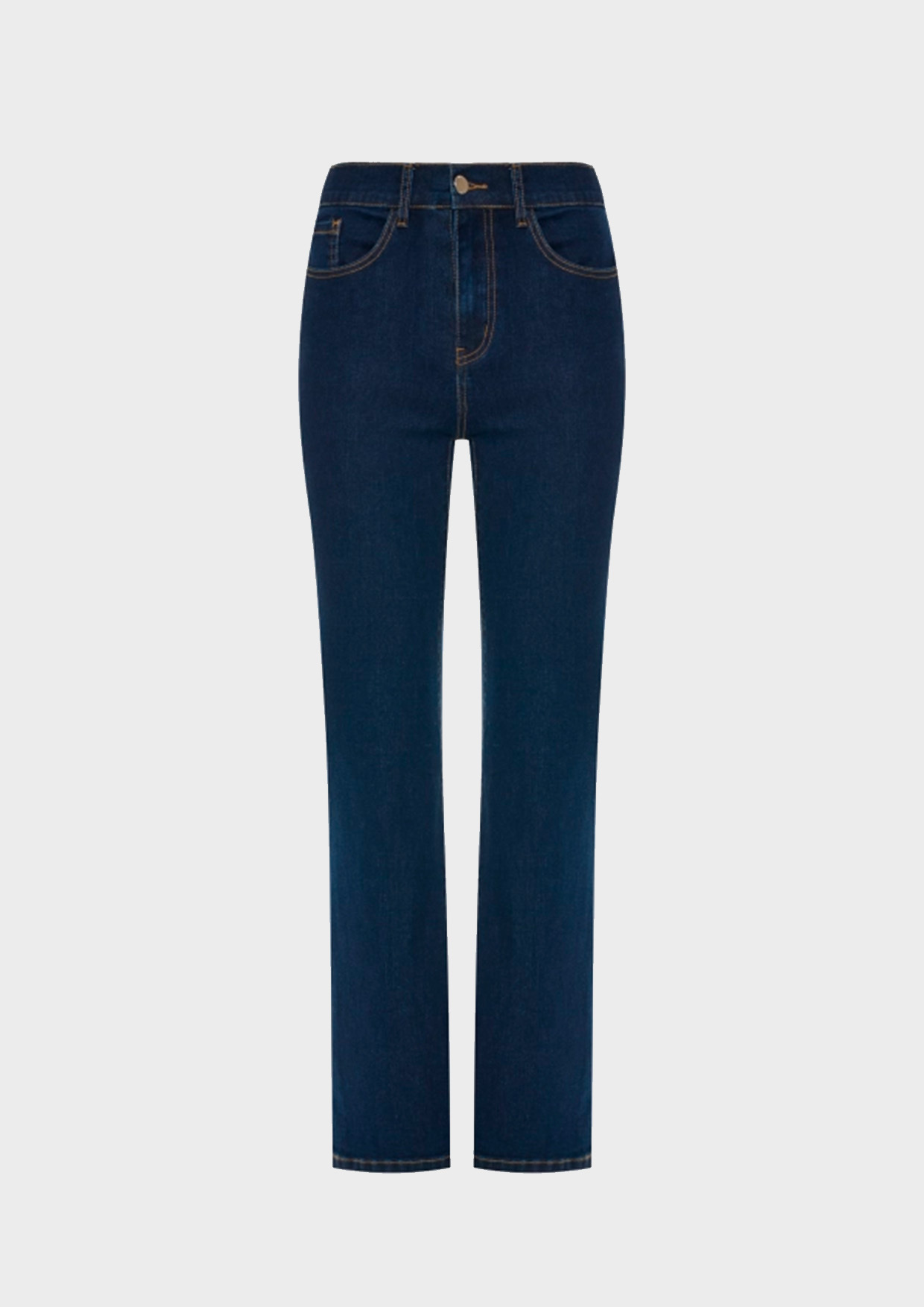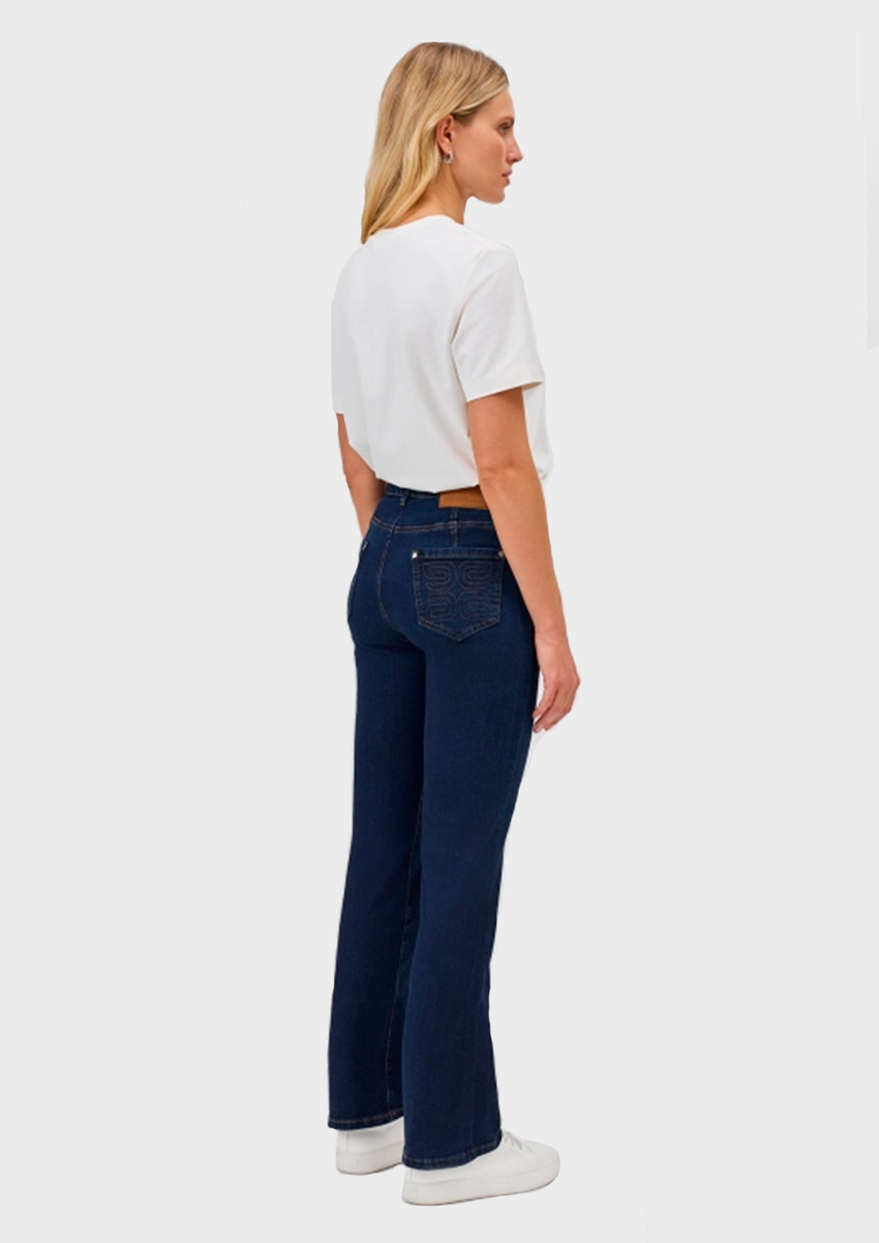 Классические прямые джинсы из эластичного денима. Застежка на молнию и металлическую пуговицу. Пять карманов. Классическая контрастная строчка. Деликатная вышивка на заднем кармане.