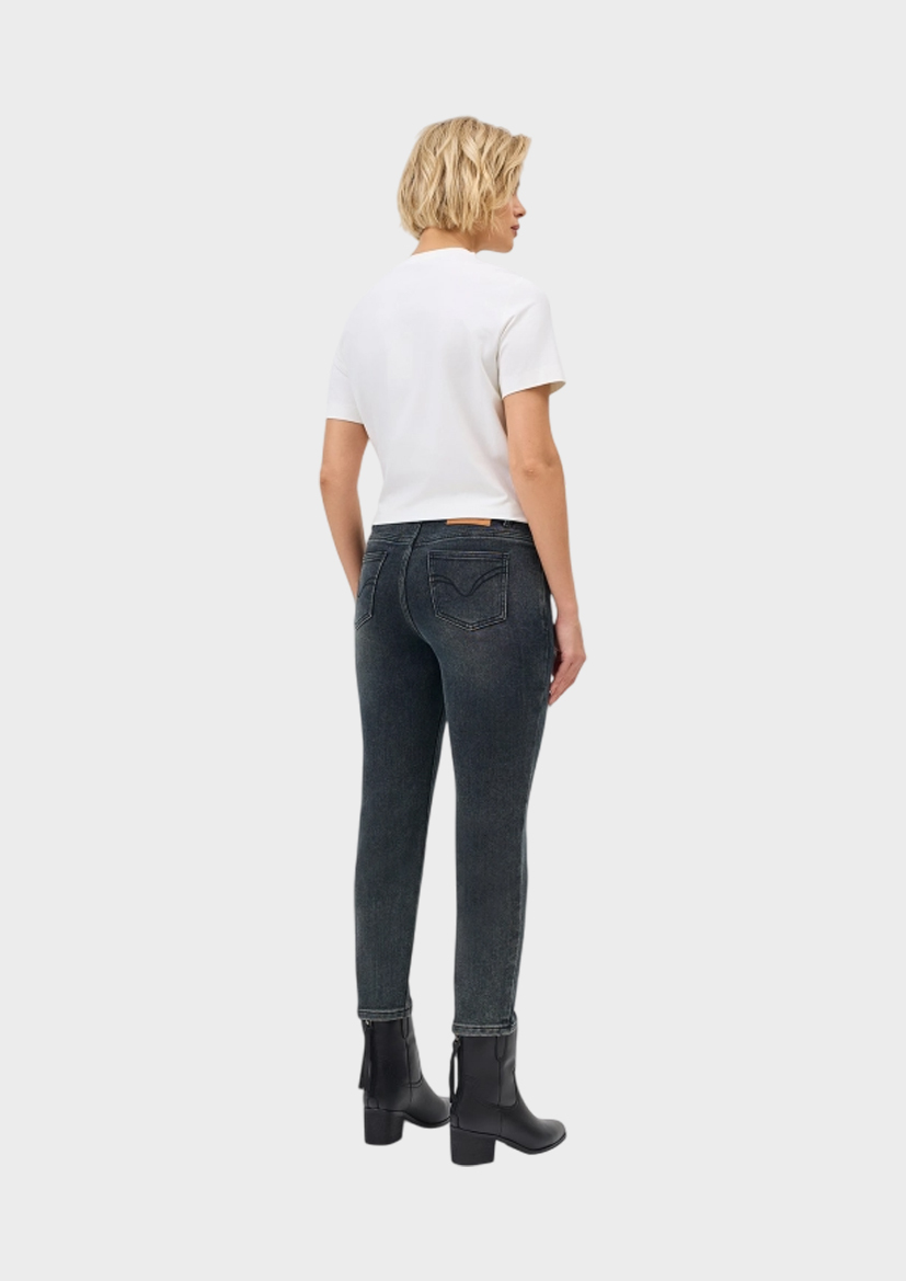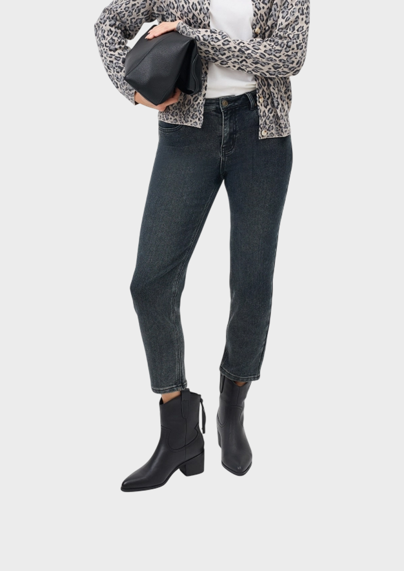 Графитовые джинсы из комфортного высокоэластичного денима с деликатной варкой. Особое переплетение нитей ткани придает дополнительный комфорт и лучшую посадку на фигуре. Прямой силуэт заужен к низу. Застежка на молнию и металлическую пуговицу. Пять карманов. В составе спандекс и район.
