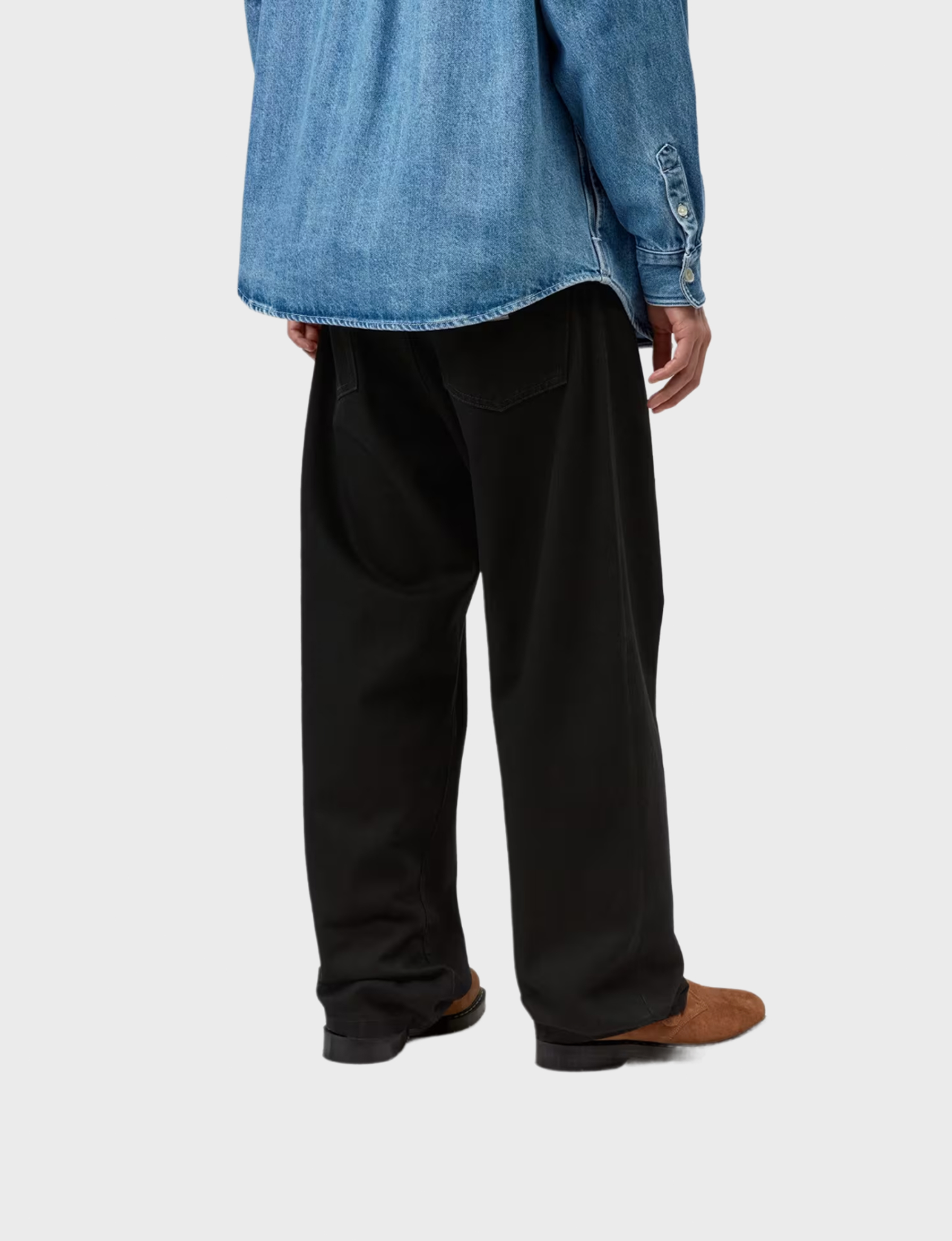Джинсы Landon изготовлены из плотной хлопковой саржи и имеют свободный зауженный крой с широкой верхней частью штанин, которая сужается ниже колена. Модель с пятью карманами дополнена тканевой квадратной этикеткой сзади.