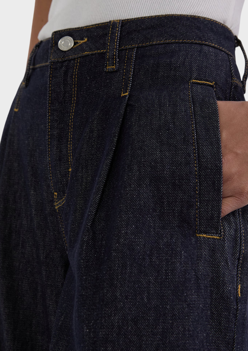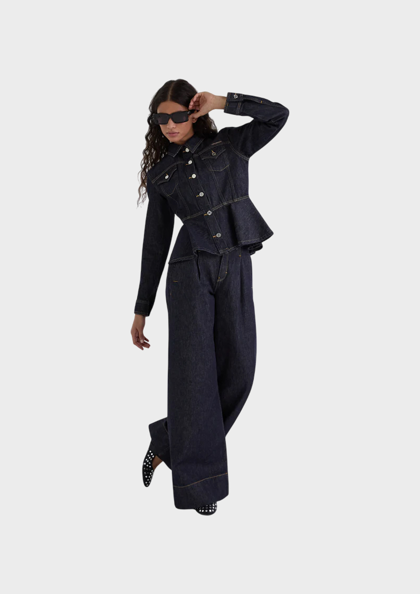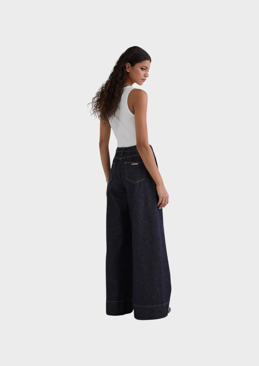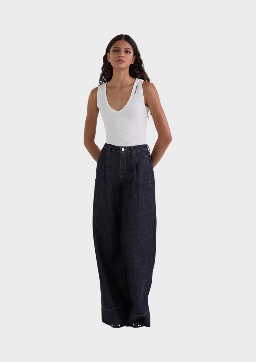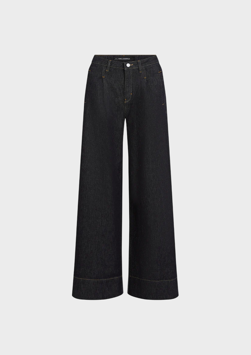 Эффектные джинсы с широкими штанинами — это идеальное сочетание повседневного комфорта и смелого дизайна. Модель отличается высокой посадкой, которая выгодно подчёркивает фигуру и создаёт безупречный силуэт.
