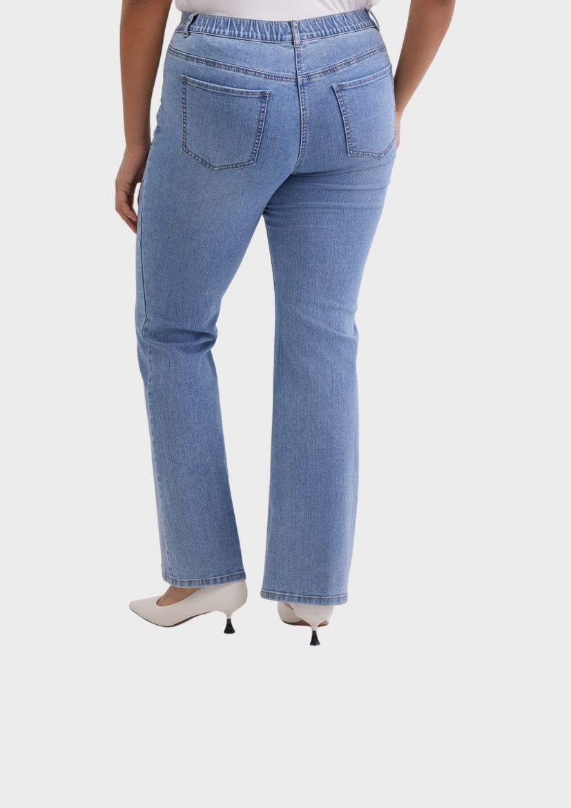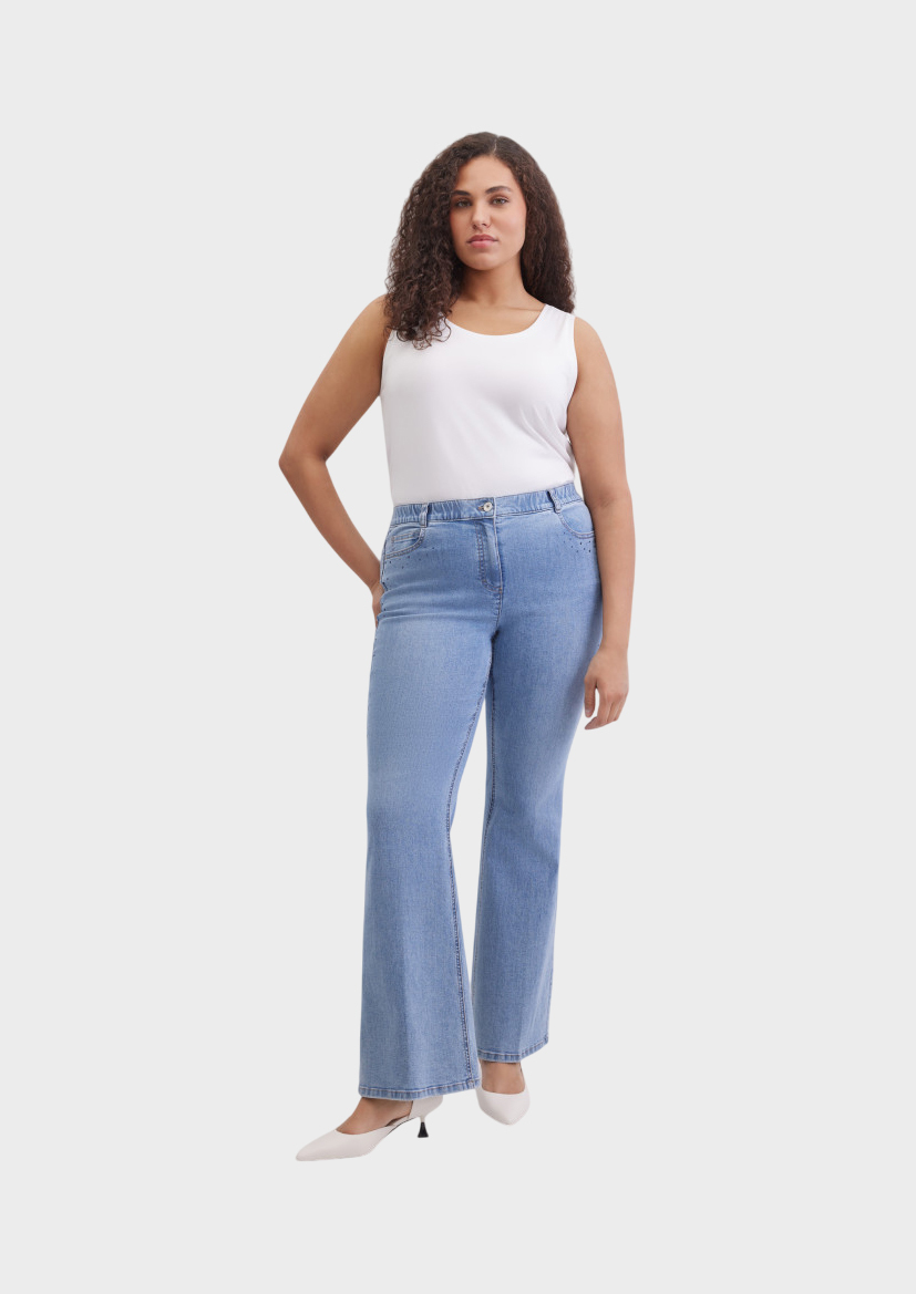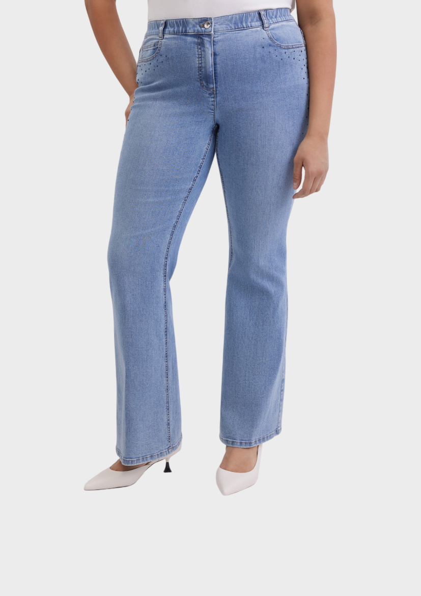 Джинсы расклешенные BettyJeans полуприлегающего кроя, выполнены из эластичного смесового хлопка с добавлением вискозы. Модель с застёжкой на молнию, пуговицы и эластичную вставку в поясе для комфортной посадки. Оснащены отрезными карманами спереди, накладными карманами сзади, кокеткой, украшены стразами и оформлены варёным эффектом. Современный вариант с акцентом на детали для повседневных образов.